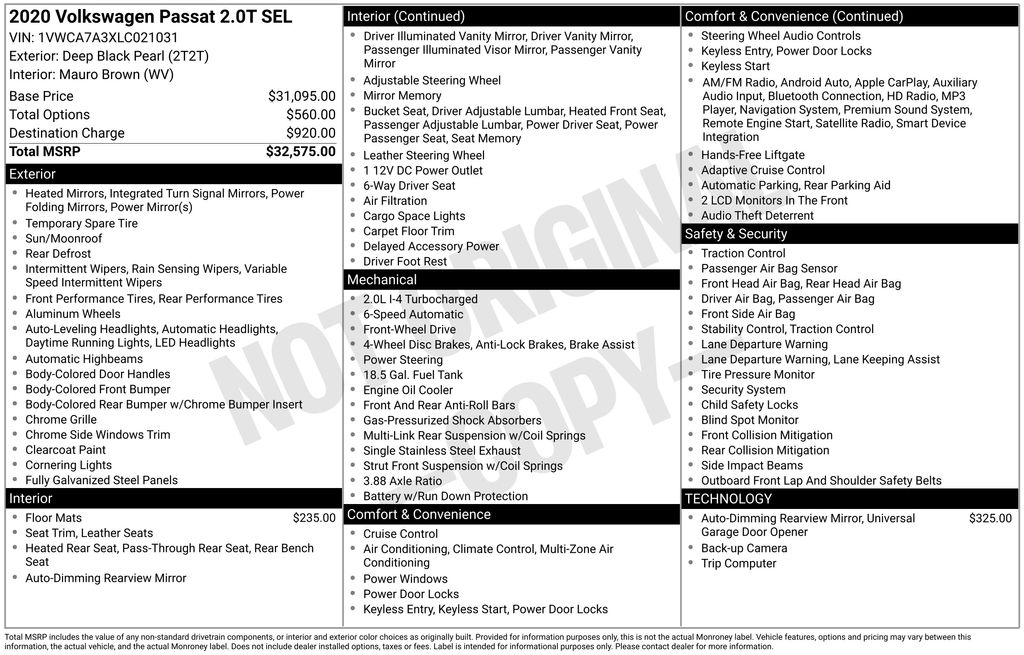 2020 Volkswagen Passat 2.0T SEL Certified. Deep Black 2.0T SEL FWD 6-Speed Automatic with Tiptronic 2.0L I4 TSI Turbocharged Volkswagen Certified, Mauro Brown Leather, 4-Wheel Disc Brakes, 9 Speakers, ABS brakes, Active Blind Spot Monitor, Air Conditioning, Alloy wheels, AM/FM radio: SiriusXM, Auto High-beam Headlights, Auto-dimming Rear-View mirror, Automatic temperature control, Brake assist, Bumpers: body-color, Delay-off headlights, Driver door bin, Driver vanity mirror, Dual front impact airbags, Dual front side impact airbags, Electronic Stability Control, Exterior Parking Camera Rear, Four wheel independent suspension, Frameless Auto-Dimming Rearview Mirror, Front anti-roll bar, Front Bucket Seats, Front Center Armrest, Front dual zone A/C, Front reading lights, Fully automatic headlights, Heated door mirrors, Heated Front Comfort Sport Seats, Heated front seats, Heated rear seats, Illuminated entry, Leather Shift Knob, Leather steering wheel, Low tire pressure warning, Memory seat, Monster Mats Rubber Mats Kit (Set of 4), Navigation System, Occupant sensing airbag, Outside temperature display, Overhead airbag, Overhead console, Panic alarm, Passenger door bin, Passenger vanity mirror, Perforated Vienna Leather Seating Surfaces, Power door mirrors, Power driver seat, Power moonroof, Power passenger seat, Power steering, Power windows, Radio data system, Radio: Discover Media w/Touchscreen Navigation, Rain sensing wipers, Rear anti-roll bar, Rear reading lights, Rear seat center armrest, Rear window defroster, Remote keyless entry, Security system, Speed control, Speed-sensing steering, Split folding rear seat, Steering wheel mounted audio controls, Tachometer, Telescoping steering wheel, Tilt steering wheel, Traction control, Trip computer, Turn signal indicator mirrors, Variably intermittent wipers, VW App-Connect (w/Apple CarPlay, Android Auto & MirrorLink), Wheels: 18" x 8J 5-Spoke 2-Tone Machined Alloy, Mauro Brown Leather.
