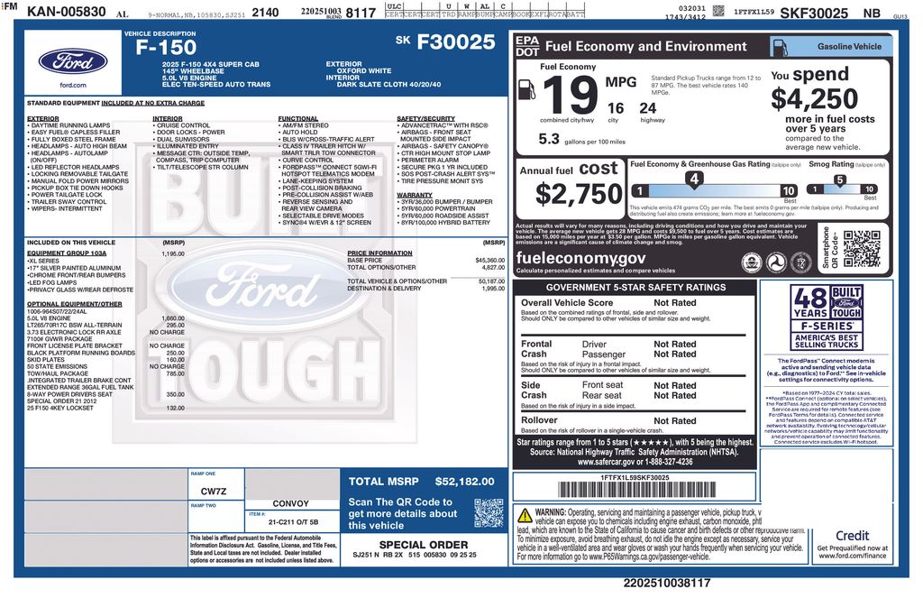 Oxford White 2025 Ford F-150 XL FLT 4WD 10-Speed Automatic 5.0L V8 4WD, 4-Wheel Disc Brakes, 6 Speakers, ABS brakes, Air Conditioning, AM/FM radio: SiriusXM with 360L, Auto High-beam Headlights, Black Platform Running Boards, Brake assist, Cloth 40/20/40 Front Seat, Compass, Delay-off headlights, Driver door bin, Dual front impact airbags, Dual front side impact airbags, Electronic Stability Control, Emergency communication system: SYNC 4 911 Assist, Front anti-roll bar, Front Center Armrest, Front License Plate Bracket, Front reading lights, Front wheel independent suspension, Fully automatic headlights, GVWR: 6,550 lbs Payload Package, Heated door mirrors, Illuminated entry, Integrated Trailer Brake Controller, Low tire pressure warning, Occupant sensing airbag, Outside temperature display, Overhead airbag, Overhead console, Panic alarm, Passenger door bin, Passenger vanity mirror, Power door mirrors, Power steering, Power windows, Radio data system, Radio: AM/FM Stereo w/SiriusXM 360L, Rear Parking Sensors, Rear step bumper, Remote keyless entry, Security system, Speed control, Split folding rear seat, Steering wheel mounted audio controls, SYNC 4 w/Enhanced Voice Recognition, Tachometer, Telescoping steering wheel, Tilt steering wheel, Tow/Haul Package, Traction control, Trip computer, Variably intermittent wipers, Voltmeter, Wheels: 17" Silver Steel, 4WD.