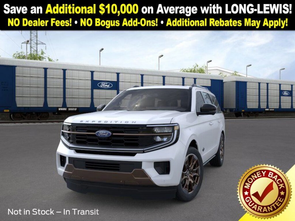 Star White Metallic Tri-Coat 2025 Ford Expedition King Ranch NFT 4WD 10-Speed Automatic EcoBoost 3.5L V6 GTDi DOHC 24V Twin Turbocharged 4WD, 22 Speakers, 3.73 Axle Ratio, 3rd row seats: split-bench, 4-Wheel Disc Brakes, ABS brakes, Adaptive suspension, Adjustable pedals, Air Conditioning, Alloy wheels, AM/FM radio: SiriusXM with 360L, Apple CarPlay/Android Auto, Auto High-beam Headlights, Auto-dimming door mirrors, Auto-dimming Rear-View mirror, Automatic temperature control, BlueCruise Equipped (1-Year Plan), Brake assist, Bumpers: body-color, Compass, Delay-off headlights, Driver door bin, Driver vanity mirror, Dual front impact airbags, Dual front side impact airbags, Electronic Stability Control, Emergency communication system: 911 Assist, Exterior Parking Camera Rear, Four wheel independent suspension, Front anti-roll bar, Front Bucket Seats, Front Center Armrest, Front dual zone A/C, Front License Plate Bracket, Front reading lights, Fully automatic headlights, Garage door transmitter, Genuine wood dashboard insert, Genuine wood door panel insert, Heated door mirrors, Heated front seats, Heated rear seats, Heated steering wheel, Heated/Vent Prem Del Rio Lthr Fr Captain's Chairs, Illuminated entry, Leather steering wheel, Low tire pressure warning, Memory seat, Navigation System, Occupant sensing airbag, Outside temperature display, Overhead airbag, Overhead console, Panic alarm, Passenger door bin, Passenger vanity mirror, Pedal memory, Power door mirrors, Power driver seat, Power moonroof: Vista Roof, Power passenger seat, Power steering, Power windows, Radio data system, Radio: B&O Unleashed Sound System by Bang & Olufsen, Rain sensing wipers, Rear air conditioning, Rear anti-roll bar, Rear reading lights, Rear window defroster, Rear window wiper, Reclining 3rd row seat, Remote keyless entry, Security system, SiriusXM w/360L, Speed control, Speed-sensing steering, Speed-Sensitive Wipers, Split folding rear seat, Spoiler, Steering wheel memory, Steering wheel mounted audio controls, Tachometer, Telescoping steering wheel, Tilt steering wheel, Traction control, Trip computer, Turn signal indicator mirrors, Variably intermittent wipers, Ventilated front seats, Voltmeter, Wheels: 22" Sinister Brown w/Diamond Cut Face Alum, 4WD.