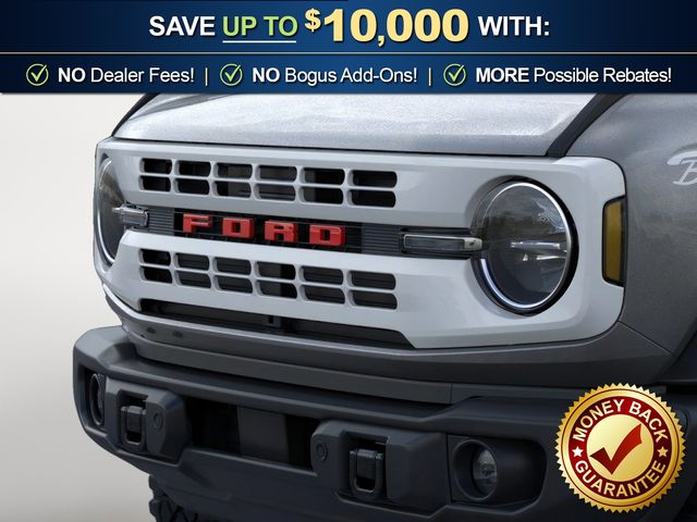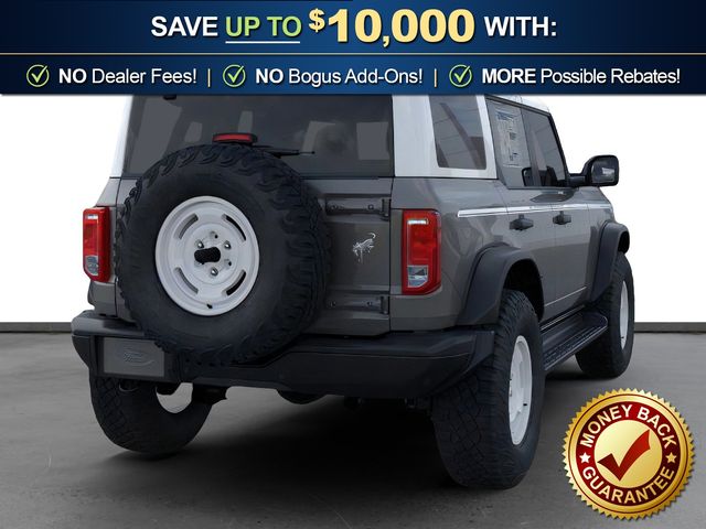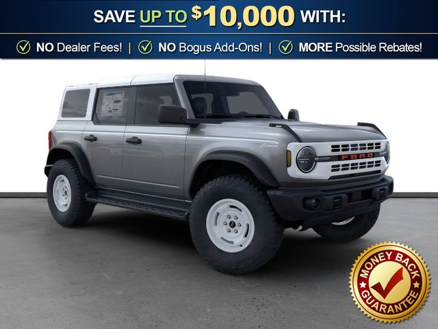 2026 Ford Bronco Heritage Edition NFT Carbonized Gray Metallic Heritage Edition NFT 4WD 10-Speed Automatic 2.7L EcoBoost V6 4-Wheel Disc Brakes, 7 Speakers, ABS brakes, Air Conditioning, Alloy wheels, AM/FM radio: SiriusXM with 360L, AM/FM Stereo, Auto High-beam Headlights, Auto-dimming Rear-View mirror, Automatic temperature control, Brake assist, Compass, Connected Navigation, Convertible HardTop, Convertible roof lining, Delay-off headlights, Driver door bin, Driver vanity mirror, Dual front impact airbags, Dual front side impact airbags, Electronic Stability Control, Emergency communication system: 911 Assist, Exterior Parking Camera Rear, Ford Connectivity Package (1-Year Included), Front anti-roll bar, Front Bucket Seats, Front Center Armrest, Front dual zone A/C, Front fog lights, Front reading lights, Front wheel independent suspension, Fully automatic headlights, Glass rear window, Heated door mirrors, Heated front seats, Heated steering wheel, Illuminated entry, Integrated roll-over protection, Low tire pressure warning, Navigation system: Connected Navigation, Occupant sensing airbag, Outside temperature display, Overhead airbag, Overhead console, Panic alarm, Passenger door bin, Passenger vanity mirror, Plaid Cloth Front Heated Bucket Seats, Power door mirrors, Power steering, Power windows, Radio data system, Rear window defroster, Rear window wiper, Remote keyless entry, Security system, SiriusXM with 360L, Speed control, Split folding rear seat, Steering wheel mounted audio controls, SYNC 4, Tachometer, Telescoping steering wheel, Tilt steering wheel, Traction control, Trip computer, Variably intermittent wipers, Wheels: 17" Unique White.