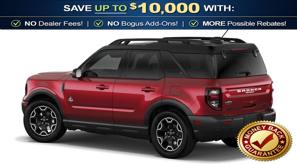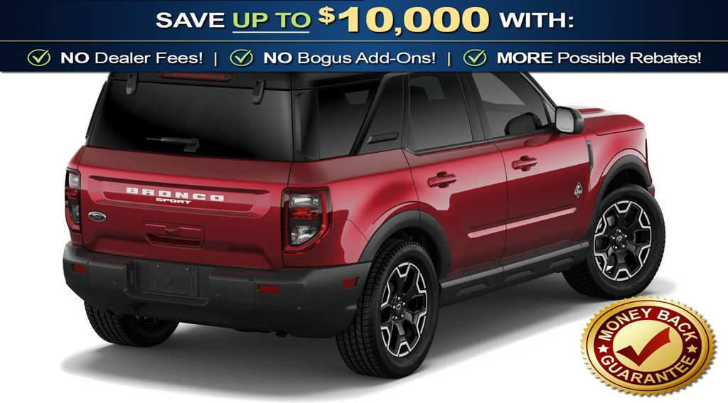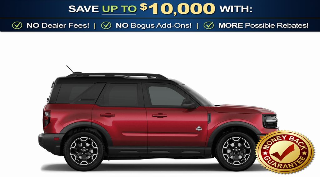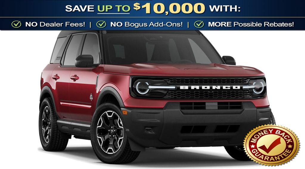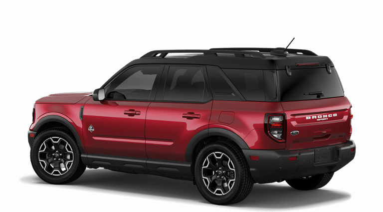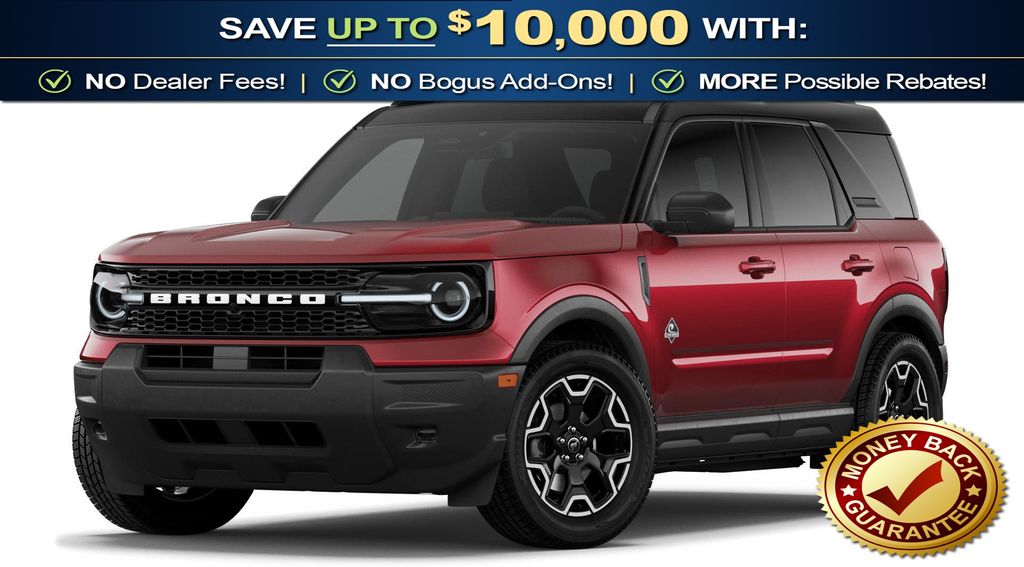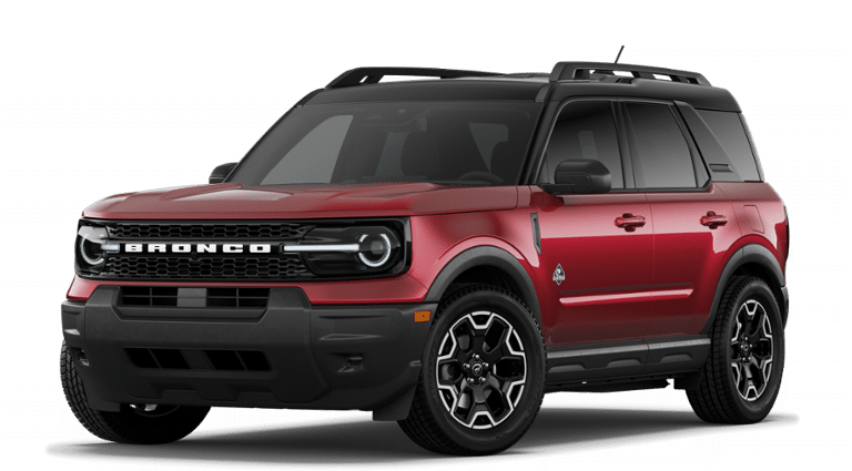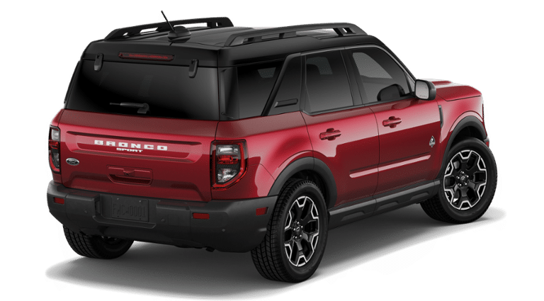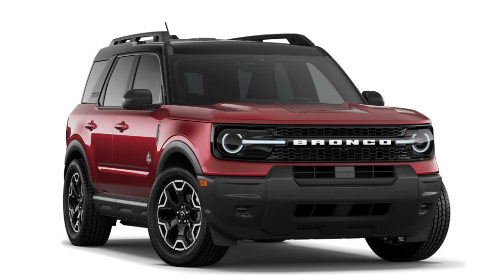 Ruby Red Metallic Tinted Clearcoat 2026 Ford Bronco Sport Outer Banks NFT 4WD 8-Speed Automatic 1.5L EcoBoost 4-Wheel Disc Brakes, 6 Speakers, ABS brakes, Air Conditioning, Alloy wheels, AM/FM radio: SiriusXM with 360L, AM/FM Stereo, Apple CarPlay/Android Auto, Auto High-beam Headlights, Auto-dimming Rear-View mirror, Automatic temperature control, Brake assist, Compass, Delay-off headlights, Driver door bin, Driver vanity mirror, Dual front impact airbags, Dual front side impact airbags, Electronic Stability Control, Emergency communication system: SYNC 4 911 Assist, Exterior Parking Camera Rear, Ford Connectivity Package (1-Year Included), Four wheel independent suspension, Front anti-roll bar, Front Bucket Seats, Front Center Armrest, Front Driver/Passenger Seat Back Map Pockets, Front dual zone A/C, Front fog lights, Front License Plate Bracket, Front reading lights, Fully automatic headlights, Heated door mirrors, Heated front seats, Heated steering wheel, Illuminated entry, Internet access capable: 5G Modem - Ford Connectivity Package, Knee airbag, Low tire pressure warning, Memory seat, Occupant sensing airbag, Outside temperature display, Overhead airbag, Overhead console, Panic alarm, Passenger door bin, Passenger vanity mirror, Power door mirrors, Power driver seat, Power passenger seat, Power steering, Power windows, Radio data system, Rear anti-roll bar, Rear Parking Sensors, Rear reading lights, Rear seat center armrest, Rear window defroster, Rear window wiper, Remote keyless entry, Security system, SiriusXM with 360L, Speed control, Speed-sensing steering, Speed-Sensitive Wipers, Split folding rear seat, Steering wheel mounted audio controls, SYNC 4 with Enhanced Voice Recognition, Tachometer, Telescoping steering wheel, Tilt steering wheel, Traction control, Trip computer, Variably intermittent wipers, Wheels: 18" Ebony Black.