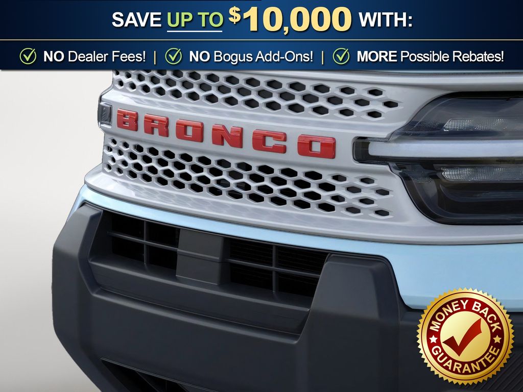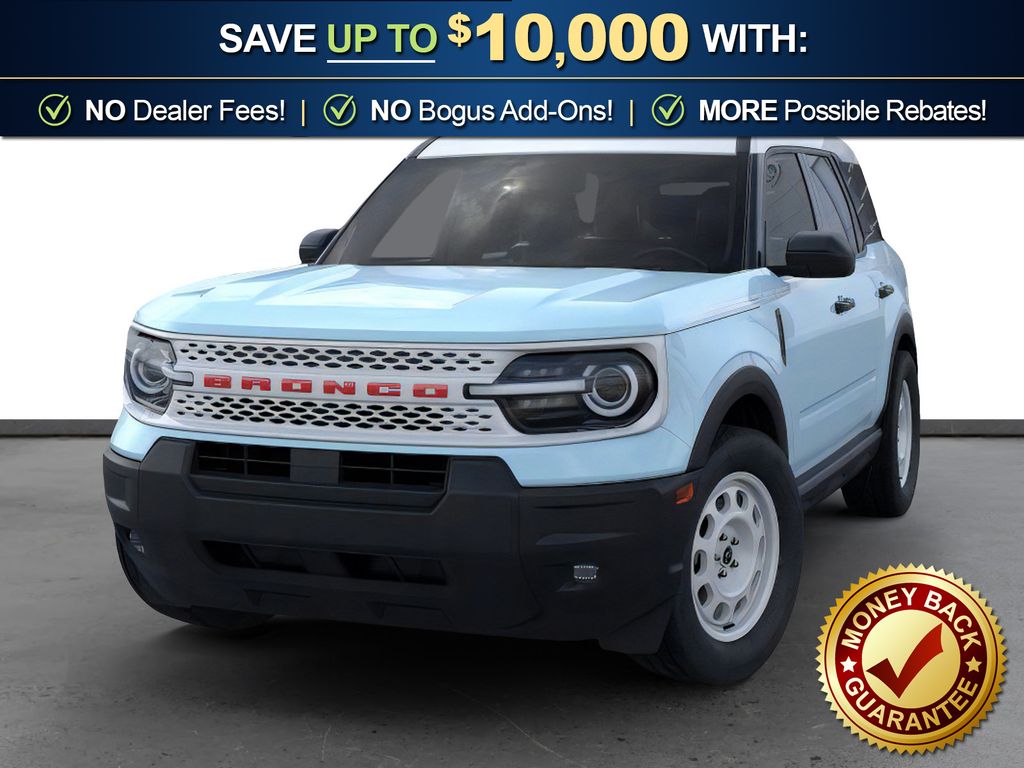 Robins Egg Blue 2026 Ford Bronco Sport Heritage NFT 4WD 8-Speed Automatic 1.5L EcoBoost 4-Wheel Disc Brakes, 6 Speakers, ABS brakes, Air Conditioning, Alloy wheels, AM/FM radio: SiriusXM with 360L, AM/FM Stereo, Apple CarPlay/Android Auto, Auto High-beam Headlights, Automatic temperature control, Brake assist, Compass, Convenience Package, Delay-off headlights, Driver door bin, Driver vanity mirror, Dual front impact airbags, Dual front side impact airbags, Electronic Stability Control, Emergency communication system: SYNC 4 911 Assist, Exterior Parking Camera Rear, Ford Connectivity Package (1-Year Included), Four wheel independent suspension, Front anti-roll bar, Front Bucket Seats, Front Center Armrest, Front Driver/Passenger Seat Back Map Pockets, Front License Plate Bracket, Front reading lights, Fully automatic headlights, Heated 8-Way Power Driver's Seat, Heated door mirrors, Illuminated entry, Internet access capable: 5G Modem - Ford Connectivity Package, Knee airbag, LED Fog Lamps, Low tire pressure warning, Occupant sensing airbag, Outside temperature display, Overhead airbag, Overhead console, Panic alarm, Passenger door bin, Passenger vanity mirror, Plaid Cloth Front Bucket Seats, Power door mirrors, Power steering, Power windows, Premium Wrapped Steering Wheel, Radio data system, Rear anti-roll bar, Rear Parking Sensors, Rear reading lights, Rear seat center armrest, Rear window defroster, Rear window wiper, Remote keyless entry, Security system, SiriusXM with 360L, Speed control, Speed-sensing steering, Speed-Sensitive Wipers, Split folding rear seat, Steering wheel mounted audio controls, SYNC 4 with Enhanced Voice Recognition, Tachometer, Telescoping steering wheel, Tilt steering wheel, Traction control, Trip computer, Variably intermittent wipers, Wheels: 17" Oxford White-Painted Aluminum.