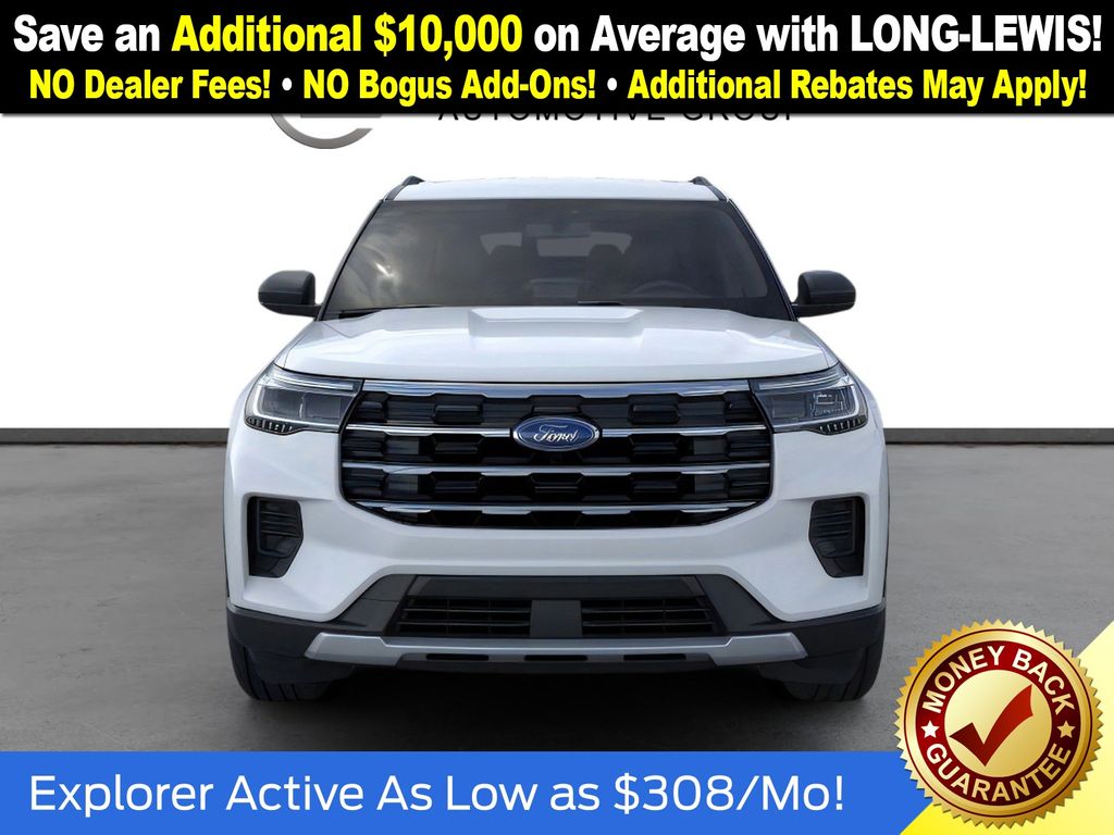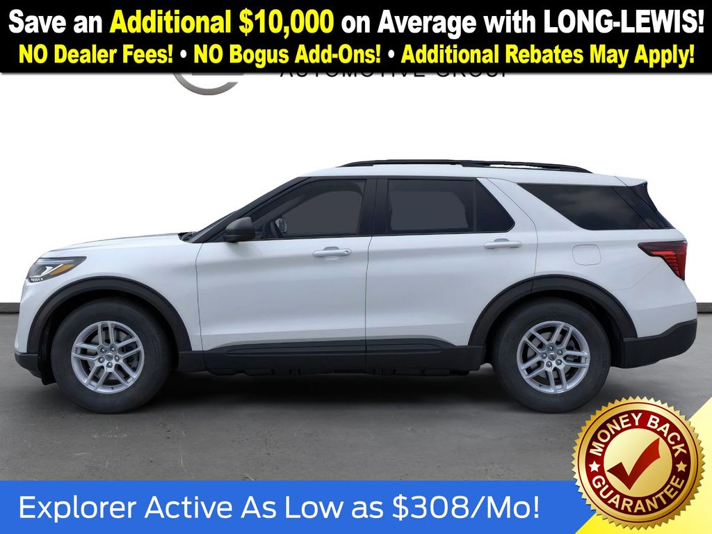 Space White Metallic 2026 Ford Explorer Active NFT RWD 10-Speed Automatic 2.3L EcoBoost I-4 3rd row seats: bench, 4-Wheel Disc Brakes, 6 Speakers, ABS brakes, Air Conditioning, Alloy wheels, AM/FM radio: SiriusXM with 360L, AM/FM Stereo, Apple CarPlay/Android Auto, Auto High-beam Headlights, Automatic temperature control, Brake assist, Bumpers: body-color, Compass, Delay-off headlights, Driver door bin, Driver vanity mirror, Dual front impact airbags, Dual front side impact airbags, Electronic Stability Control, Emergency communication system: 911 Assist, Exterior Parking Camera Rear, Four wheel independent suspension, Front anti-roll bar, Front Bucket Seats, Front Center Armrest, Front dual zone A/C, Front License Plate Bracket, Front reading lights, Fully automatic headlights, Heated ActiveX Seating Material Captain's Chairs, Heated door mirrors, Illuminated entry, Internet access capable: FordPass Connect 5G, Knee airbag, Low tire pressure warning, Navigation System, Occupant sensing airbag, Outside temperature display, Overhead airbag, Overhead console, Panic alarm, Passenger door bin, Passenger vanity mirror, Power driver seat, Power steering, Power windows, Rear air conditioning, Rear anti-roll bar, Rear reading lights, Rear window defroster, Rear window wiper, Remote keyless entry, Security system, Speed control, Speed-sensing steering, Speed-Sensitive Wipers, Split folding rear seat, Spoiler, Steering wheel mounted audio controls, Tachometer, Telescoping steering wheel, Tilt steering wheel, Traction control, Trip computer, Unique Cloth Captain's Chairs, Variably intermittent wipers, Wheels: 18" Sparkle Silver-Painted Aluminum.