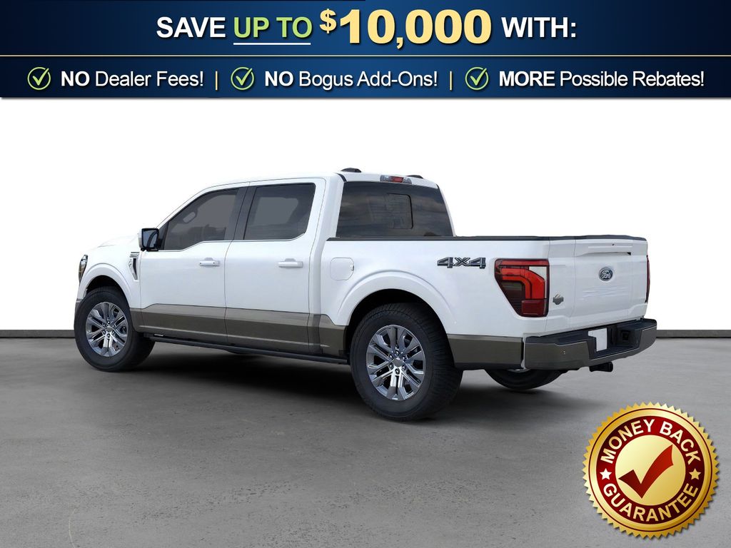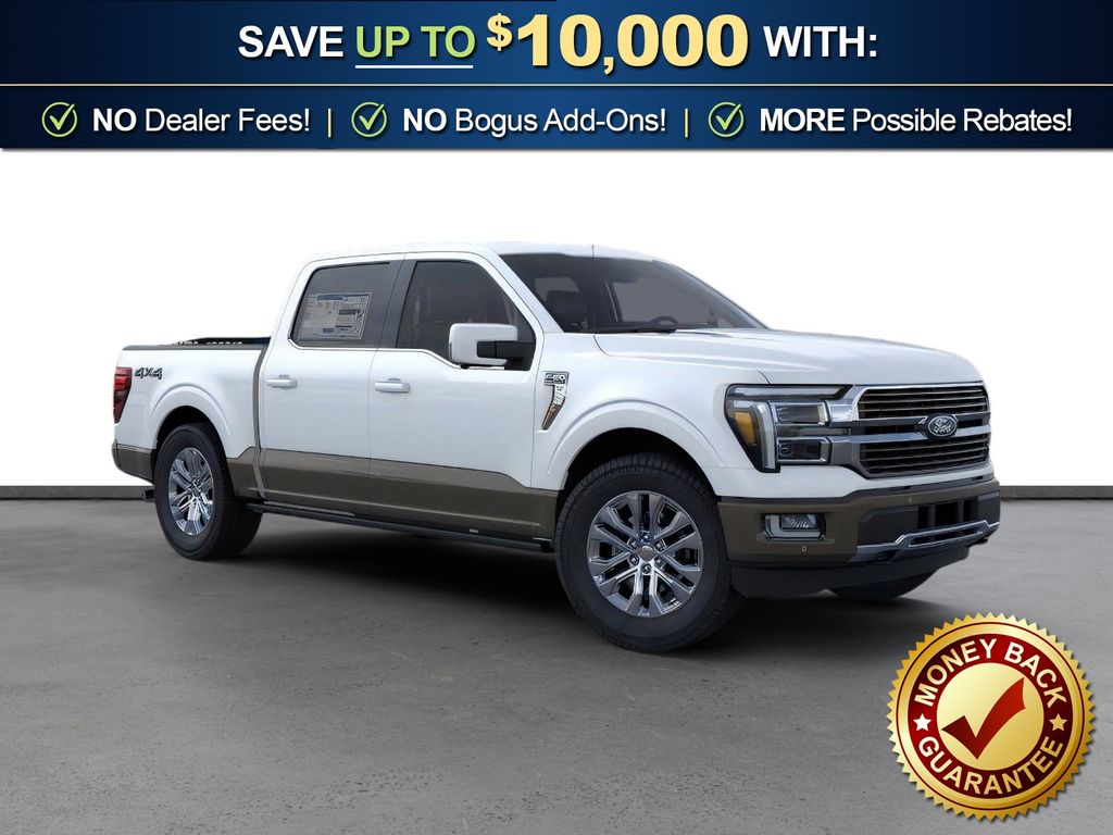 Star White Metallic Tri-Coat 2026 Ford F-150 King Ranch NFT 4WD 10-Speed Automatic 3.5L V6 EcoBoost 4WD, 4-Wheel Disc Brakes, 8 Speakers, ABS brakes, Adjustable pedals, Air Conditioning, Alloy wheels, AM/FM radio: SiriusXM with 360L, Auto High-beam Headlights, Auto tilt-away steering wheel, Auto-dimming door mirrors, Auto-dimming Rear-View mirror, Automatic temperature control, Brake assist, Chrome wheels, Compass, Delay-off headlights, Driver door bin, Driver vanity mirror, Dual front impact airbags, Dual front side impact airbags, Electronic Locking with 3.55 Axle Ratio, Electronic Stability Control, Emergency communication system: SYNC 4 911 Assist, Ford Connectivity Package (1-Year Included), Front anti-roll bar, Front Bucket Seats, Front Center Armrest, Front dual zone A/C, Front fog lights, Front License Plate Bracket, Front reading lights, Front wheel independent suspension, Fully automatic headlights, Garage door transmitter, Genuine wood dashboard insert, Heated door mirrors, Heated front seats, Heated rear seats, Heated steering wheel, Illuminated entry, Internet access capable: 5G Modem - Ford Connectivity Package, King Ranch Multicontour Leather Bucket Seats, Leather steering wheel, Low tire pressure warning, Memory seat, Navigation system: Connected Navigation, Occupant sensing airbag, Outside temperature display, Overhead airbag, Overhead console, Panic alarm, Passenger door bin, Passenger vanity mirror, Pedal memory, Power door mirrors, Power driver seat, Power passenger seat, Power steering, Power windows, Pro Access Tailgate, Radio data system, Radio: B&O Sound System by Bang and Olufsen, Rain sensing wipers, Rear reading lights, Rear seat center armrest, Rear step bumper, Rear window defroster, Remote keyless entry, Security system, Speed control, Split folding rear seat, Steering wheel memory, Steering wheel mounted audio controls, SYNC 4 with Enhanced Voice Recognition, Tachometer, Telescoping steering wheel, Tilt steering wheel, Traction control, Trip computer, Turn signal indicator mirrors, Twin Panel Moonroof, Variably intermittent wipers, Ventilated front seats, Wheels: 20" Chrome-Like PVD, 4WD.