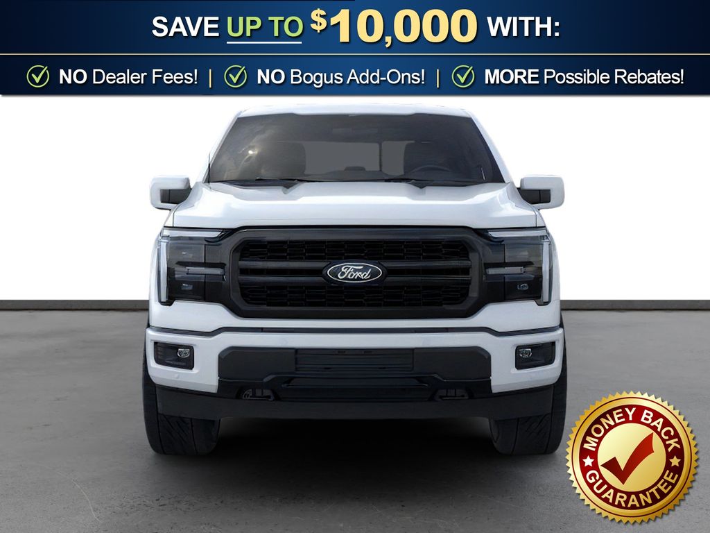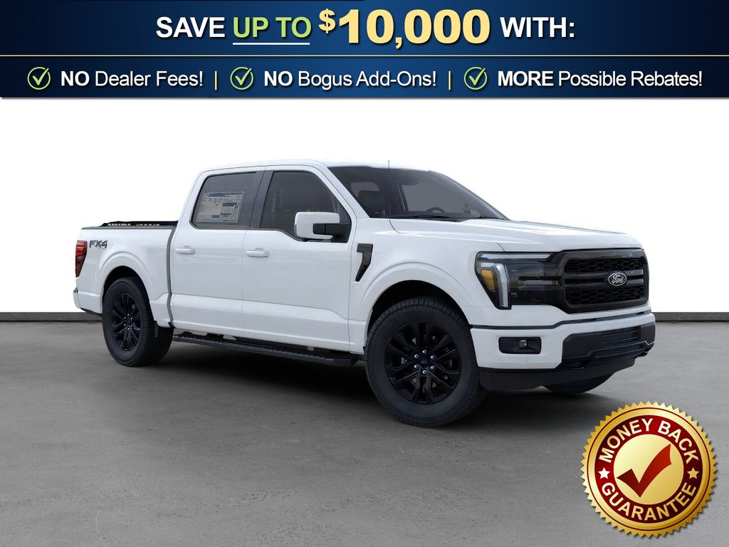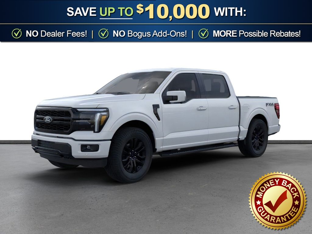 Oxford White 2026 Ford F-150 Lariat NFT 4WD 10-Speed Automatic 5.0L V8 4WD, 4-Wheel Disc Brakes, 4x4 FX4 Off-Road Bodyside Decal, 8 Speakers, ABS brakes, ActiveX Trimmed Bucket Seats, Air Conditioning, Alloy wheels, AM/FM radio: SiriusXM with 360L, Auto High-beam Headlights, Auto-dimming door mirrors, Auto-dimming Rear-View mirror, Automatic temperature control, Black Exterior Badging, Black Grille, Black Taillamp Bezels, Body-Color Front and Rear Bumpers, Brake assist, Bumpers: chrome, Chrome wheels, Compass, Console Worksurface, Dark Interior Appliques, Delay-off headlights, Driver door bin, Driver vanity mirror, Driver's Side SecuriCode Keyless-Entry Keypad, Dual front impact airbags, Dual front side impact airbags, Electronic Stability Control, Emergency communication system: SYNC 4 911 Assist, Ford Connectivity Package (1-Year Included), Front anti-roll bar, Front Bucket Seats, Front Center Armrest, Front dual zone A/C, Front fog lights, Front License Plate Bracket, Front reading lights, Front wheel independent suspension, Fully automatic headlights, FX4 Off-Road Package, Garage door transmitter, Gray Box Side Decal, Heated door mirrors, Heated front seats, Heated steering wheel, Hill Descent Control, Illuminated entry, Integrated Trailer Brake Controller, Internet access capable: 5G Modem - Ford Connectivity Package, Lariat Black Appearance Package, Low tire pressure warning, Matte Black Tailgate F-150 Decal, Memory seat, Mobile Office Package, Monotube Rear Shocks, Navigation system: Connected Navigation, Occupant sensing airbag, Off-Road Tuned Front Shock Absorbers, Outside temperature display, Overhead airbag, Overhead console, Panic alarm, Partitioned Lockable Rear Storage, Passenger door bin, Passenger vanity mirror, Power door mirrors, Power driver seat, Power passenger seat, Power steering, Power windows, Radio data system, Radio: B&O Sound System by Bang and Olufsen, Rain sensing wipers, Rear reading lights, Rear seat center armrest, Rear step bumper, Rear window defroster, Remote keyless entry, Rock Crawl Mode, Security system, Speed control, Split folding rear seat, Steering wheel mounted audio controls, SYNC 4 with Enhanced Voice Recognition, Tachometer, Telescoping steering wheel, Tilt steering wheel, Tow/Haul Package, Traction control, Tray Style Floor Liner Without Carpet Mats, Trip computer, Turn signal indicator mirrors, Variably intermittent wipers, Ventilated front seats, Wheels: 18" Chrome-Like PVD, Wireless Charging, 4WD.
