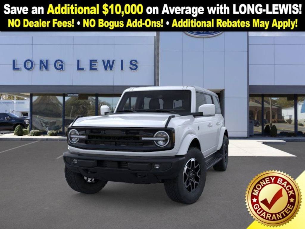 Oxford White 2025 Ford Bronco Outer Banks fctp 4WD 10-Speed Automatic 2.7L EcoBoost V6 18" Bright Machined Aluminum Wheels, 3.73 Axle Ratio, 4-Wheel Disc Brakes, 7 Speakers, ABS brakes, Air Conditioning, Alloy wheels, AM/FM radio: SiriusXM with 360L, AM/FM Stereo, Auto High-beam Headlights, Auto-dimming Rear-View mirror, Automatic temperature control, Brake assist, Carbonized Gray Molded-In-Color Hard Top, Compass, Connected Navigation, Delay-off headlights, Driver door bin, Driver vanity mirror, Dual front impact airbags, Dual front side impact airbags, Electronic Stability Control, Emergency communication system: 911 Assist, Exterior Parking Camera Rear, Front anti-roll bar, Front Bucket Seats, Front Center Armrest, Front dual zone A/C, Front fog lights, Front License Plate Bracket, Front reading lights, Front wheel independent suspension, Fully automatic headlights, Hard Top Sound Deadening Headliner, Heated door mirrors, Heated front seats, Heated Leather-Trimmed/Vinyl Bucket Seats, Heated steering wheel, Illuminated entry, Integrated roll-over protection, Leather Shift Knob, Low tire pressure warning, Navigation system: Connected Navigation, Occupant sensing airbag, Outside temperature display, Overhead airbag, Overhead console, Panic alarm, Passenger door bin, Passenger vanity mirror, Power door mirrors, Power driver seat, Power passenger seat, Power steering, Power windows, Radio data system, Rear seat center armrest, Rear-Window Defroster & Washer, Remote keyless entry, Security system, SiriusXM w/360L, Speed control, Split folding rear seat, Steering wheel mounted audio controls, SYNC 4, Tachometer, Telescoping steering wheel, Tilt steering wheel, Traction control, Trip computer, Variably intermittent wipers, Voltmeter.