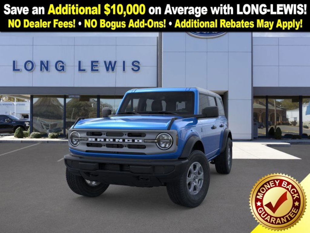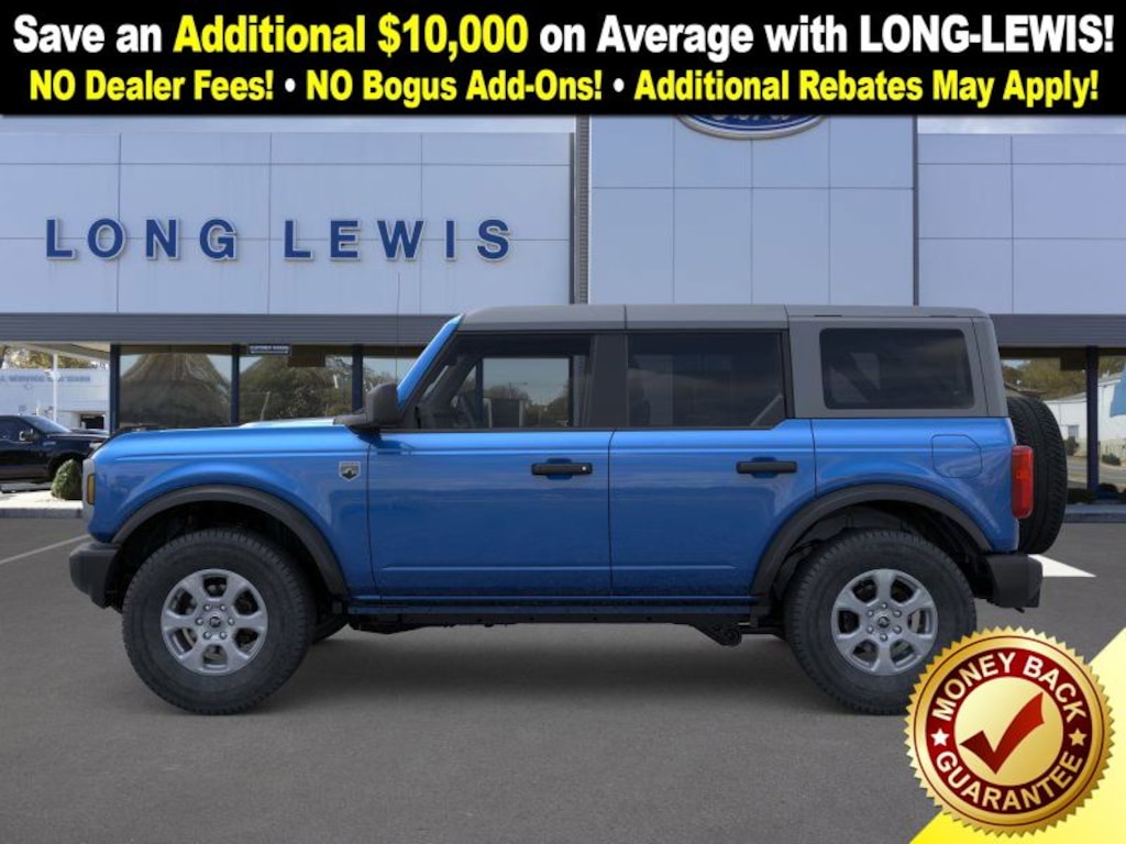 Velocity Blue Metallic 2025 Ford Bronco Big Bend 4WD 7-Speed Manual 2.3L EcoBoost I-4 4-Wheel Disc Brakes, 4.46 Axle Ratio, 7 Speakers, ABS brakes, Air Conditioning, Alloy wheels, AM/FM radio: SiriusXM with 360L, AM/FM Stereo, Auto High-beam Headlights, Brake assist, Carbonized Gray Molded-In-Color Hard Top, Cloth Bucket Seats, Compass, Connected Navigation, Delay-off headlights, Driver door bin, Driver vanity mirror, Dual front impact airbags, Dual front side impact airbags, Electronic Stability Control, Emergency communication system: 911 Assist, Exterior Parking Camera Rear, Front anti-roll bar, Front Bucket Seats, Front Center Armrest, Front License Plate Bracket, Front reading lights, Front wheel independent suspension, Fully automatic headlights, Hard Top Sound Deadening Headliner, Heated door mirrors, Illuminated entry, Integrated roll-over protection, Leather Shift Knob, Low tire pressure warning, Occupant sensing airbag, Outside temperature display, Overhead airbag, Overhead console, Panic alarm, Passenger door bin, Passenger vanity mirror, Power door mirrors, Power steering, Power windows, Radio data system, Rear-Window Defroster & Washer, Remote keyless entry, Security system, SiriusXM w/360L, Speed control, Split folding rear seat, Steering wheel mounted audio controls, SYNC 4, Tachometer, Telescoping steering wheel, Tilt steering wheel, Traction control, Trip computer, Variably intermittent wipers, Wheels: 17" Carbonized Gray-Painted Aluminum.
