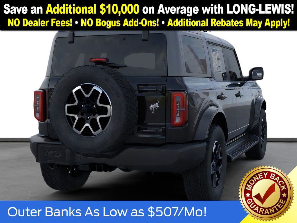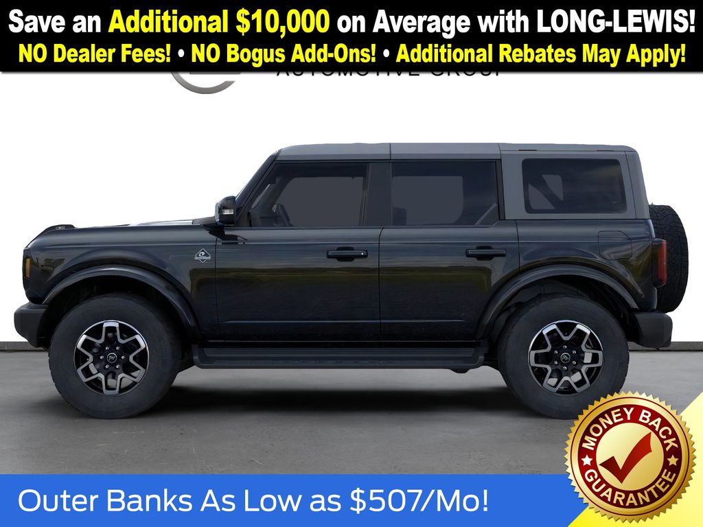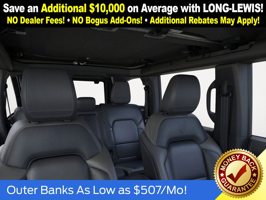 Shadow Black 2025 Ford Bronco Outer Banks FCT 4WD 10-Speed Automatic 2.3L EcoBoost I-4 18" Bright Machined Aluminum Wheels, 3.73 Axle Ratio, 4-Wheel Disc Brakes, 7 Speakers, ABS brakes, Air Conditioning, Alloy wheels, AM/FM radio: SiriusXM with 360L, AM/FM Stereo, Auto High-beam Headlights, Auto-dimming Rear-View mirror, Automatic temperature control, Brake assist, Carbonized Gray Molded-In-Color Hard Top, Compass, Connected Navigation, Delay-off headlights, Driver door bin, Driver vanity mirror, Dual front impact airbags, Dual front side impact airbags, Electronic Stability Control, Emergency communication system: 911 Assist, Exterior Parking Camera Rear, Front anti-roll bar, Front Bucket Seats, Front Center Armrest, Front dual zone A/C, Front fog lights, Front License Plate Bracket, Front reading lights, Front wheel independent suspension, Fully automatic headlights, Hard Top Sound Deadening Headliner, Heated door mirrors, Heated front seats, Heated Leather-Trimmed/Vinyl Bucket Seats, Heated steering wheel, Illuminated entry, Integrated roll-over protection, Leather Shift Knob, Low tire pressure warning, Navigation system: Connected Navigation, Occupant sensing airbag, Outside temperature display, Overhead airbag, Overhead console, Panic alarm, Passenger door bin, Passenger vanity mirror, Power door mirrors, Power driver seat, Power passenger seat, Power steering, Power windows, Radio data system, Rear seat center armrest, Rear-Window Defroster & Washer, Remote keyless entry, Security system, SiriusXM w/360L, Speed control, Split folding rear seat, Steering wheel mounted audio controls, SYNC 4, Tachometer, Telescoping steering wheel, Tilt steering wheel, Traction control, Trip computer, Variably intermittent wipers, Voltmeter.