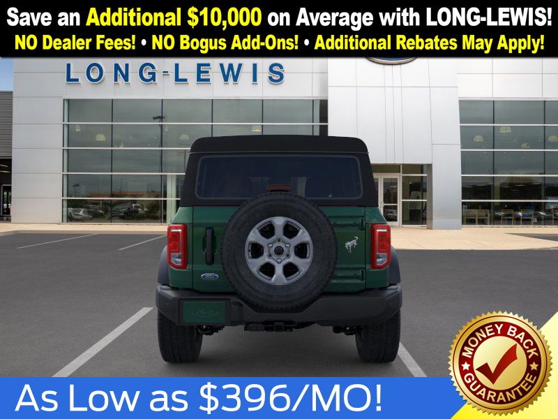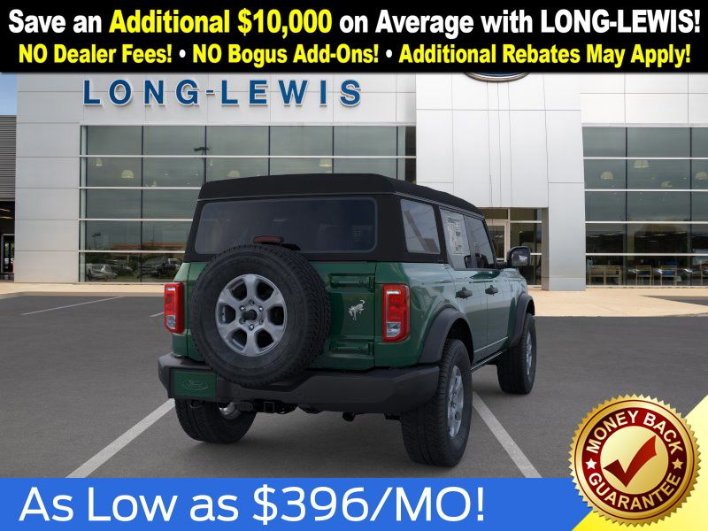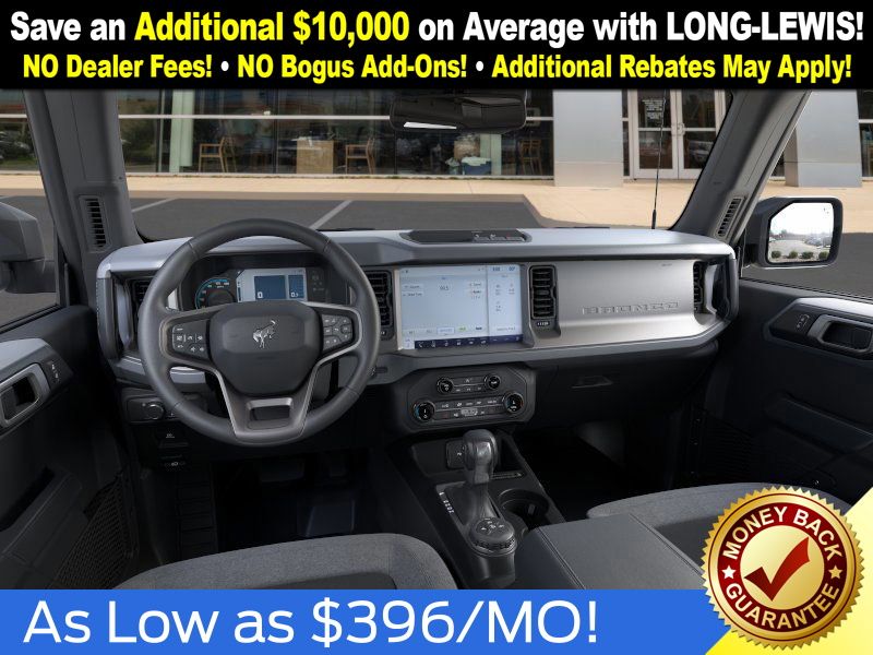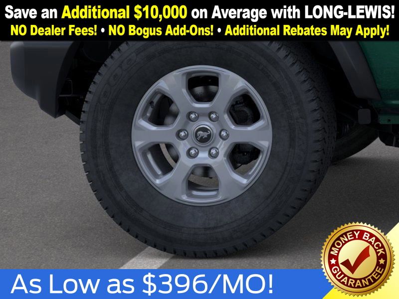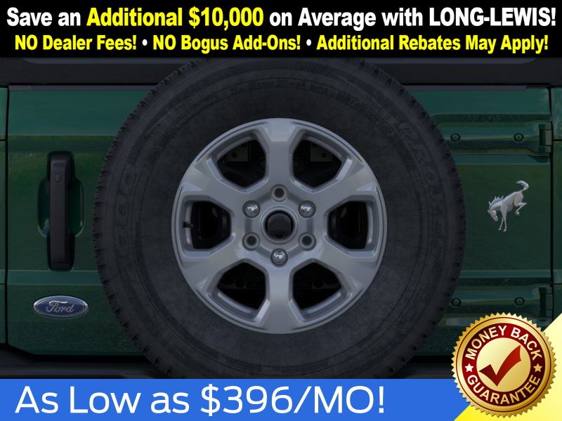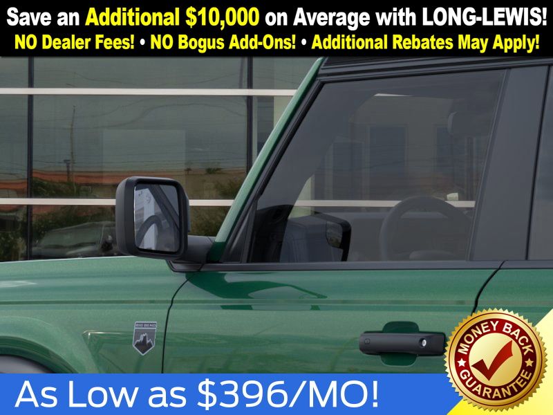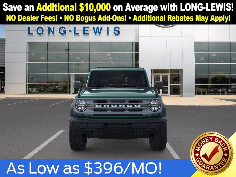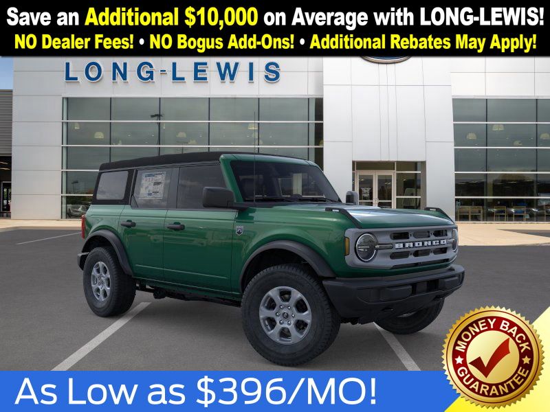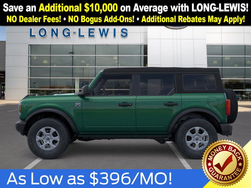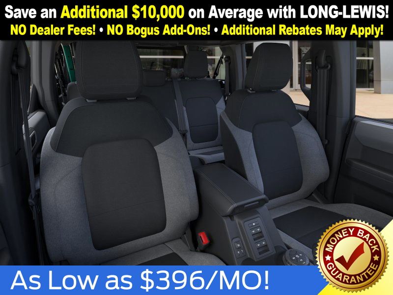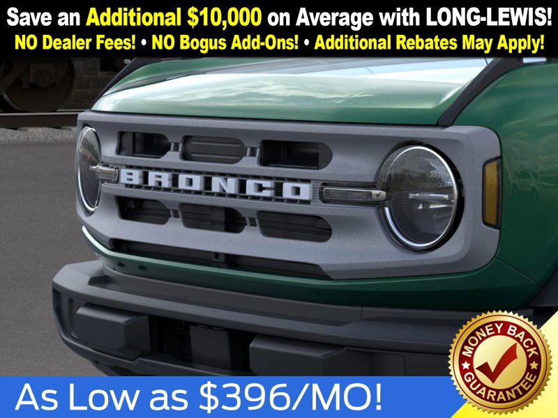 Eruption Green Metallic 2025 Ford Bronco Big Bend NFT 4WD 10-Speed Automatic 2.3L EcoBoost I-4 4-Wheel Disc Brakes, 4.46 Axle Ratio, 7 Speakers, ABS brakes, Air Conditioning, Alloy wheels, AM/FM radio: SiriusXM with 360L, AM/FM Stereo, Auto High-beam Headlights, Brake assist, Cloth Bucket Seats, Compass, Delay-off headlights, Driver door bin, Driver vanity mirror, Dual front impact airbags, Dual front side impact airbags, Electronic Stability Control, Emergency communication system: 911 Assist, Exterior Parking Camera Rear, Front anti-roll bar, Front Bucket Seats, Front Center Armrest, Front reading lights, Front wheel independent suspension, Fully automatic headlights, Heated door mirrors, Illuminated entry, Integrated roll-over protection, Internet access capable: FordPass Connect, Leather Shift Knob, Low tire pressure warning, Occupant sensing airbag, Outside temperature display, Overhead airbag, Overhead console, Panic alarm, Passenger door bin, Passenger vanity mirror, Power door mirrors, Power steering, Power windows, Radio data system, Remote keyless entry, Security system, SiriusXM w/360L, Speed control, Split folding rear seat, Steering wheel mounted audio controls, SYNC 4, Tachometer, Telescoping steering wheel, Tilt steering wheel, Traction control, Trip computer, Variably intermittent wipers, Wheels: 17" Carbonized Gray-Painted Aluminum.