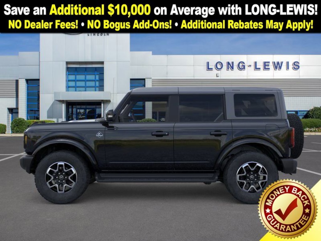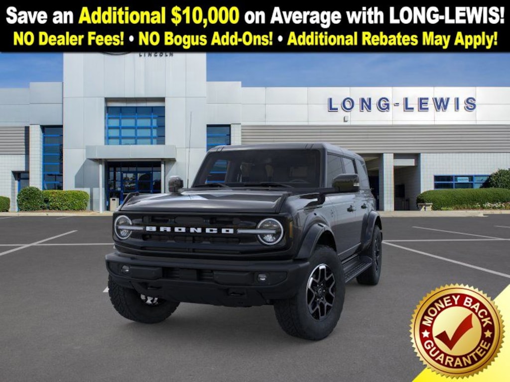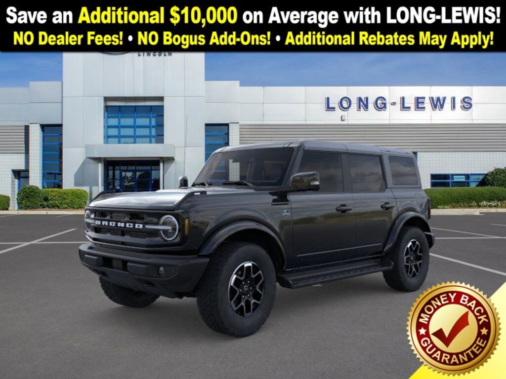 Dealer Discount of $3,119 off MSRP Shadow Black 2025 Ford Bronco Outer Banks NFT 4WD 10-Speed Automatic 2.7L EcoBoost V6 18" Bright Machined Aluminum Wheels, 3.73 Axle Ratio, 4-Wheel Disc Brakes, 7 Speakers, ABS brakes, Air Conditioning, Alloy wheels, AM/FM radio: SiriusXM with 360L, AM/FM Stereo, Auto High-beam Headlights, Auto-dimming Rear-View mirror, Automatic temperature control, Brake assist, Carbonized Gray Molded-In-Color Hard Top, Compass, Connected Navigation, Delay-off headlights, Driver door bin, Driver vanity mirror, Dual front impact airbags, Dual front side impact airbags, Electronic Stability Control, Emergency communication system: 911 Assist, Exterior Parking Camera Rear, Front anti-roll bar, Front Bucket Seats, Front Center Armrest, Front dual zone A/C, Front fog lights, Front License Plate Bracket, Front reading lights, Front wheel independent suspension, Fully automatic headlights, Hard Top Sound Deadening Headliner, Heated door mirrors, Heated front seats, Heated Leather-Trimmed/Vinyl Bucket Seats, Heated steering wheel, Illuminated entry, Integrated roll-over protection, Internet access capable: FordPass Connect, Leather Shift Knob, Low tire pressure warning, Navigation system: Connected Navigation, Occupant sensing airbag, Outside temperature display, Overhead airbag, Overhead console, Panic alarm, Passenger door bin, Passenger vanity mirror, Power door mirrors, Power driver seat, Power passenger seat, Power steering, Power windows, Radio data system, Rear seat center armrest, Rear-Window Defroster & Washer, Remote keyless entry, Security system, SiriusXM w/360L, Speed control, Split folding rear seat, Steering wheel mounted audio controls, SYNC 4, Tachometer, Telescoping steering wheel, Tilt steering wheel, Traction control, Trip computer, Variably intermittent wipers, Voltmeter.
