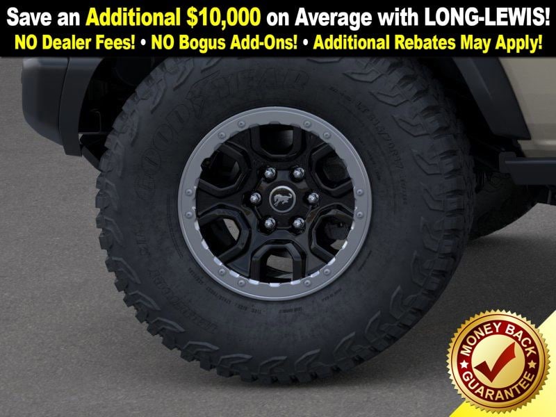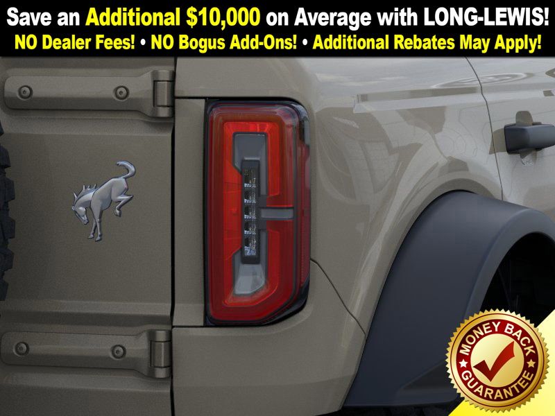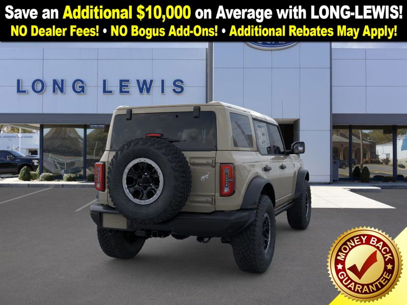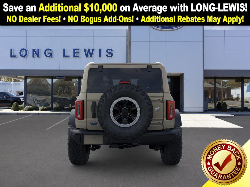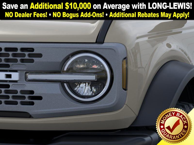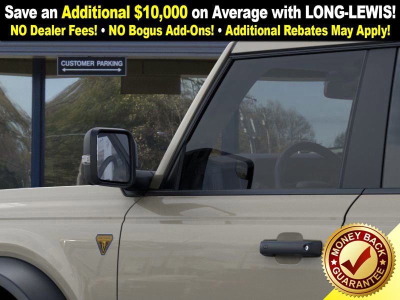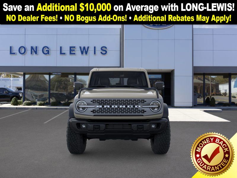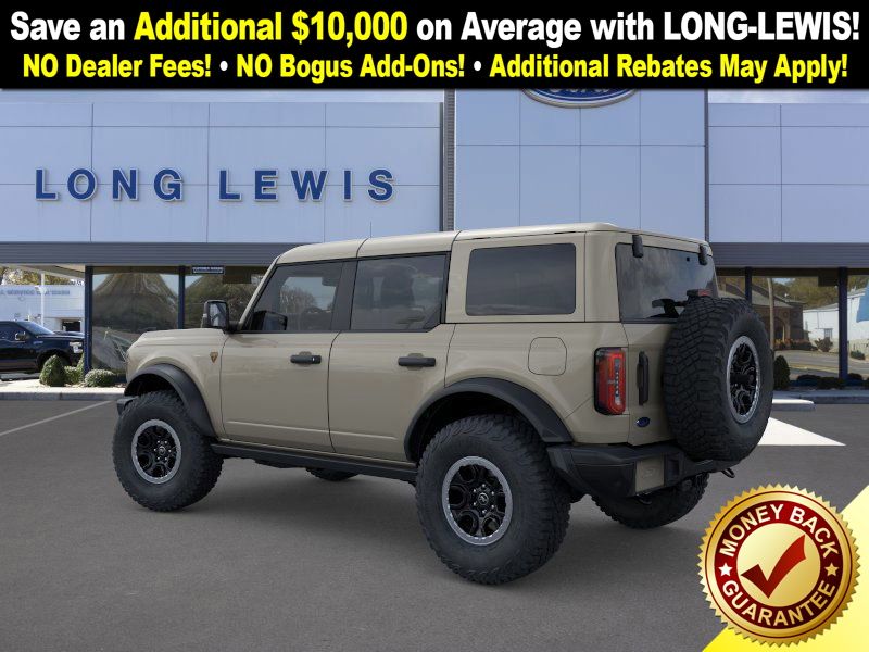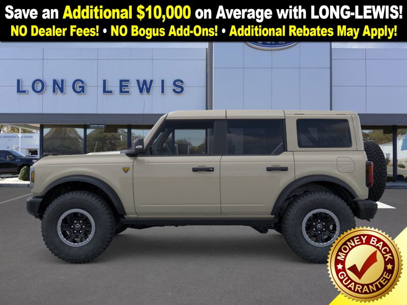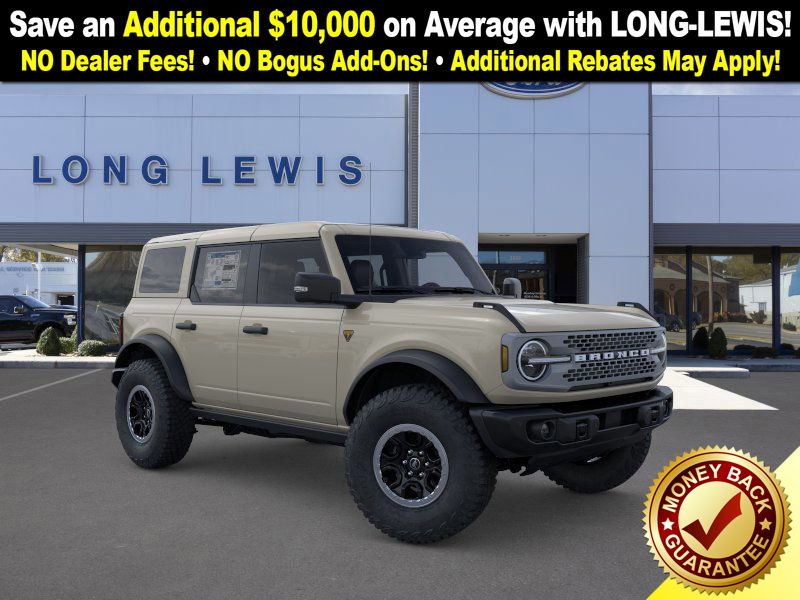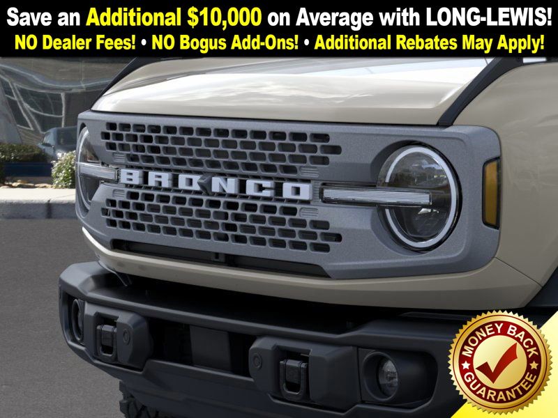 Desert Sand 2025 Ford Bronco Badlands NFT 4WD 10-Speed Automatic 2.7L EcoBoost V6 4-Wheel Disc Brakes, 7 Speakers, ABS brakes, Air Conditioning, Alloy wheels, AM/FM radio: SiriusXM with 360L, AM/FM Stereo, Auto High-beam Headlights, Auto-dimming Rear-View mirror, Body Color-Painted Hard Top, Brake assist, Compass, Delay-off headlights, Driver door bin, Driver vanity mirror, Dual front impact airbags, Dual front side impact airbags, Electronic Stability Control, Emergency communication system: 911 Assist, Exterior Parking Camera Rear, Front anti-roll bar, Front Bucket Seats, Front Center Armrest, Front fog lights, Front License Plate Bracket, Front reading lights, Front wheel independent suspension, Fully automatic headlights, Hard Top Sound Deadening Headliner, Heated door mirrors, Heated front seats, Heated steering wheel, High Clearance Fender Flares, High Clearance Suspension, Illuminated entry, Integrated roll-over protection, Internet access capable: FordPass Connect, Leather Shift Knob, Low tire pressure warning, Marine Grade Vinyl Heated Bucket Seats, Occupant sensing airbag, Outside temperature display, Overhead airbag, Overhead console, Panic alarm, Passenger door bin, Passenger vanity mirror, Position-Sensitive Bilstein Shock Absorbers, Power door mirrors, Power steering, Power windows, Radio data system, Rear-Window Defroster & Washer, Remote keyless entry, Sasquatch Package, Security system, SiriusXM w/360L, Speed control, Split folding rear seat, Steering wheel mounted audio controls, SYNC 4, Tachometer, Telescoping steering wheel, Tilt steering wheel, Traction control, Trip computer, Variably intermittent wipers, Voltmeter, Wheels: 17" Black High Gloss-Painted Aluminum (64X), Wheels: 17" Carbonized Gray Painted Aluminum, Wheels: 17" Carbonized Gray-Painted Aluminum.