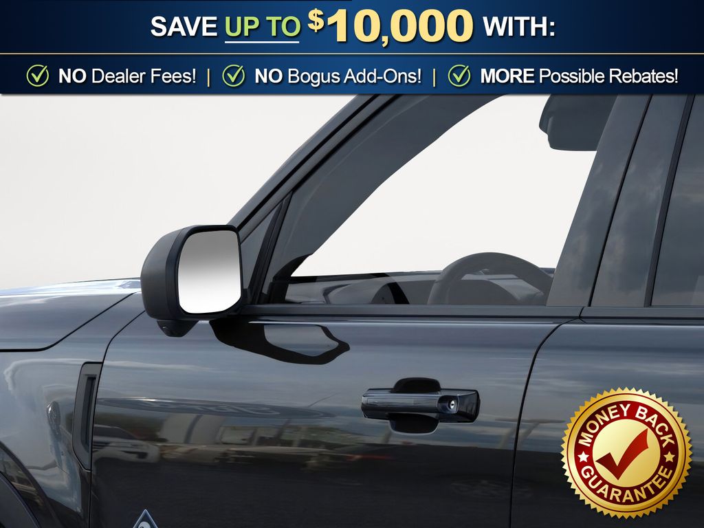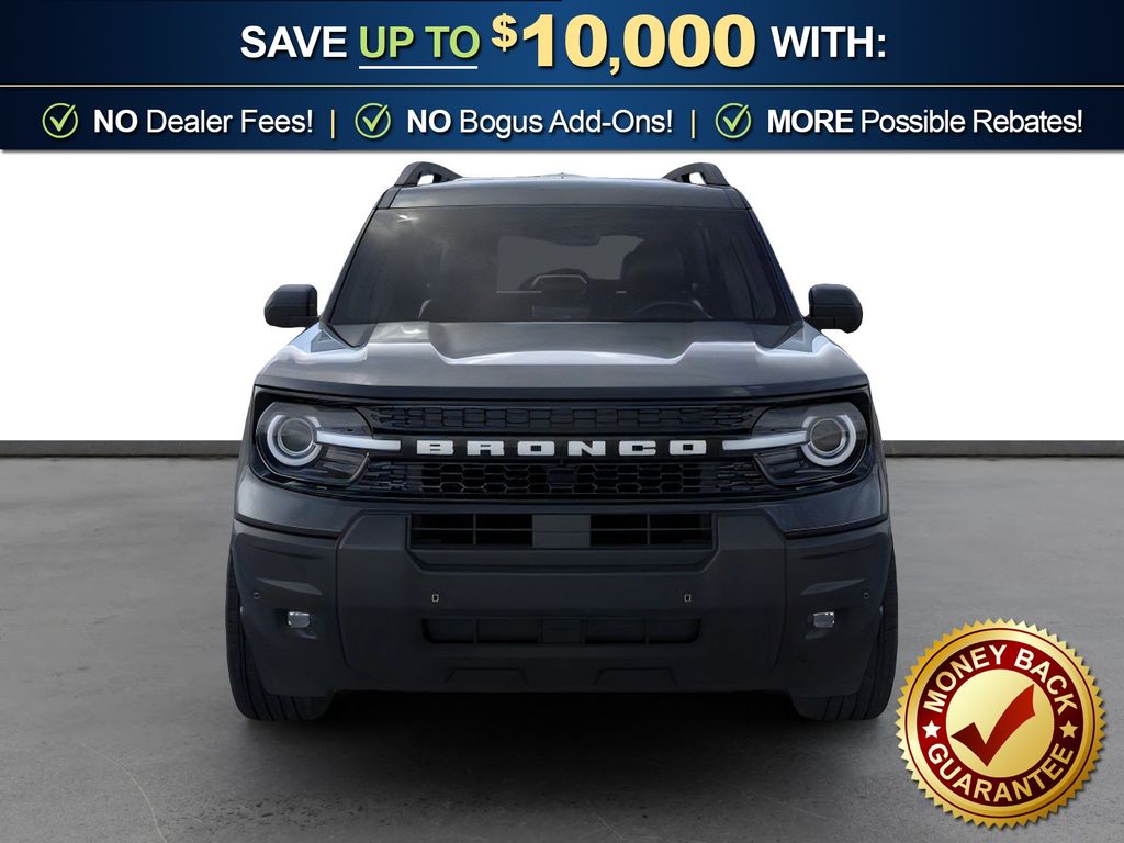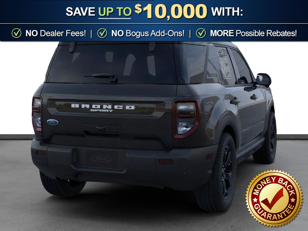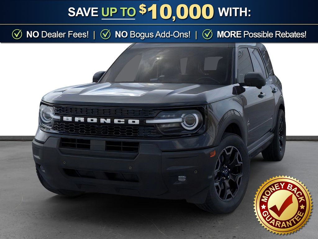 Shadow Black 2025 Ford Bronco Sport Outer Banks FCT 4WD 8-Speed Automatic 1.5L EcoBoost 360-Degree Camera w/Trail & Split View, 4-Wheel Disc Brakes, 6 Speakers, ABS brakes, Air Conditioning, Alloy wheels, AM/FM radio: SiriusXM, AM/FM Stereo, Auto High-beam Headlights, Auto-dimming Rear-View mirror, Automatic temperature control, B&O Sound System by Bang & Olufsen, Brake assist, Compass, Connected Navigation, Delay-off headlights, Driver door bin, Driver vanity mirror, Dual front impact airbags, Dual front side impact airbags, Electronic Stability Control, Emergency communication system: SYNC 4 911 Assist, Four wheel independent suspension, Front anti-roll bar, Front Bucket Seats, Front Center Armrest, Front Driver/Passenger Seat Back Map Pockets, Front dual zone A/C, Front fog lights, Front License Plate Bracket, Front Parking Sensors, Front reading lights, Fully automatic headlights, Garage door transmitter, HD Radio, Heated door mirrors, Heated front seats, Heated steering wheel, Illuminated entry, Knee airbag, Low tire pressure warning, Memory seat, Occupant sensing airbag, Outer Banks Tech Package+, Outside temperature display, Overhead airbag, Overhead console, Panic alarm, Passenger door bin, Passenger vanity mirror, Power door mirrors, Power driver seat, Power passenger seat, Power steering, Power windows, Premium Trimmed Front Bucket Seats w/Ebony/Roast, Radio data system, Rain sensing wipers, Rear anti-roll bar, Rear Parking Sensors, Rear reading lights, Rear seat center armrest, Rear window defroster, Rear window wiper, Remote keyless entry, Reverse Brake Assist, Security system, SiriusXM, Speed control, Speed-sensing steering, Speed-Sensitive Wipers, Split folding rear seat, Steering wheel mounted audio controls, SYNC 4 w/Enhanced Voice Recognition, Tachometer, Telescoping steering wheel, Tilt steering wheel, Traction control, Trip computer, Variably intermittent wipers, Wheels: 18" Ebony Black-Painted Aluminum.