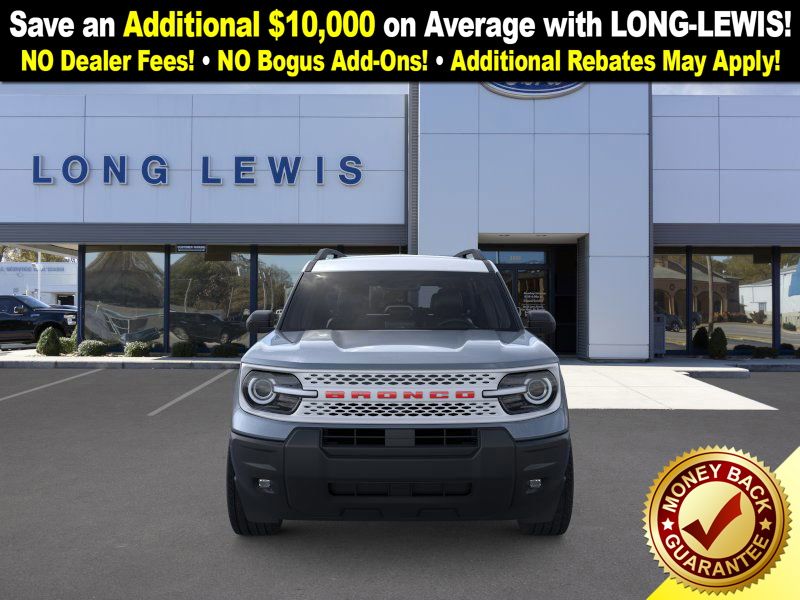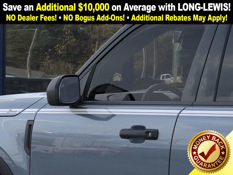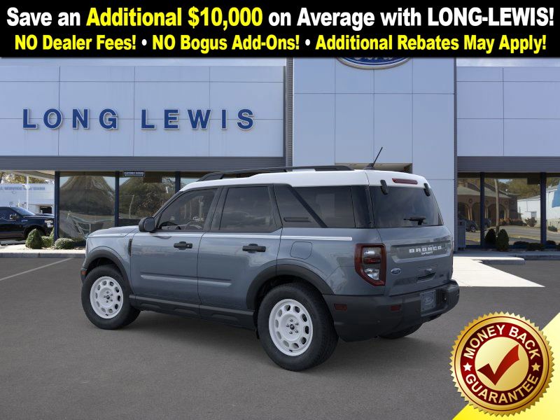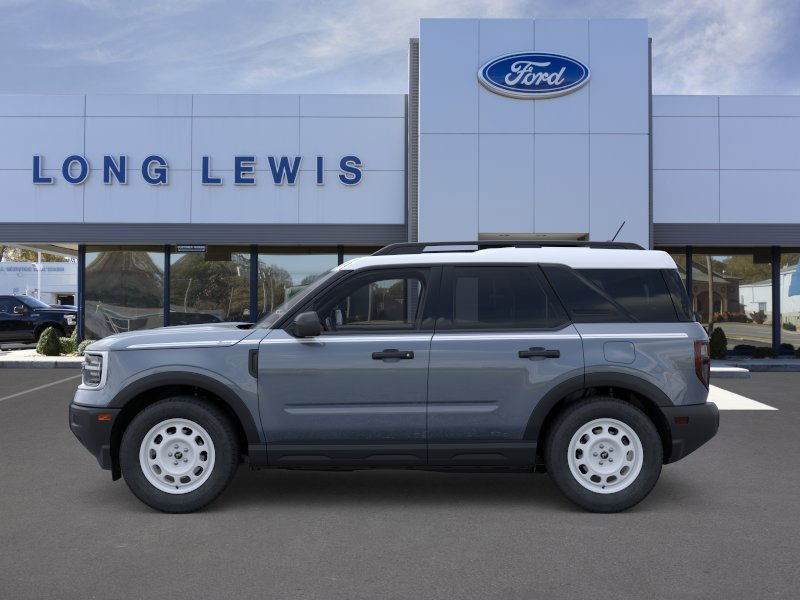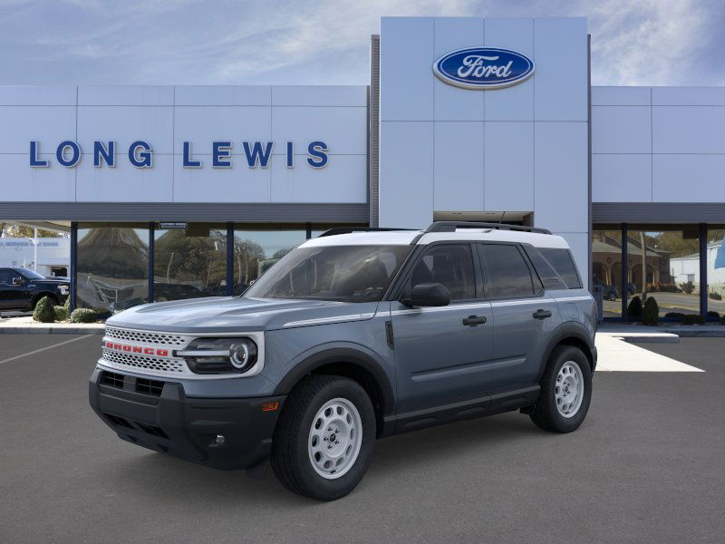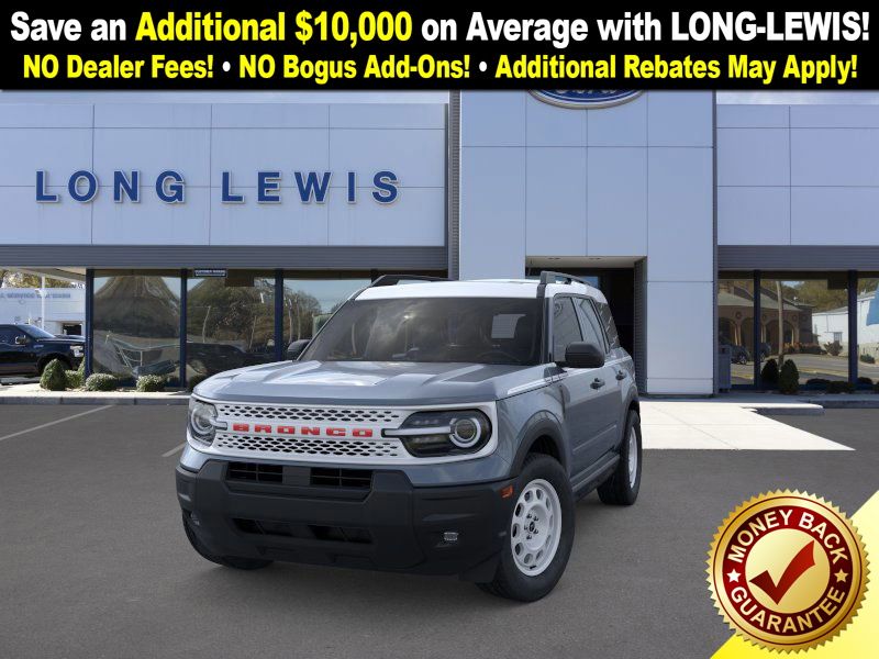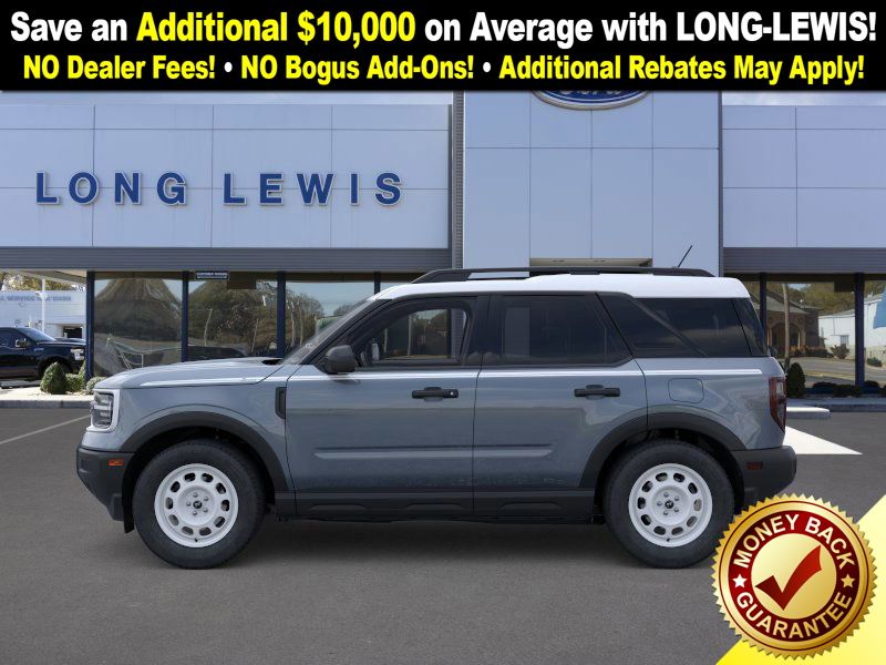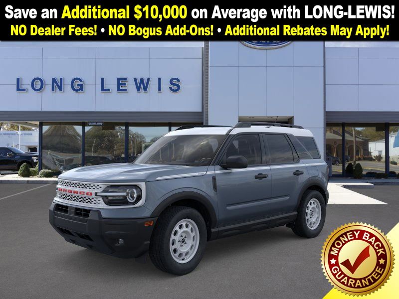 Azure Gray Metallic Tri-Coat 2025 Ford Bronco Sport Heritage fctp 4WD 8-Speed Automatic 1.5L EcoBoost 4-Wheel Disc Brakes, 6 Speakers, ABS brakes, Air Conditioning, Alloy wheels, AM/FM radio: SiriusXM, AM/FM Stereo, Auto High-beam Headlights, Automatic temperature control, Brake assist, Compass, Convenience Package, Delay-off headlights, Driver door bin, Driver vanity mirror, Dual front impact airbags, Dual front side impact airbags, Electronic Stability Control, Emergency communication system: SYNC 4 911 Assist, Four wheel independent suspension, Front anti-roll bar, Front Bucket Seats, Front Center Armrest, Front License Plate Bracket, Front reading lights, Fully automatic headlights, Heated 8-Way Power Driver's Seat, Heated door mirrors, Illuminated entry, Knee airbag, LED Fog Lamps, Low tire pressure warning, Occupant sensing airbag, Outside temperature display, Overhead airbag, Overhead console, Panic alarm, Passenger door bin, Passenger vanity mirror, Plaid Cloth Front Bucket Seats, Power door mirrors, Power Moonroof, Power steering, Power windows, Premium Wrapped Steering Wheel, Radio data system, Rear anti-roll bar, Rear Parking Sensors, Rear reading lights, Rear seat center armrest, Rear window defroster, Rear window wiper, Remote keyless entry, Security system, SiriusXM, Speed control, Speed-sensing steering, Speed-Sensitive Wipers, Split folding rear seat, Steering wheel mounted audio controls, SYNC 4 w/Enhanced Voice Recognition, Tachometer, Telescoping steering wheel, Tilt steering wheel, Traction control, Trip computer, Universal Garage Door Opener (UGDO), Variably intermittent wipers, Wheels: 17" Oxford White-Painted Aluminum.