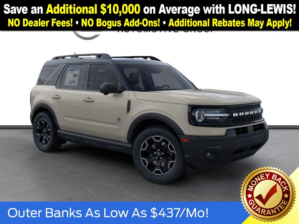Desert Sand 2025 Ford Bronco Sport Outer Banks fctp 4WD 8-Speed Automatic 1.5L EcoBoost 360-Degree Camera w/Trail & Split View, 4-Wheel Disc Brakes, 6 Speakers, ABS brakes, Air Conditioning, Alloy wheels, AM/FM radio: SiriusXM, AM/FM Stereo, Auto High-beam Headlights, Auto-dimming Rear-View mirror, Automatic temperature control, B&O Sound System by Bang & Olufsen, Brake assist, Compass, Connected Navigation, Delay-off headlights, Driver door bin, Driver vanity mirror, Dual front impact airbags, Dual front side impact airbags, Electronic Stability Control, Emergency communication system: SYNC 4 911 Assist, Four wheel independent suspension, Front anti-roll bar, Front Bucket Seats, Front Center Armrest, Front Driver/Passenger Seat Back Map Pockets, Front dual zone A/C, Front fog lights, Front License Plate Bracket, Front Parking Sensors, Front reading lights, Fully automatic headlights, Garage door transmitter, HD Radio, Heated door mirrors, Heated front seats, Heated steering wheel, Illuminated entry, Knee airbag, Low tire pressure warning, Memory seat, Occupant sensing airbag, Outer Banks Tech Package+, Outside temperature display, Overhead airbag, Overhead console, Panic alarm, Passenger door bin, Passenger vanity mirror, Power door mirrors, Power driver seat, Power passenger seat, Power steering, Power windows, Premium Trimmed Front Bucket Seats w/Ebony/Roast, Radio data system, Rain sensing wipers, Rear anti-roll bar, Rear Parking Sensors, Rear reading lights, Rear seat center armrest, Rear window defroster, Rear window wiper, Remote keyless entry, Reverse Brake Assist, Security system, SiriusXM, Speed control, Speed-sensing steering, Speed-Sensitive Wipers, Split folding rear seat, Steering wheel mounted audio controls, SYNC 4 w/Enhanced Voice Recognition, Tachometer, Telescoping steering wheel, Tilt steering wheel, Traction control, Trip computer, Variably intermittent wipers, Wheels: 18" Ebony Black-Painted Aluminum.
