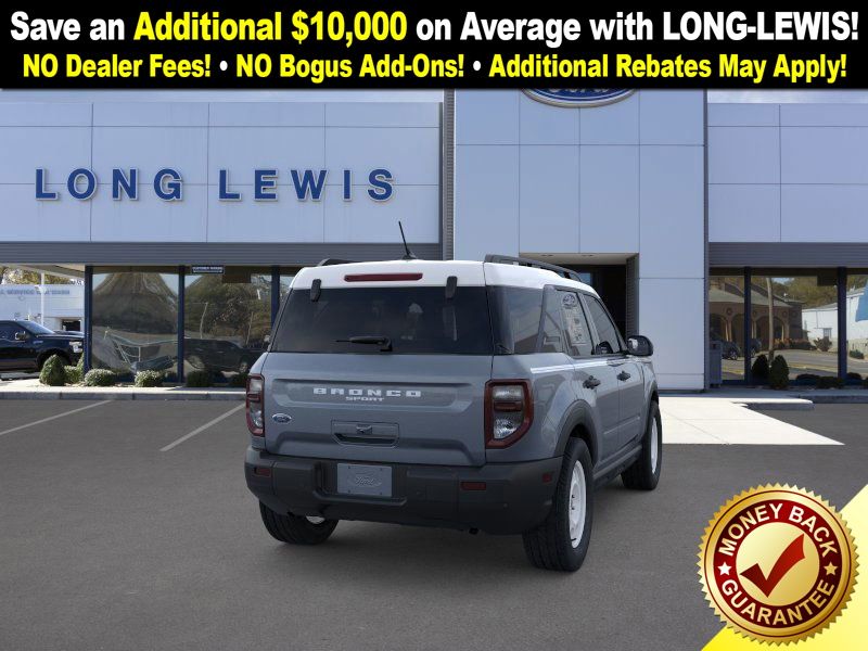 Azure Gray Metallic Tri-Coat 2025 Ford Bronco Sport Heritage FCT 4WD 8-Speed Automatic 1.5L EcoBoost 4-Wheel Disc Brakes, 6 Speakers, ABS brakes, Air Conditioning, Alloy wheels, AM/FM radio: SiriusXM, AM/FM Stereo, Auto High-beam Headlights, Automatic temperature control, Brake assist, Compass, Convenience Package, Delay-off headlights, Driver door bin, Driver vanity mirror, Dual front impact airbags, Dual front side impact airbags, Electronic Stability Control, Emergency communication system: SYNC 4 911 Assist, Four wheel independent suspension, Front anti-roll bar, Front Bucket Seats, Front Center Armrest, Front Driver/Passenger Seat Back Map Pockets, Front License Plate Bracket, Front reading lights, Fully automatic headlights, Heated 8-Way Power Driver's Seat, Heated door mirrors, Illuminated entry, Knee airbag, LED Fog Lamps, Low tire pressure warning, Occupant sensing airbag, Outside temperature display, Overhead airbag, Overhead console, Panic alarm, Passenger door bin, Passenger vanity mirror, Plaid Cloth Front Bucket Seats, Power door mirrors, Power steering, Power windows, Premium Wrapped Steering Wheel, Radio data system, Rear anti-roll bar, Rear Parking Sensors, Rear reading lights, Rear seat center armrest, Rear window defroster, Rear window wiper, Remote keyless entry, Security system, SiriusXM, Speed control, Speed-sensing steering, Speed-Sensitive Wipers, Split folding rear seat, Steering wheel mounted audio controls, SYNC 4 w/Enhanced Voice Recognition, Tachometer, Telescoping steering wheel, Tilt steering wheel, Traction control, Trip computer, Universal Garage Door Opener (UGDO), Variably intermittent wipers, Wheels: 17" Oxford White-Painted Aluminum.