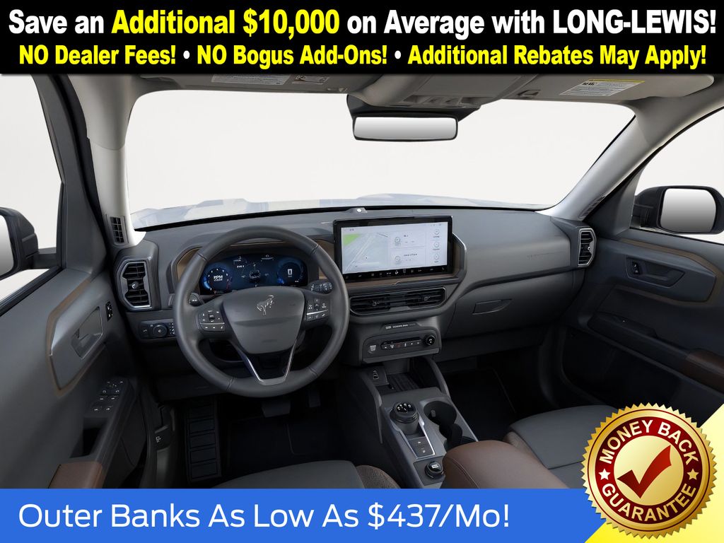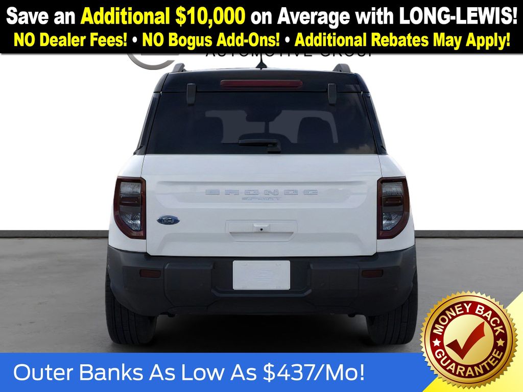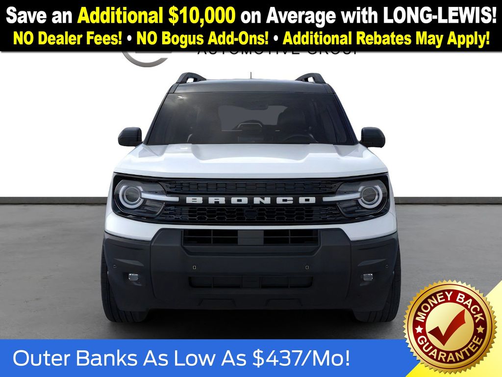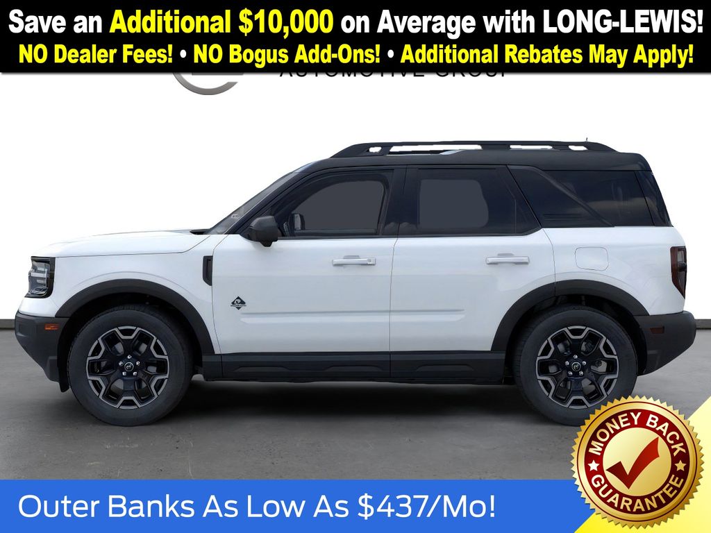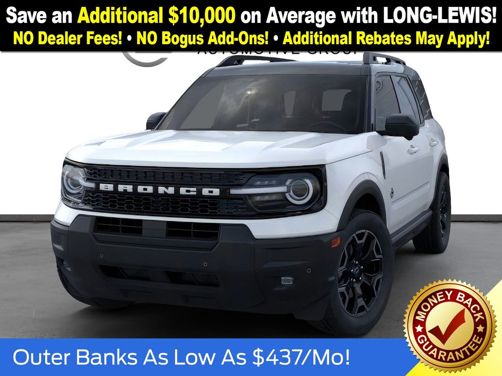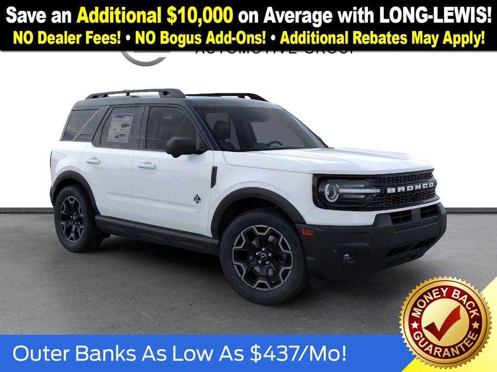 Oxford White 2025 Ford Bronco Sport Outer Banks fctp 4WD 8-Speed Automatic 1.5L EcoBoost 360-Degree Camera w/Trail & Split View, 4-Wheel Disc Brakes, 6 Speakers, ABS brakes, Air Conditioning, Alloy wheels, AM/FM radio: SiriusXM, AM/FM Stereo, Auto High-beam Headlights, Auto-dimming Rear-View mirror, Automatic temperature control, B&O Sound System by Bang & Olufsen, Brake assist, Compass, Connected Navigation, Delay-off headlights, Driver door bin, Driver vanity mirror, Dual front impact airbags, Dual front side impact airbags, Electronic Stability Control, Emergency communication system: SYNC 4 911 Assist, Four wheel independent suspension, Front anti-roll bar, Front Bucket Seats, Front Center Armrest, Front Driver/Passenger Seat Back Map Pockets, Front dual zone A/C, Front fog lights, Front License Plate Bracket, Front Parking Sensors, Front reading lights, Fully automatic headlights, Garage door transmitter, HD Radio, Heated door mirrors, Heated front seats, Heated steering wheel, Illuminated entry, Knee airbag, Low tire pressure warning, Memory seat, Occupant sensing airbag, Outer Banks Tech Package+, Outside temperature display, Overhead airbag, Overhead console, Panic alarm, Passenger door bin, Passenger vanity mirror, Power door mirrors, Power driver seat, Power Moonroof, Power passenger seat, Power steering, Power windows, Premium Trimmed Front Bucket Seats w/Ebony/Roast, Radio data system, Rain sensing wipers, Rear anti-roll bar, Rear Parking Sensors, Rear reading lights, Rear seat center armrest, Rear window defroster, Rear window wiper, Remote keyless entry, Reverse Brake Assist, Security system, SiriusXM, Speed control, Speed-sensing steering, Speed-Sensitive Wipers, Split folding rear seat, Steering wheel mounted audio controls, SYNC 4 w/Enhanced Voice Recognition, Tachometer, Telescoping steering wheel, Tilt steering wheel, Traction control, Trip computer, Variably intermittent wipers, Wheels: 18" Ebony Black-Painted Aluminum.