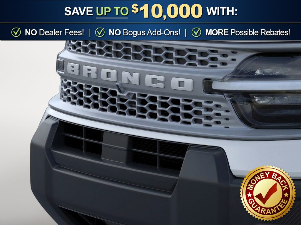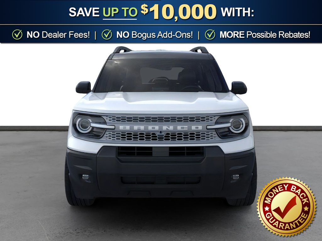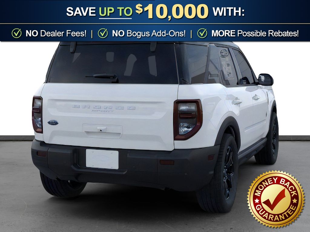 Oxford White 2025 Ford Bronco Sport Outer Banks fctp 4WD 8-Speed Automatic 1.5L EcoBoost 4-Wheel Disc Brakes, 6 Speakers, ABS brakes, Air Conditioning, Alloy wheels, AM/FM radio: SiriusXM, AM/FM Stereo, Auto High-beam Headlights, Auto-dimming Rear-View mirror, Automatic temperature control, Brake assist, Compass, Delay-off headlights, Driver door bin, Driver vanity mirror, Dual front impact airbags, Dual front side impact airbags, Electronic Stability Control, Emergency communication system: SYNC 4 911 Assist, Four wheel independent suspension, Front anti-roll bar, Front Bucket Seats, Front Center Armrest, Front Driver/Passenger Seat Back Map Pockets, Front dual zone A/C, Front fog lights, Front License Plate Bracket, Front reading lights, Fully automatic headlights, Garage door transmitter, Heated door mirrors, Heated front seats, Heated steering wheel, Illuminated entry, Knee airbag, Low tire pressure warning, Memory seat, Occupant sensing airbag, Outside temperature display, Overhead airbag, Overhead console, Panic alarm, Passenger door bin, Passenger vanity mirror, Power door mirrors, Power driver seat, Power passenger seat, Power steering, Power windows, Premium Trimmed Front Bucket Seats w/Ebony/Roast, Radio data system, Rain sensing wipers, Rear anti-roll bar, Rear Parking Sensors, Rear reading lights, Rear seat center armrest, Rear window defroster, Rear window wiper, Remote keyless entry, Security system, SiriusXM, Speed control, Speed-sensing steering, Speed-Sensitive Wipers, Split folding rear seat, Steering wheel mounted audio controls, SYNC 4 w/Enhanced Voice Recognition, Tachometer, Telescoping steering wheel, Tilt steering wheel, Traction control, Trip computer, Variably intermittent wipers, Wheels: 18" Ebony Black-Painted Aluminum.