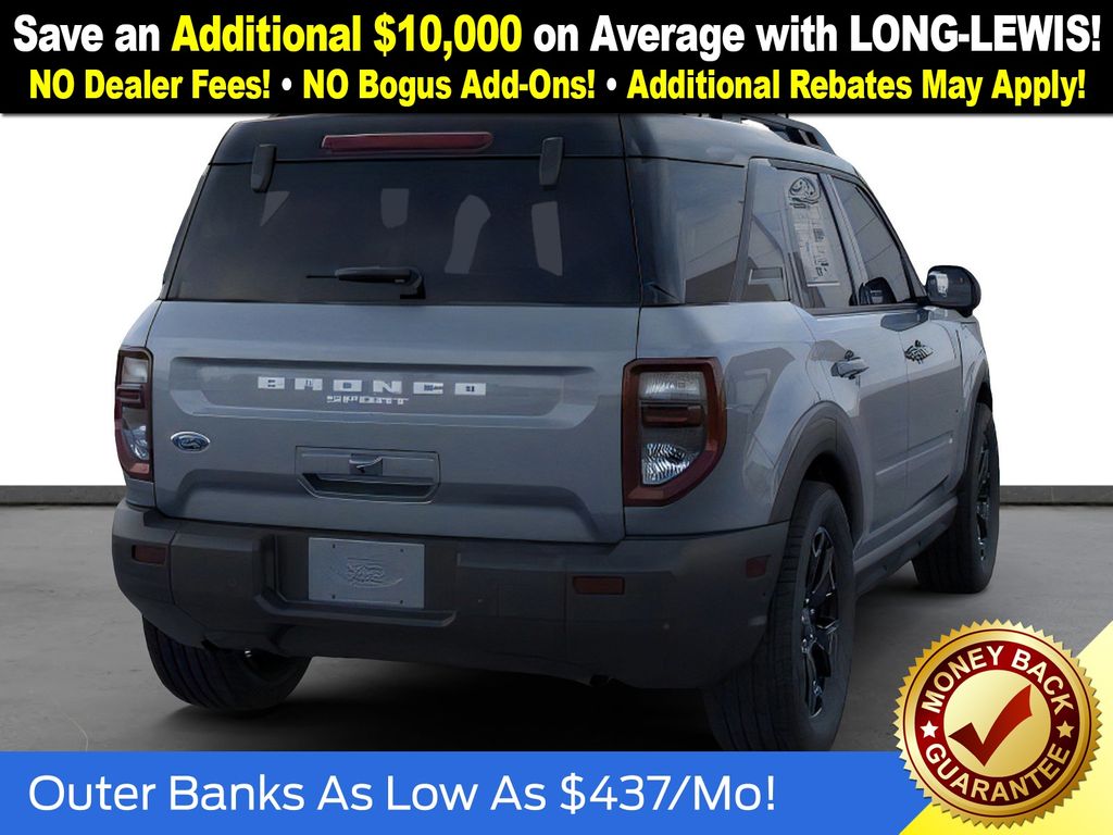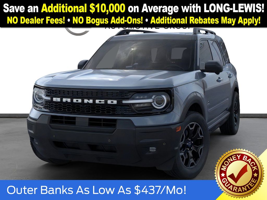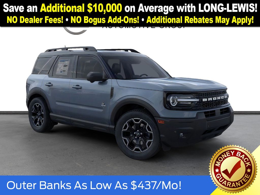 Azure Gray Metallic Tri-Coat 2025 Ford Bronco Sport Outer Banks FCT 4WD 8-Speed Automatic 1.5L EcoBoost 360-Degree Camera w/Trail & Split View, 4-Wheel Disc Brakes, 6 Speakers, ABS brakes, Air Conditioning, Alloy wheels, AM/FM radio: SiriusXM, AM/FM Stereo, Auto High-beam Headlights, Auto-dimming Rear-View mirror, Automatic temperature control, B&O Sound System by Bang & Olufsen, Brake assist, Compass, Connected Navigation, Delay-off headlights, Driver door bin, Driver vanity mirror, Dual front impact airbags, Dual front side impact airbags, Electronic Stability Control, Emergency communication system: SYNC 4 911 Assist, Four wheel independent suspension, Front anti-roll bar, Front Bucket Seats, Front Center Armrest, Front Driver/Passenger Seat Back Map Pockets, Front dual zone A/C, Front fog lights, Front License Plate Bracket, Front Parking Sensors, Front reading lights, Fully automatic headlights, Garage door transmitter, HD Radio, Heated door mirrors, Heated front seats, Heated steering wheel, Illuminated entry, Knee airbag, Low tire pressure warning, Memory seat, Occupant sensing airbag, Outer Banks Tech Package+, Outside temperature display, Overhead airbag, Overhead console, Panic alarm, Passenger door bin, Passenger vanity mirror, Power door mirrors, Power driver seat, Power Moonroof, Power passenger seat, Power steering, Power windows, Premium Trimmed Front Bucket Seats w/Ebony/Roast, Radio data system, Rain sensing wipers, Rear anti-roll bar, Rear Parking Sensors, Rear reading lights, Rear seat center armrest, Rear window defroster, Rear window wiper, Remote keyless entry, Reverse Brake Assist, Security system, SiriusXM, Speed control, Speed-sensing steering, Speed-Sensitive Wipers, Split folding rear seat, Steering wheel mounted audio controls, SYNC 4 w/Enhanced Voice Recognition, Tachometer, Telescoping steering wheel, Tilt steering wheel, Traction control, Trip computer, Variably intermittent wipers, Wheels: 18" Ebony Black-Painted Aluminum.