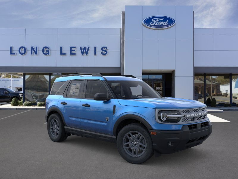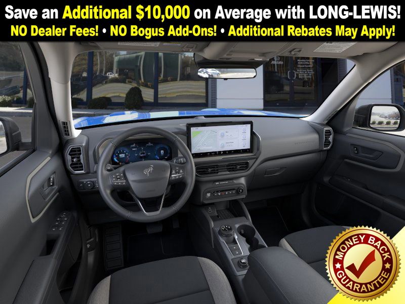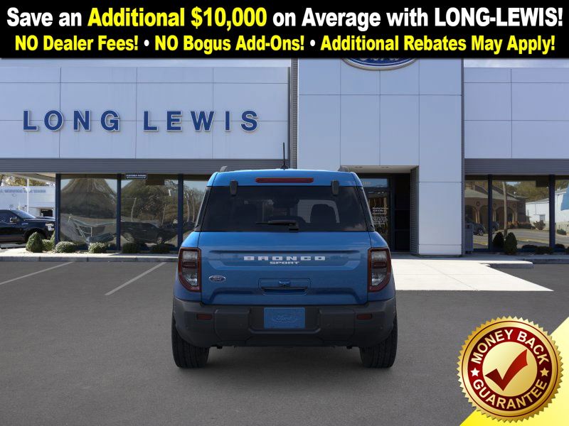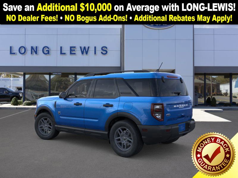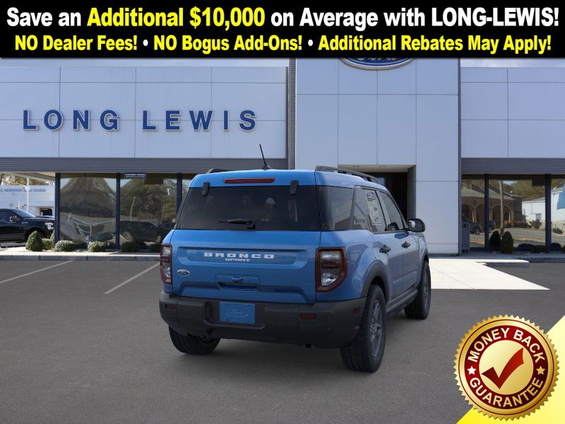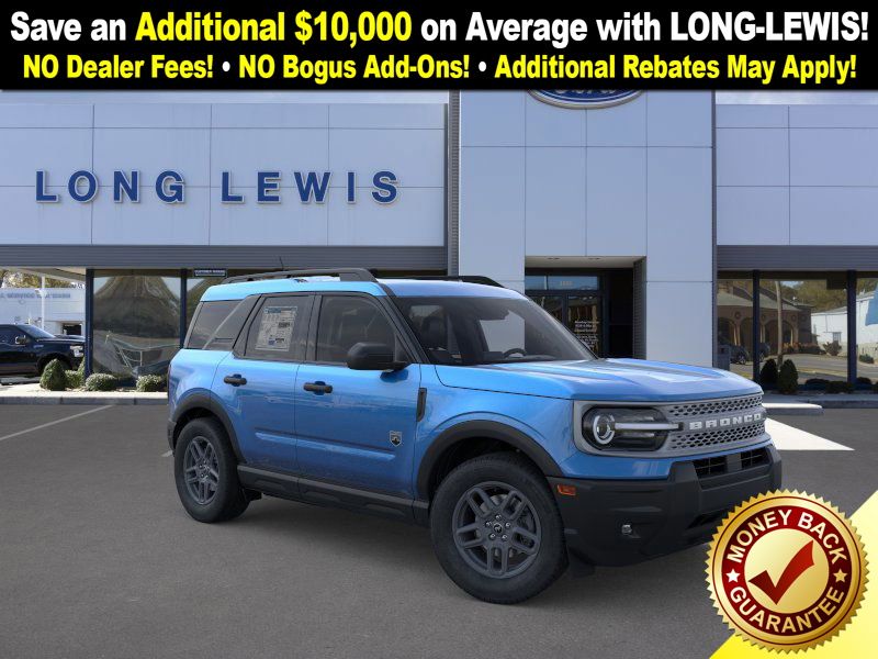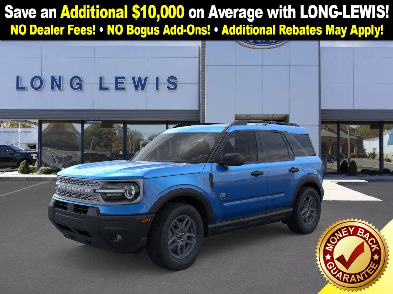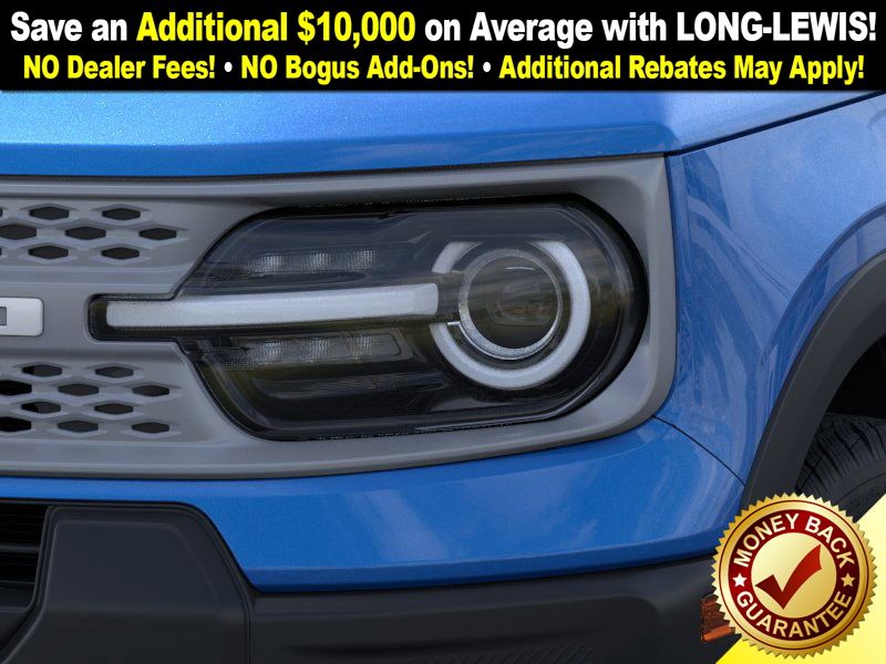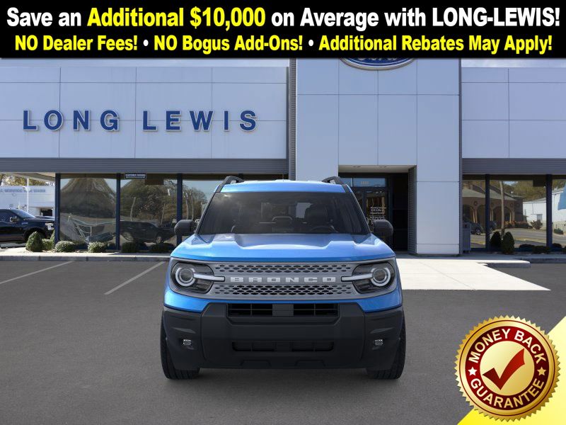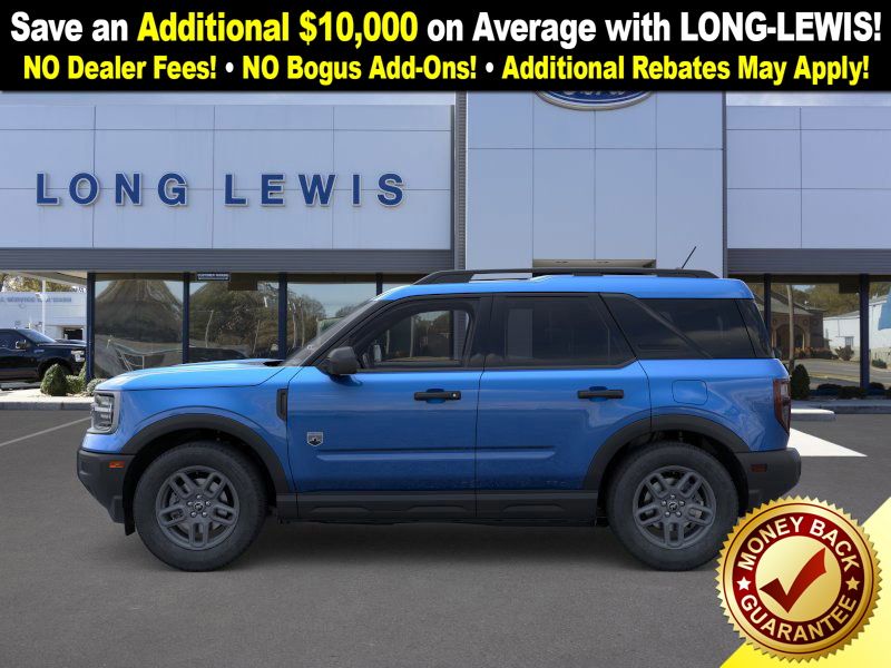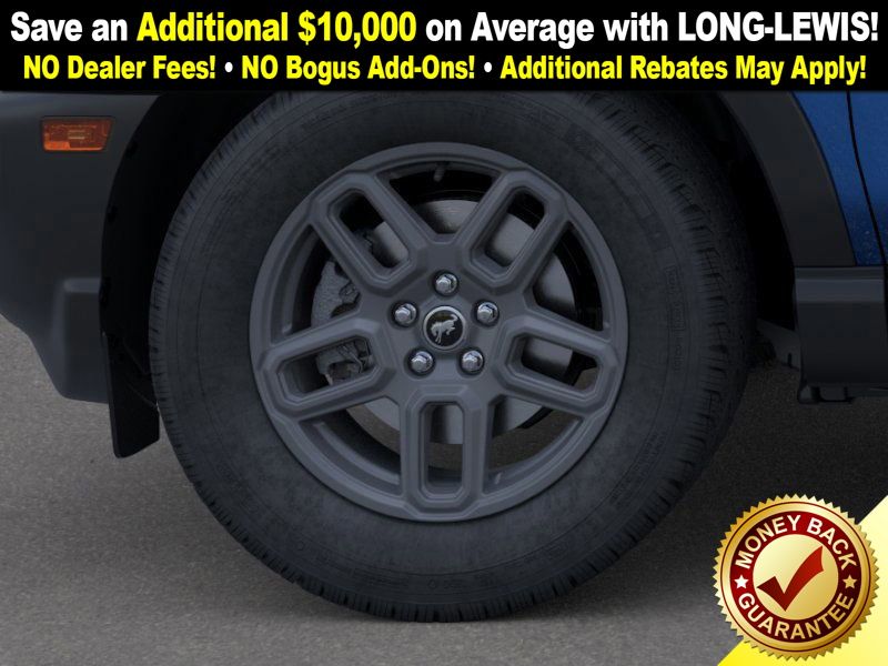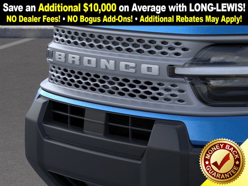 Velocity Blue Metallic 2025 Ford Bronco Sport Big Bend fctp 4WD 8-Speed Automatic 1.5L EcoBoost 4-Wheel Disc Brakes, 6 Speakers, ABS brakes, Air Conditioning, Alloy wheels, AM/FM radio: SiriusXM, AM/FM Stereo, Auto High-beam Headlights, Automatic temperature control, Brake assist, Cloth w/Easy-to-Clean Front Bucket Seats, Compass, Convenience Package, Delay-off headlights, Driver door bin, Driver vanity mirror, Dual front impact airbags, Dual front side impact airbags, Electronic Stability Control, Emergency communication system: SYNC 4 911 Assist, Four wheel independent suspension, Front anti-roll bar, Front Bucket Seats, Front Center Armrest, Front Driver/Passenger Seat Back Map Pockets, Front License Plate Bracket, Front reading lights, Fully automatic headlights, Heated 8-Way Power Driver's Seat, Heated door mirrors, Illuminated entry, Knee airbag, LED Fog Lamps, Low tire pressure warning, Occupant sensing airbag, Outside temperature display, Overhead airbag, Overhead console, Panic alarm, Passenger door bin, Passenger vanity mirror, Power door mirrors, Power steering, Power windows, Premium Wrapped Steering Wheel, Radio data system, Rear anti-roll bar, Rear Parking Sensors, Rear reading lights, Rear seat center armrest, Rear window defroster, Rear window wiper, Remote keyless entry, Security system, SiriusXM, Speed control, Speed-sensing steering, Speed-Sensitive Wipers, Split folding rear seat, Steering wheel mounted audio controls, SYNC 4 w/Enhanced Voice Recognition, Tachometer, Telescoping steering wheel, Tilt steering wheel, Traction control, Trip computer, Universal Garage Door Opener (UGDO), Variably intermittent wipers, Wheels: 17" Carbonized Gray-Painted Aluminum.
