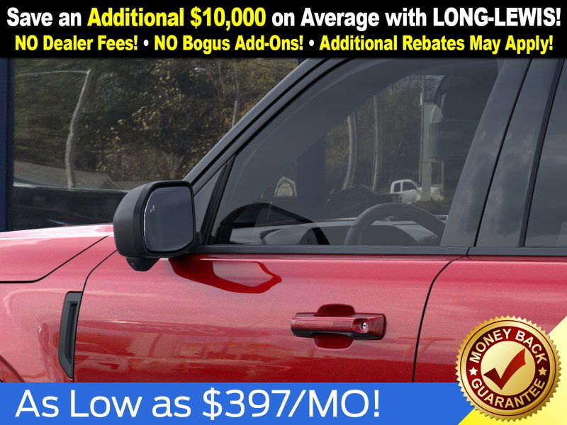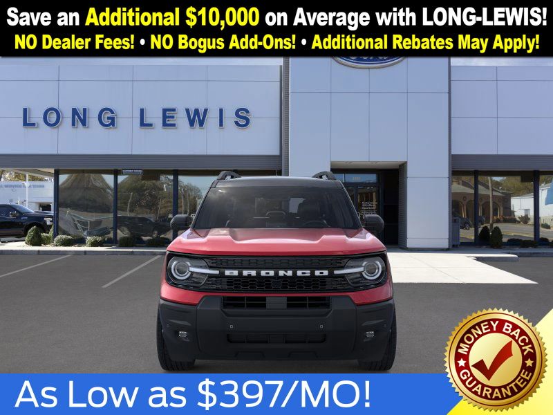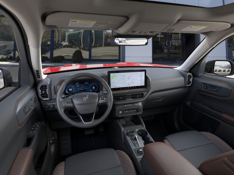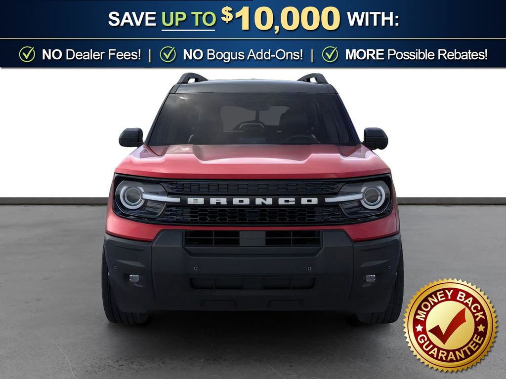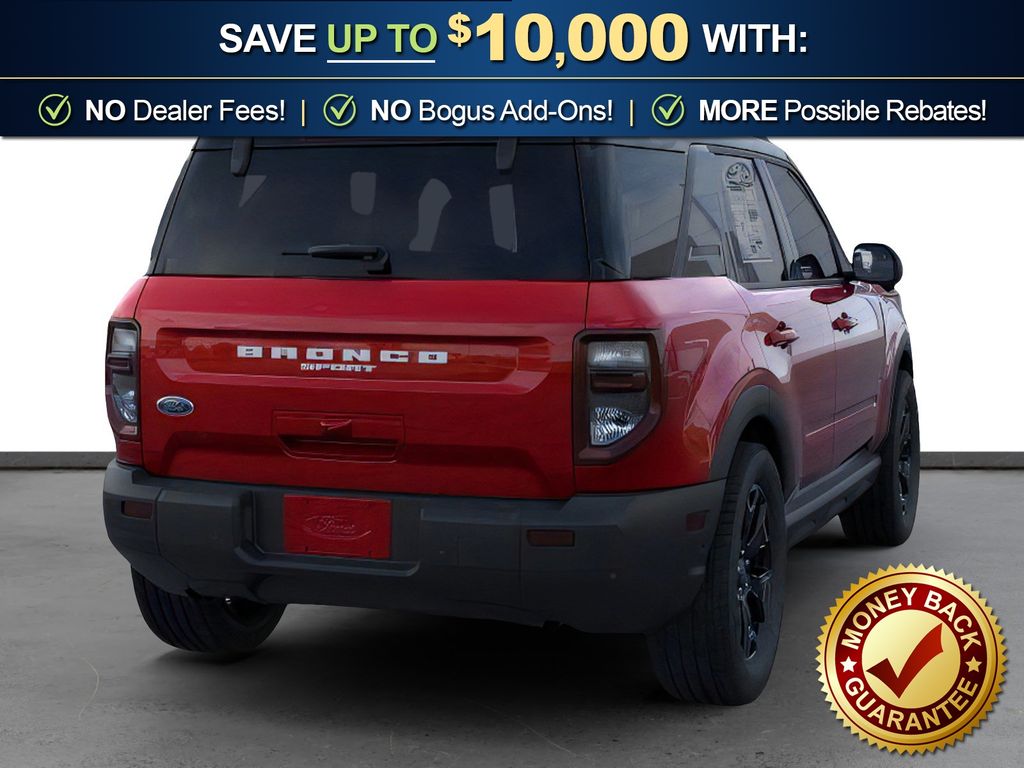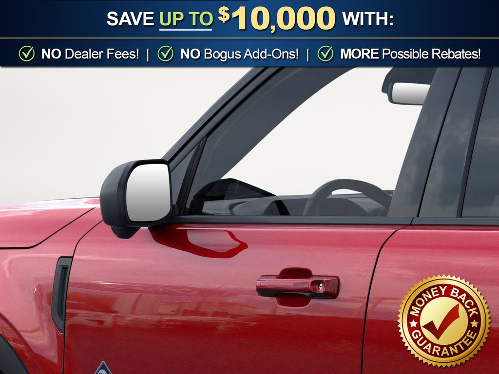 Ruby Red Metallic Tinted Clearcoat 2025 Ford Bronco Sport Outer Banks fctp 4WD 8-Speed Automatic 1.5L EcoBoost 360-Degree Camera w/Trail & Split View, 4-Wheel Disc Brakes, 6 Speakers, ABS brakes, Air Conditioning, Alloy wheels, AM/FM radio: SiriusXM, AM/FM Stereo, Auto High-beam Headlights, Auto-dimming Rear-View mirror, Automatic temperature control, B&O Sound System by Bang & Olufsen, Brake assist, Compass, Connected Navigation, Delay-off headlights, Driver door bin, Driver vanity mirror, Dual front impact airbags, Dual front side impact airbags, Electronic Stability Control, Emergency communication system: SYNC 4 911 Assist, Four wheel independent suspension, Front anti-roll bar, Front Bucket Seats, Front Center Armrest, Front Driver/Passenger Seat Back Map Pockets, Front dual zone A/C, Front fog lights, Front License Plate Bracket, Front Parking Sensors, Front reading lights, Fully automatic headlights, Garage door transmitter, HD Radio, Heated door mirrors, Heated front seats, Heated steering wheel, Illuminated entry, Knee airbag, Low tire pressure warning, Memory seat, Occupant sensing airbag, Outer Banks Tech Package+, Outside temperature display, Overhead airbag, Overhead console, Panic alarm, Passenger door bin, Passenger vanity mirror, Power door mirrors, Power driver seat, Power Moonroof, Power passenger seat, Power steering, Power windows, Premium Trimmed Front Bucket Seats w/Ebony/Roast, Radio data system, Rain sensing wipers, Rear anti-roll bar, Rear Parking Sensors, Rear reading lights, Rear seat center armrest, Rear window defroster, Rear window wiper, Remote keyless entry, Reverse Brake Assist, Security system, SiriusXM, Speed control, Speed-sensing steering, Speed-Sensitive Wipers, Split folding rear seat, Steering wheel mounted audio controls, SYNC 4 w/Enhanced Voice Recognition, Tachometer, Telescoping steering wheel, Tilt steering wheel, Traction control, Trip computer, Variably intermittent wipers, Wheels: 18" Ebony Black-Painted Aluminum.