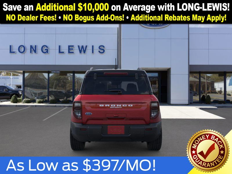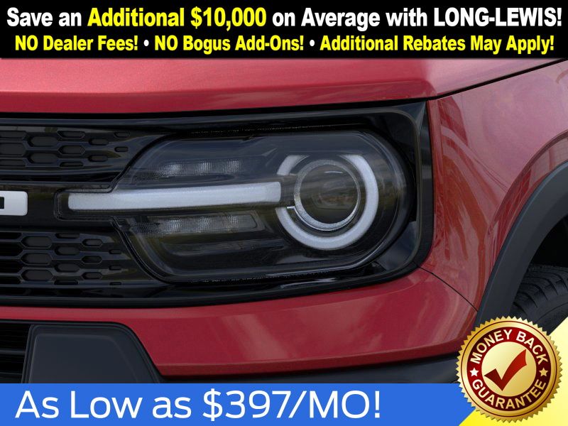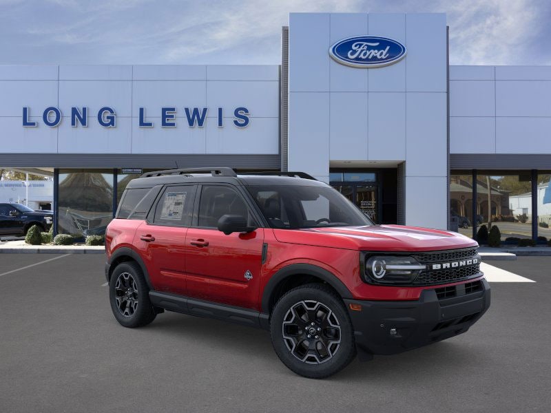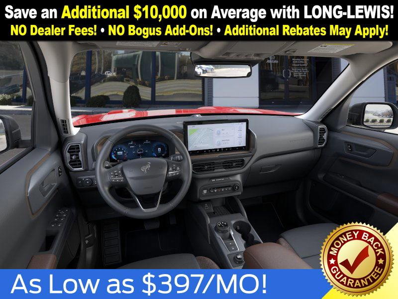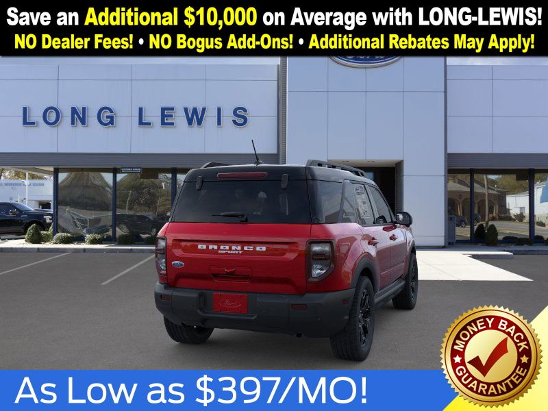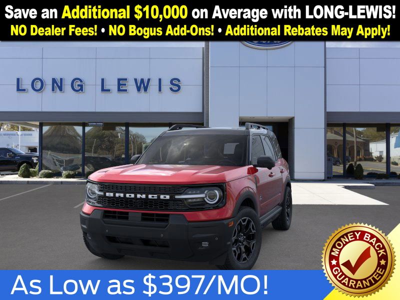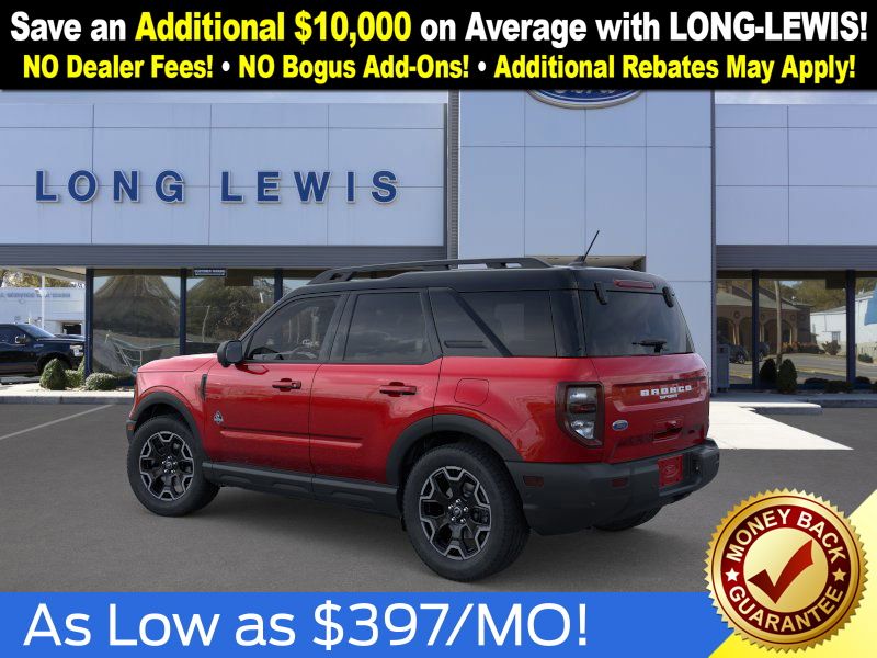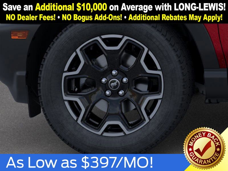 Ruby Red Metallic Tinted Clearcoat 2025 Ford Bronco Sport Outer Banks fctp 4WD 8-Speed Automatic 1.5L EcoBoost 360-Degree Camera w/Trail & Split View, 4-Wheel Disc Brakes, 6 Speakers, ABS brakes, Air Conditioning, Alloy wheels, AM/FM radio: SiriusXM, AM/FM Stereo, Auto High-beam Headlights, Auto-dimming Rear-View mirror, Automatic temperature control, B&O Sound System by Bang & Olufsen, Brake assist, Compass, Connected Navigation, Delay-off headlights, Driver door bin, Driver vanity mirror, Dual front impact airbags, Dual front side impact airbags, Electronic Stability Control, Emergency communication system: SYNC 4 911 Assist, Four wheel independent suspension, Front anti-roll bar, Front Bucket Seats, Front Center Armrest, Front Driver/Passenger Seat Back Map Pockets, Front dual zone A/C, Front fog lights, Front License Plate Bracket, Front Parking Sensors, Front reading lights, Fully automatic headlights, Garage door transmitter, HD Radio, Heated door mirrors, Heated front seats, Heated steering wheel, Illuminated entry, Knee airbag, Low tire pressure warning, Memory seat, Occupant sensing airbag, Outer Banks Tech Package+, Outside temperature display, Overhead airbag, Overhead console, Panic alarm, Passenger door bin, Passenger vanity mirror, Power door mirrors, Power driver seat, Power Moonroof, Power passenger seat, Power steering, Power windows, Premium Trimmed Front Bucket Seats w/Ebony/Roast, Radio data system, Rain sensing wipers, Rear anti-roll bar, Rear Parking Sensors, Rear reading lights, Rear seat center armrest, Rear window defroster, Rear window wiper, Remote keyless entry, Reverse Brake Assist, Security system, SiriusXM, Speed control, Speed-sensing steering, Speed-Sensitive Wipers, Split folding rear seat, Steering wheel mounted audio controls, SYNC 4 w/Enhanced Voice Recognition, Tachometer, Telescoping steering wheel, Tilt steering wheel, Traction control, Trip computer, Variably intermittent wipers, Wheels: 18" Ebony Black-Painted Aluminum.