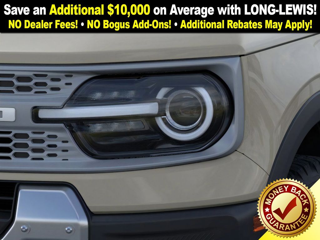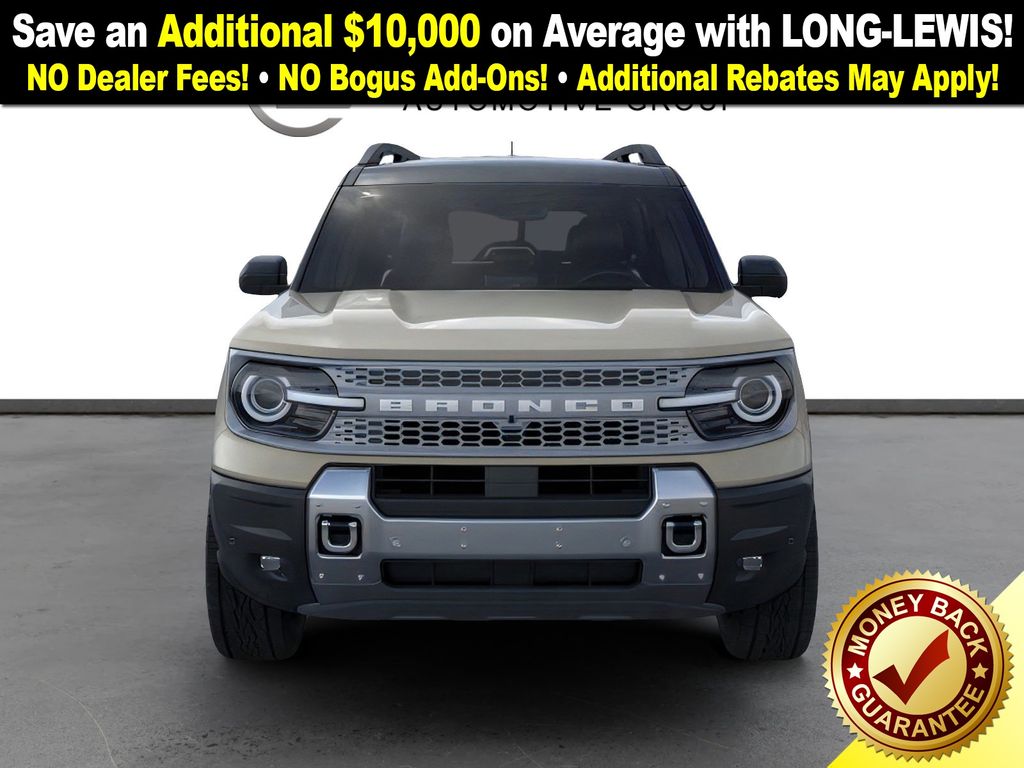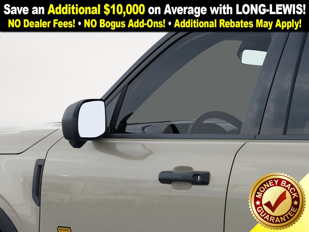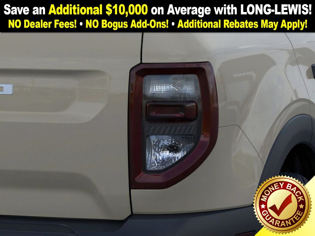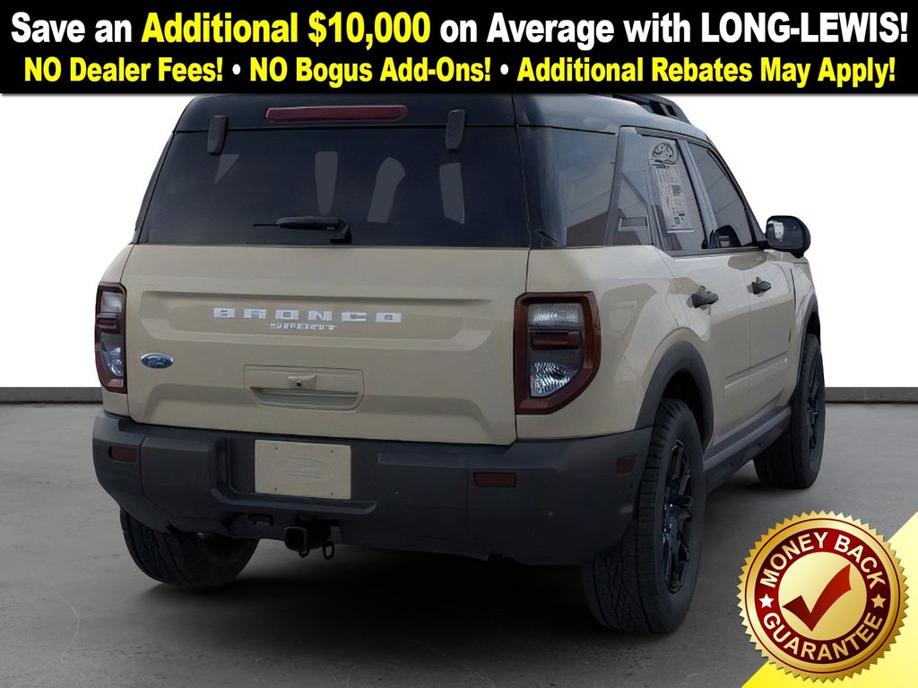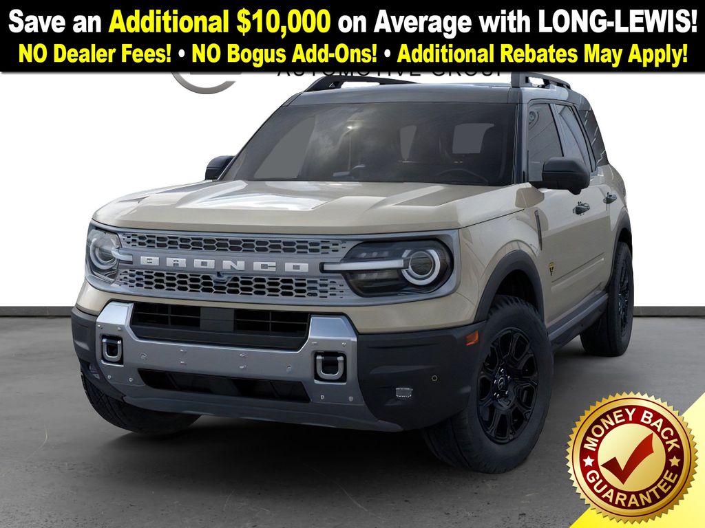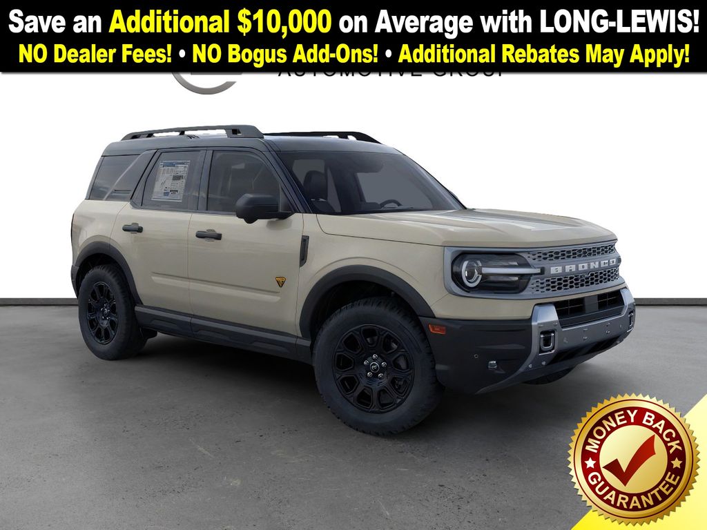 Desert Sand 2025 Ford Bronco Sport Badlands FCT 4WD 8-Speed Automatic EcoBoost 2.0L I4 GTDi DOHC Turbocharged VCT 4-Wheel Disc Brakes, 6 Speakers, ABS brakes, Air Conditioning, Alloy wheels, AM/FM radio: SiriusXM, AM/FM Stereo, Auto High-beam Headlights, Auto-dimming Rear-View mirror, Automatic temperature control, B&O Sound System by Bang & Olufsen, Badlands Tech Package, Brake assist, Compass, Connected Navigation, Delay-off headlights, Driver door bin, Driver vanity mirror, Dual front impact airbags, Dual front side impact airbags, Electronic Stability Control, Emergency communication system: SYNC 4 911 Assist, Four wheel independent suspension, Front anti-roll bar, Front Bucket Seats, Front Center Armrest, Front fog lights, Front License Plate Bracket, Front reading lights, Fully automatic headlights, Garage door transmitter, HD Radio, Heated door mirrors, Heated front seats, Heated steering wheel, Illuminated entry, Knee airbag, Leather Trimmed Front Bucket Seats, Low tire pressure warning, Memory seat, Occupant sensing airbag, Outside temperature display, Overhead airbag, Overhead console, Panic alarm, Passenger door bin, Passenger vanity mirror, Power door mirrors, Power driver seat, Power Moonroof, Power passenger seat, Power steering, Power windows, Radio data system, Rear anti-roll bar, Rear reading lights, Rear seat center armrest, Rear window defroster, Rear window wiper, Remote keyless entry, Security system, SiriusXM, Speed control, Speed-sensing steering, Speed-Sensitive Wipers, Split folding rear seat, Steering wheel mounted audio controls, SYNC 4 w/Enhanced Voice Recognition, Tachometer, Telescoping steering wheel, Tilt steering wheel, Traction control, Trip computer, Variably intermittent wipers, Wheels: 17" Matte Black-Painted Aluminum.