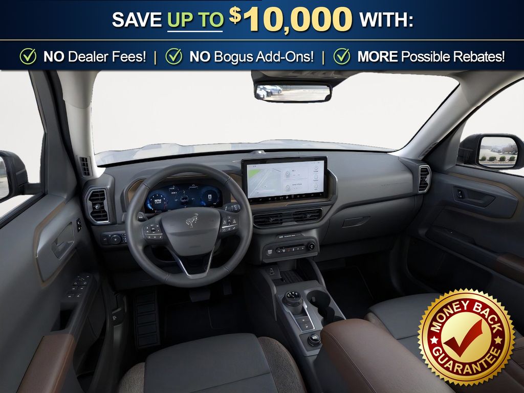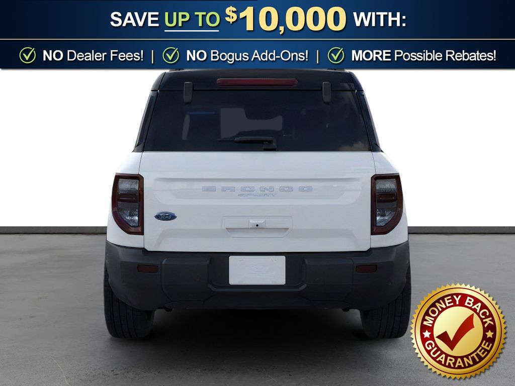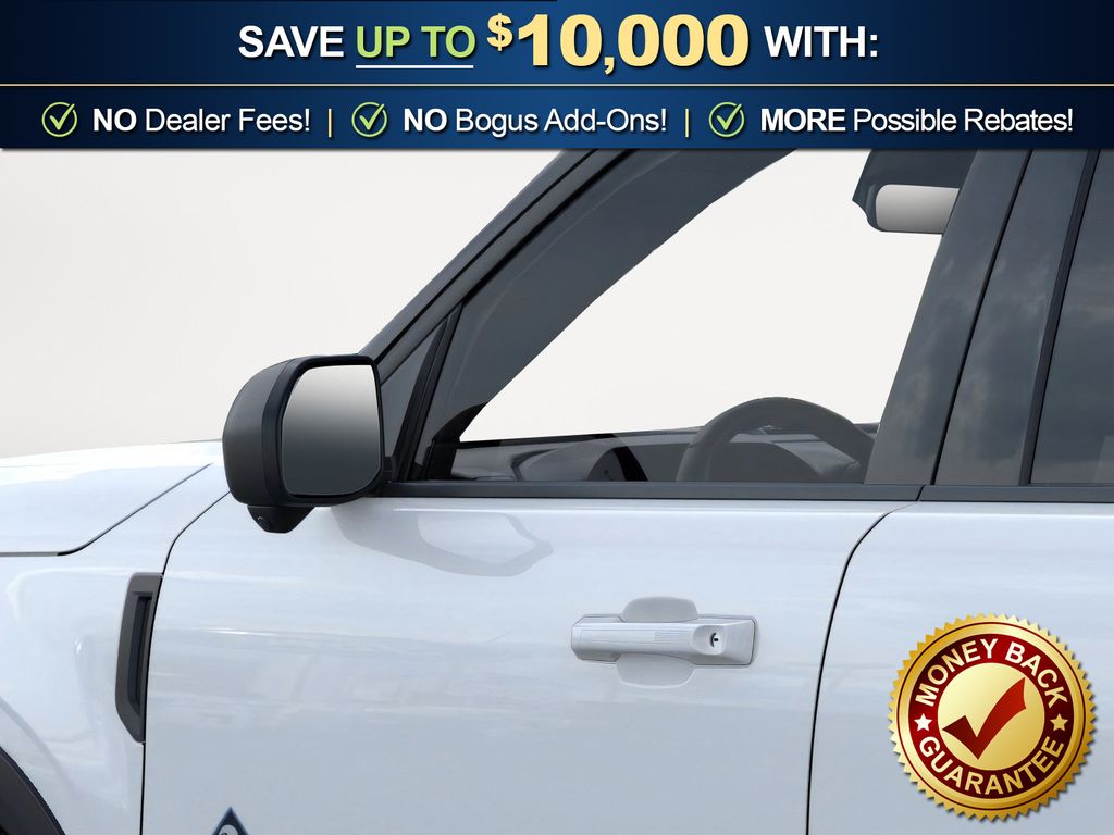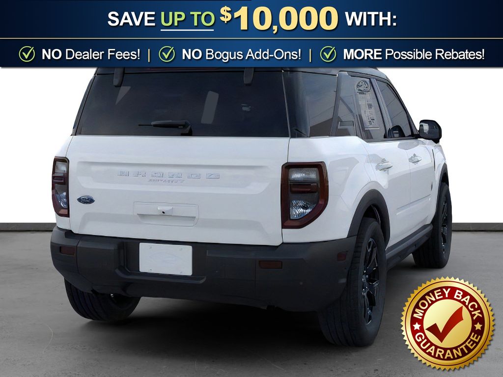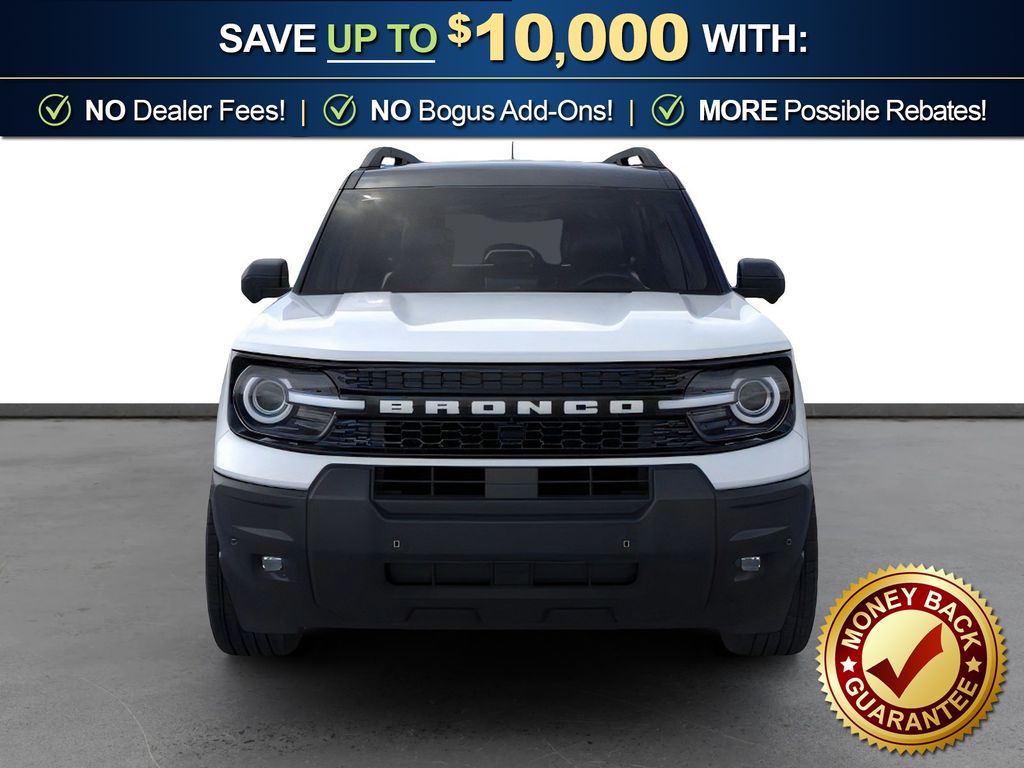 Oxford White 2025 Ford Bronco Sport Outer Banks FCT 4WD 8-Speed Automatic 1.5L EcoBoost 360-Degree Camera w/Trail & Split View, 4-Wheel Disc Brakes, 6 Speakers, ABS brakes, Air Conditioning, Alloy wheels, AM/FM radio: SiriusXM, AM/FM Stereo, Auto High-beam Headlights, Auto-dimming Rear-View mirror, Automatic temperature control, B&O Sound System by Bang & Olufsen, Brake assist, Compass, Connected Navigation, Delay-off headlights, Driver door bin, Driver vanity mirror, Dual front impact airbags, Dual front side impact airbags, Electronic Stability Control, Emergency communication system: SYNC 4 911 Assist, Equipment Group 300A, Four wheel independent suspension, Front anti-roll bar, Front Bucket Seats, Front Center Armrest, Front Driver/Passenger Seat Back Map Pockets, Front dual zone A/C, Front fog lights, Front License Plate Bracket, Front Parking Sensors, Front reading lights, Fully automatic headlights, Garage door transmitter, HD Radio, Heated door mirrors, Heated front seats, Heated steering wheel, Illuminated entry, Knee airbag, Low tire pressure warning, Memory seat, Occupant sensing airbag, Outer Banks Tech Package+, Outside temperature display, Overhead airbag, Overhead console, Panic alarm, Passenger door bin, Passenger vanity mirror, Power door mirrors, Power driver seat, Power Moonroof, Power passenger seat, Power steering, Power windows, Premium Trimmed Front Bucket Seats w/Ebony/Roast, Radio data system, Rain sensing wipers, Rear anti-roll bar, Rear Parking Sensors, Rear reading lights, Rear seat center armrest, Rear window defroster, Rear window wiper, Remote keyless entry, Reverse Brake Assist, Security system, SiriusXM, Speed control, Speed-sensing steering, Speed-Sensitive Wipers, Split folding rear seat, Steering wheel mounted audio controls, SYNC 4 w/Enhanced Voice Recognition, Tachometer, Telescoping steering wheel, Tilt steering wheel, Traction control, Trip computer, Variably intermittent wipers, Wheels: 18" Ebony Black-Painted Aluminum.