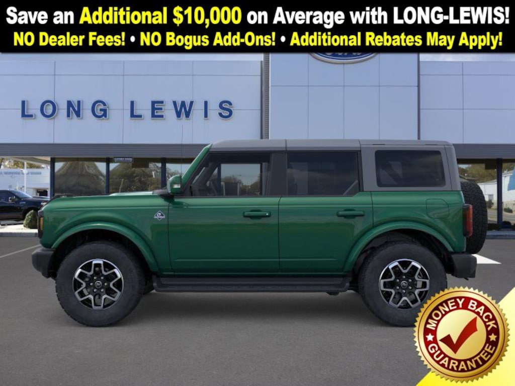 Eruption Green Metallic 2025 Ford Bronco Outer Banks 4WD 10-Speed Automatic 2.7L EcoBoost V6 18" Bright Machined Aluminum Wheels, 3.73 Axle Ratio, 4-Wheel Disc Brakes, 7 Speakers, ABS brakes, Air Conditioning, Alloy wheels, AM/FM radio: SiriusXM with 360L, AM/FM Stereo, Auto High-beam Headlights, Auto-dimming Rear-View mirror, Automatic temperature control, Brake assist, Carbonized Gray Molded-In-Color Hard Top, Compass, Connected Navigation, Delay-off headlights, Driver door bin, Driver vanity mirror, Dual front impact airbags, Dual front side impact airbags, Electronic Stability Control, Emergency communication system: 911 Assist, Exterior Parking Camera Rear, Front anti-roll bar, Front Bucket Seats, Front Center Armrest, Front dual zone A/C, Front fog lights, Front License Plate Bracket, Front reading lights, Front wheel independent suspension, Fully automatic headlights, Hard Top Sound Deadening Headliner, Heated door mirrors, Heated front seats, Heated Leather-Trimmed/Vinyl Bucket Seats, Heated steering wheel, Illuminated entry, Integrated roll-over protection, Leather Shift Knob, Low tire pressure warning, Navigation system: Connected Navigation, Occupant sensing airbag, Outside temperature display, Overhead airbag, Overhead console, Panic alarm, Passenger door bin, Passenger vanity mirror, Power door mirrors, Power driver seat, Power passenger seat, Power steering, Power windows, Radio data system, Rear seat center armrest, Rear-Window Defroster & Washer, Remote keyless entry, Security system, SiriusXM w/360L, Speed control, Split folding rear seat, Steering wheel mounted audio controls, SYNC 4, Tachometer, Telescoping steering wheel, Tilt steering wheel, Traction control, Trip computer, Variably intermittent wipers, Voltmeter.