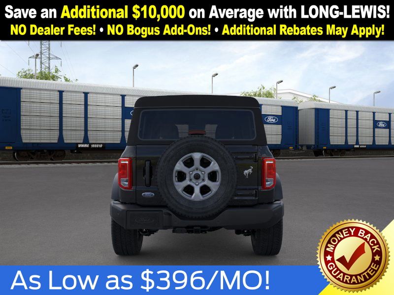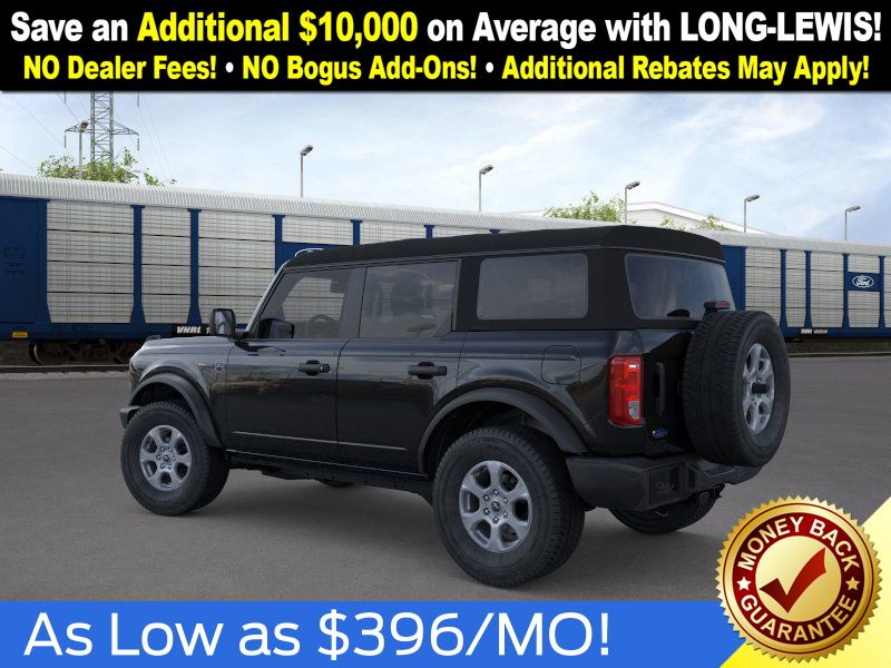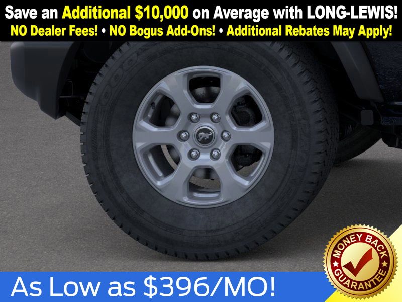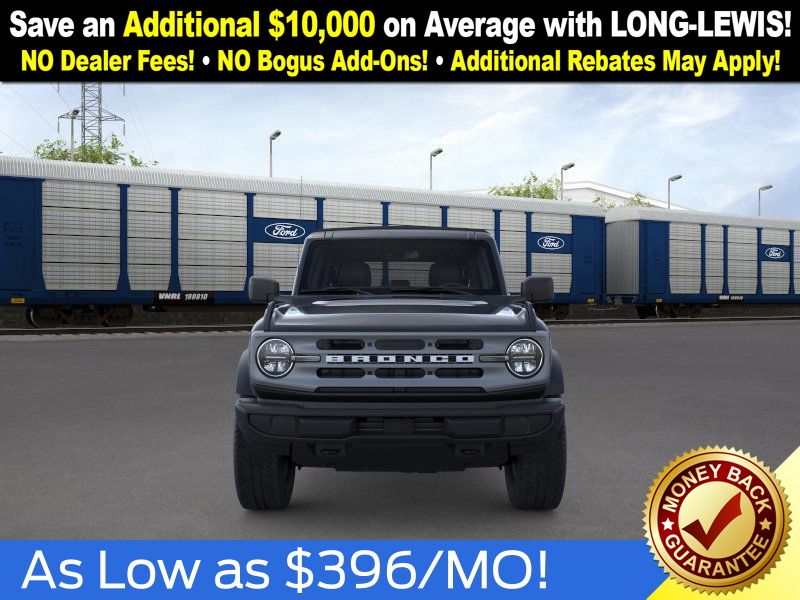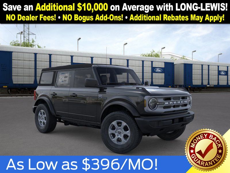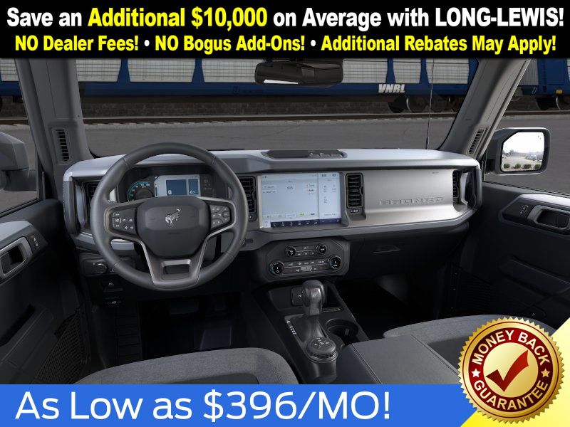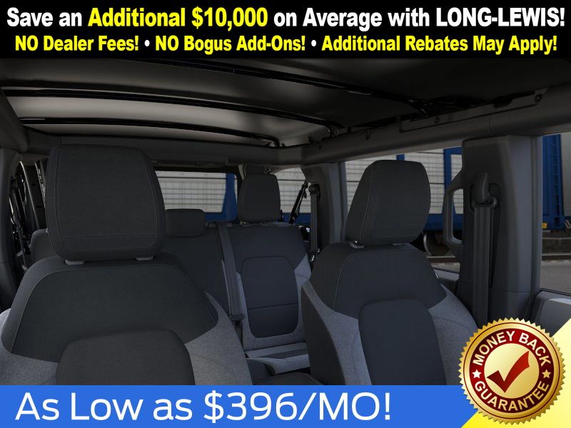 Shadow Black 2025 Ford Bronco Big Bend NFT 4WD 10-Speed Automatic 2.3L EcoBoost I-4 4-Wheel Disc Brakes, 4.46 Axle Ratio, 7 Speakers, ABS brakes, Air Conditioning, Alloy wheels, AM/FM radio: SiriusXM with 360L, AM/FM Stereo, Auto High-beam Headlights, Brake assist, Cloth Bucket Seats, Compass, Delay-off headlights, Driver door bin, Driver vanity mirror, Dual front impact airbags, Dual front side impact airbags, Electronic Stability Control, Emergency communication system: 911 Assist, Exterior Parking Camera Rear, Front anti-roll bar, Front Bucket Seats, Front Center Armrest, Front License Plate Bracket, Front reading lights, Front wheel independent suspension, Fully automatic headlights, Heated door mirrors, Illuminated entry, Integrated roll-over protection, Internet access capable: FordPass Connect, Leather Shift Knob, Low tire pressure warning, Occupant sensing airbag, Outside temperature display, Overhead airbag, Overhead console, Panic alarm, Passenger door bin, Passenger vanity mirror, Power door mirrors, Power steering, Power windows, Radio data system, Remote keyless entry, Security system, SiriusXM w/360L, Speed control, Split folding rear seat, Steering wheel mounted audio controls, SYNC 4, Tachometer, Telescoping steering wheel, Tilt steering wheel, Traction control, Trip computer, Variably intermittent wipers, Wheels: 17" Carbonized Gray-Painted Aluminum.