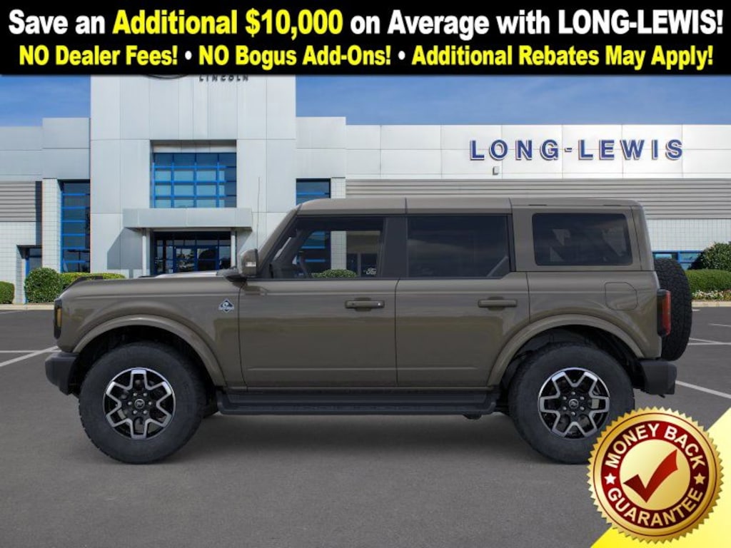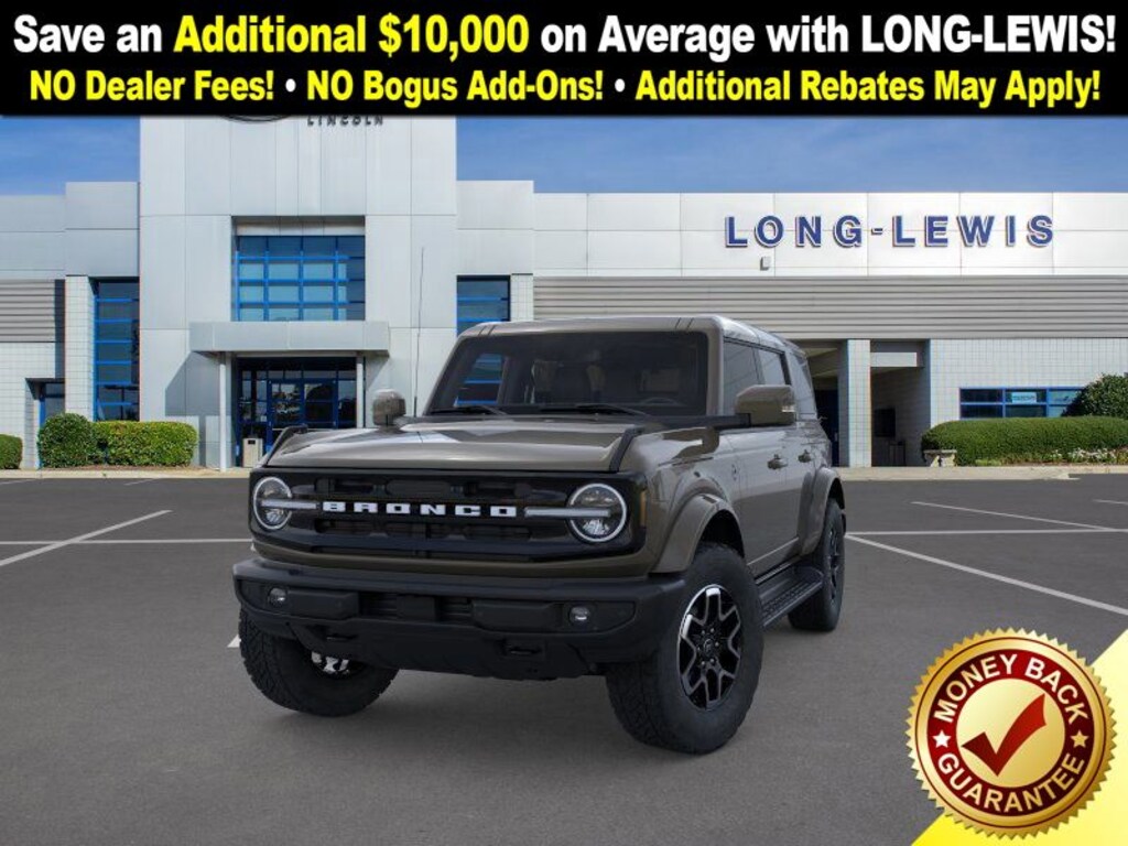 Dealer Discount of $3,173 off MSRP Marsh Gray 2025 Ford Bronco Outer Banks fctp 4WD 10-Speed Automatic 2.7L EcoBoost V6 18" Bright Machined Aluminum Wheels, 3.73 Axle Ratio, 4-Wheel Disc Brakes, 7 Speakers, ABS brakes, Air Conditioning, Alloy wheels, AM/FM radio: SiriusXM with 360L, AM/FM Stereo, Auto High-beam Headlights, Auto-dimming Rear-View mirror, Automatic temperature control, Brake assist, Compass, Connected Navigation, Delay-off headlights, Driver door bin, Driver vanity mirror, Dual front impact airbags, Dual front side impact airbags, Electronic Stability Control, Emergency communication system: 911 Assist, Exterior Parking Camera Rear, Front anti-roll bar, Front Bucket Seats, Front Center Armrest, Front dual zone A/C, Front fog lights, Front License Plate Bracket, Front reading lights, Front wheel independent suspension, Fully automatic headlights, Hard Top Sound Deadening Headliner, Heated door mirrors, Heated front seats, Heated Leather-Trimmed/Vinyl Bucket Seats, Heated steering wheel, Illuminated entry, Integrated roll-over protection, Leather Shift Knob, Low tire pressure warning, Navigation system: Connected Navigation, Occupant sensing airbag, Outside temperature display, Overhead airbag, Overhead console, Painted Hard Top, Panic alarm, Passenger door bin, Passenger vanity mirror, Power door mirrors, Power driver seat, Power passenger seat, Power steering, Power windows, Radio data system, Rear seat center armrest, Rear-Window Defroster & Washer, Remote keyless entry, Security system, SiriusXM w/360L, Speed control, Split folding rear seat, Steering wheel mounted audio controls, SYNC 4, Tachometer, Telescoping steering wheel, Tilt steering wheel, Traction control, Trip computer, Variably intermittent wipers, Voltmeter. Price includes: $2000 - Retail Bonus Cash. Exp. 01/05/2026