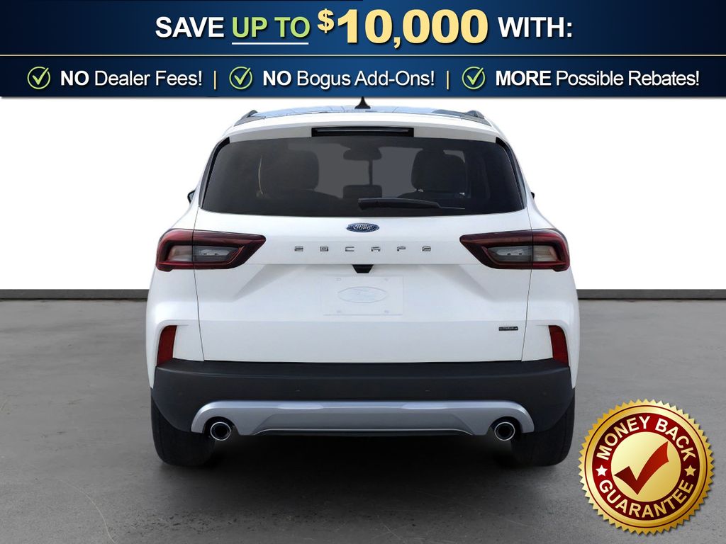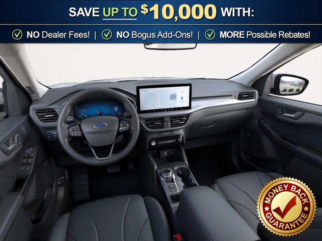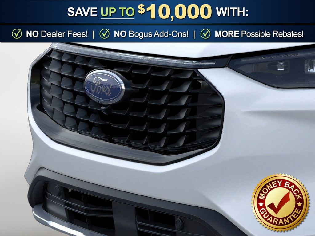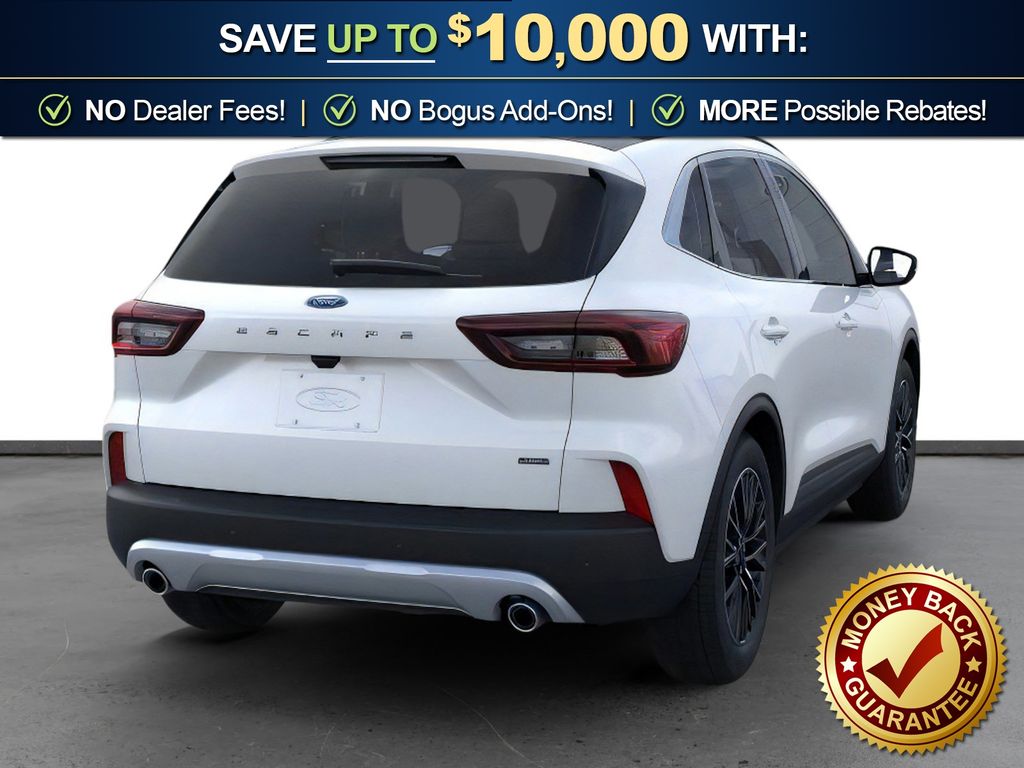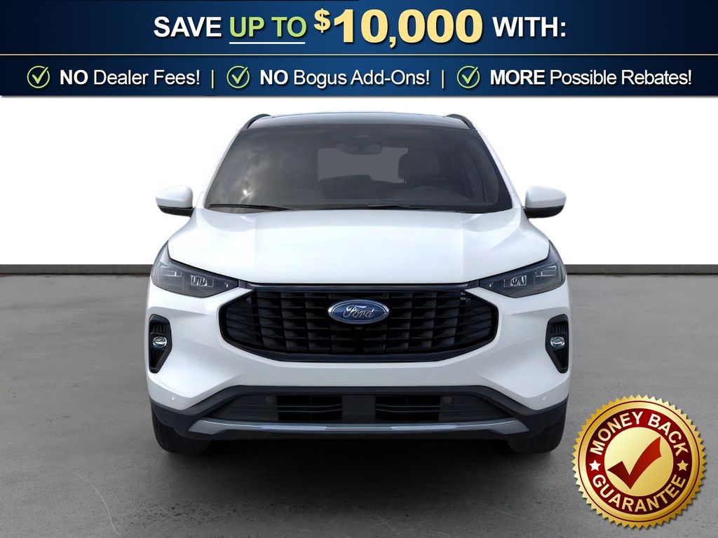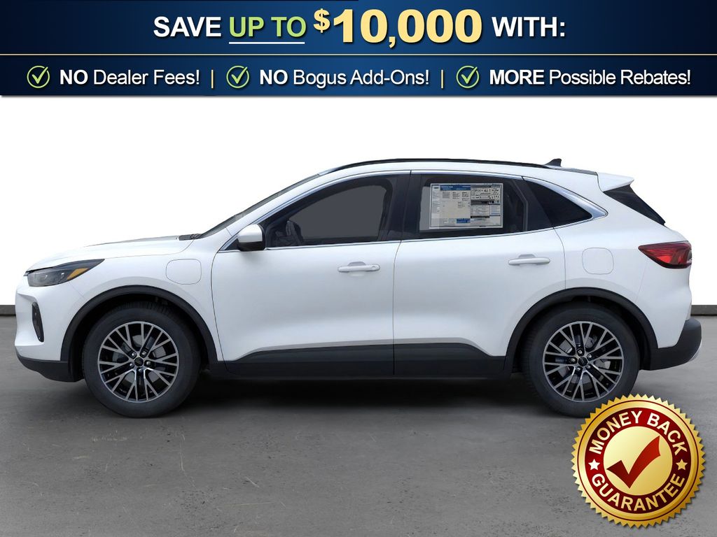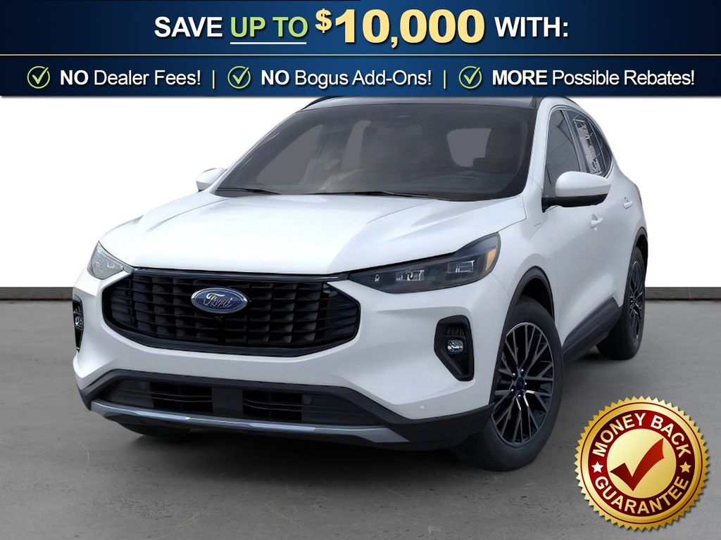 Star White Metallic Tri-Coat 2025 Ford Escape Plug-In Hybrid fctp FWD eCVT 2.5L iVCT 2.5L iVCT, 10-Way Power Driver's Seat, 12.3" Productivity Screen in Instrument Cluster, 2.91 Axle Ratio, 360-Degree Camera w/Split View, 4-Wheel Disc Brakes, 6 Speakers, 6-Way Power Passenger Seat, ABS brakes, Air Conditioning, Alloy wheels, AM/FM radio: SiriusXM, AM/FM Stereo, Auto High-beam Headlights, Auto-Dimming Rear-View Mirror, Automatic temperature control, Black Roof-Rack Side Rails, Brake assist, Bumpers: body-color, Compass, Delay-off headlights, Driver door bin, Driver vanity mirror, Dual front impact airbags, Dual front side impact airbags, Electronic Stability Control, Emergency communication system: SYNC 4 911 Assist, FordPass Connect, Four wheel independent suspension, Front anti-roll bar, Front Bucket Seats, Front Center Armrest, Front dual zone A/C, Front fog lights, Front License Plate Bracket, Front Parking Sensors, Front reading lights, Fully automatic headlights, HD Radio, Head-Up Display, Heated ActiveX-Trimmed Front Sport Contour Seats, Heated door mirrors, Heated front seats, Heated steering wheel, Heated Vinyl/Cloth Front Sport Contour Bucket Seats, Illuminated entry, Knee airbag, LED Lightbar Headlamps, Low tire pressure warning, Memory Package, Navigation system: Connected Navigation, Occupant sensing airbag, Outside temperature display, Overhead airbag, Overhead console, Panic alarm, Panoramic Vista Roof, Passenger door bin, Passenger vanity mirror, Perimeter Alarm, PHEV Premium Package, Power door mirrors, Power driver seat, Power Liftgate, Power steering, Power windows, Radio data system, Radio: B&O Sound System by Bang & Olufsen, Rear anti-roll bar, Rear reading lights, Rear seat center armrest, Rear window defroster, Rear window wiper, Remote keyless entry, Reverse Brake Assist, Speed control, Speed-sensing steering, Speed-Sensitive Wipers, Split folding rear seat, Spoiler, Steering wheel mounted audio controls, SYNC 4 w/Enhanced Voice Recognition, Telescoping steering wheel, Tilt steering wheel, Traction control, Trip computer, Universal Garage Door Opener (UGDO), Variably intermittent wipers, Wheels: 18" Machined-Face Magnetic Aluminum, Wireless Charging Pad, 2.5L iVCT.