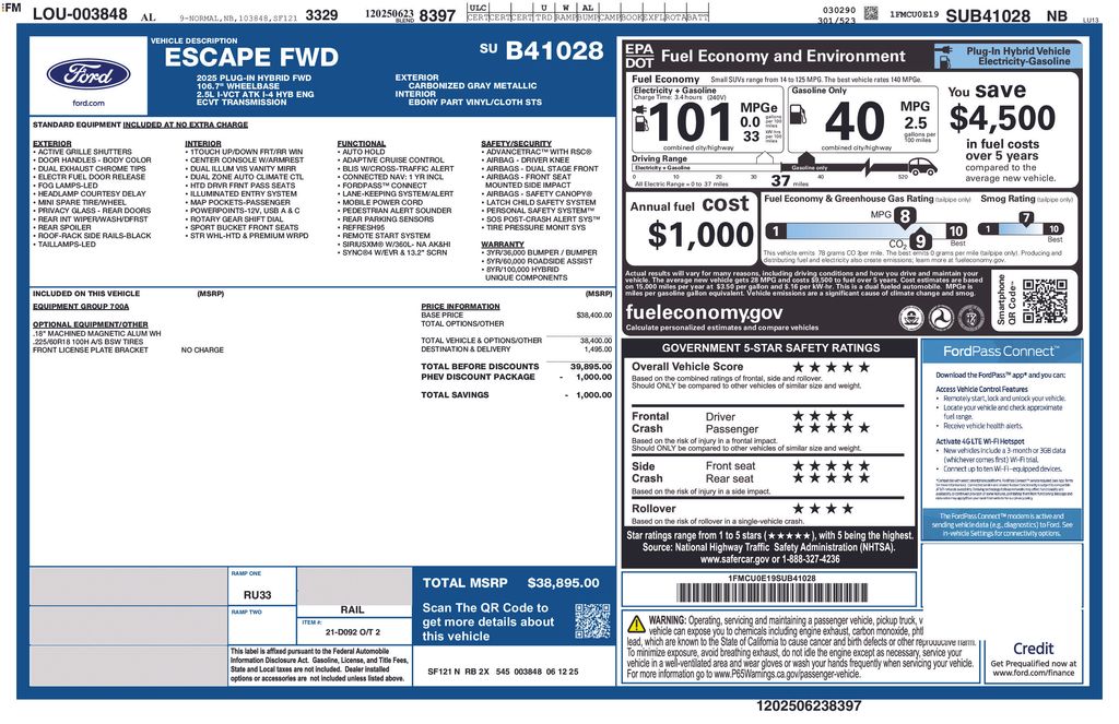 Carbonized Gray Metallic 2025 Ford Escape Plug-In Hybrid fctp FWD eCVT 2.5L iVCT 2.5L iVCT, 2.91 Axle Ratio, 4-Wheel Disc Brakes, 6 Speakers, ABS brakes, Air Conditioning, Alloy wheels, AM/FM radio: SiriusXM, AM/FM Stereo, Auto High-beam Headlights, Automatic temperature control, Brake assist, Bumpers: body-color, Compass, Delay-off headlights, Driver door bin, Driver vanity mirror, Dual front impact airbags, Dual front side impact airbags, Electronic Stability Control, Emergency communication system: SYNC 4 911 Assist, FordPass Connect, Four wheel independent suspension, Front anti-roll bar, Front Bucket Seats, Front Center Armrest, Front dual zone A/C, Front fog lights, Front License Plate Bracket, Front reading lights, Fully automatic headlights, Heated door mirrors, Heated front seats, Heated steering wheel, Heated Vinyl/Cloth Front Sport Contour Bucket Seats, Illuminated entry, Knee airbag, Low tire pressure warning, Navigation system: Connected Navigation, Occupant sensing airbag, Outside temperature display, Overhead airbag, Overhead console, Panic alarm, Passenger door bin, Passenger vanity mirror, Power door mirrors, Power driver seat, Power Liftgate, Power steering, Power windows, Radio data system, Rear anti-roll bar, Rear reading lights, Rear seat center armrest, Rear window defroster, Rear window wiper, Remote keyless entry, Speed control, Speed-sensing steering, Speed-Sensitive Wipers, Split folding rear seat, Spoiler, Steering wheel mounted audio controls, SYNC 4 w/Enhanced Voice Recognition, Telescoping steering wheel, Tilt steering wheel, Traction control, Trip computer, Variably intermittent wipers, Wheels: 18" Machined-Face Magnetic Aluminum, 2.5L iVCT.