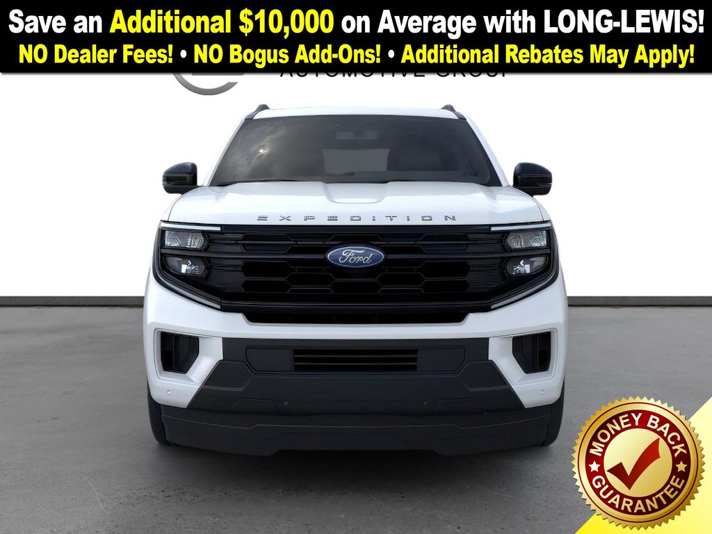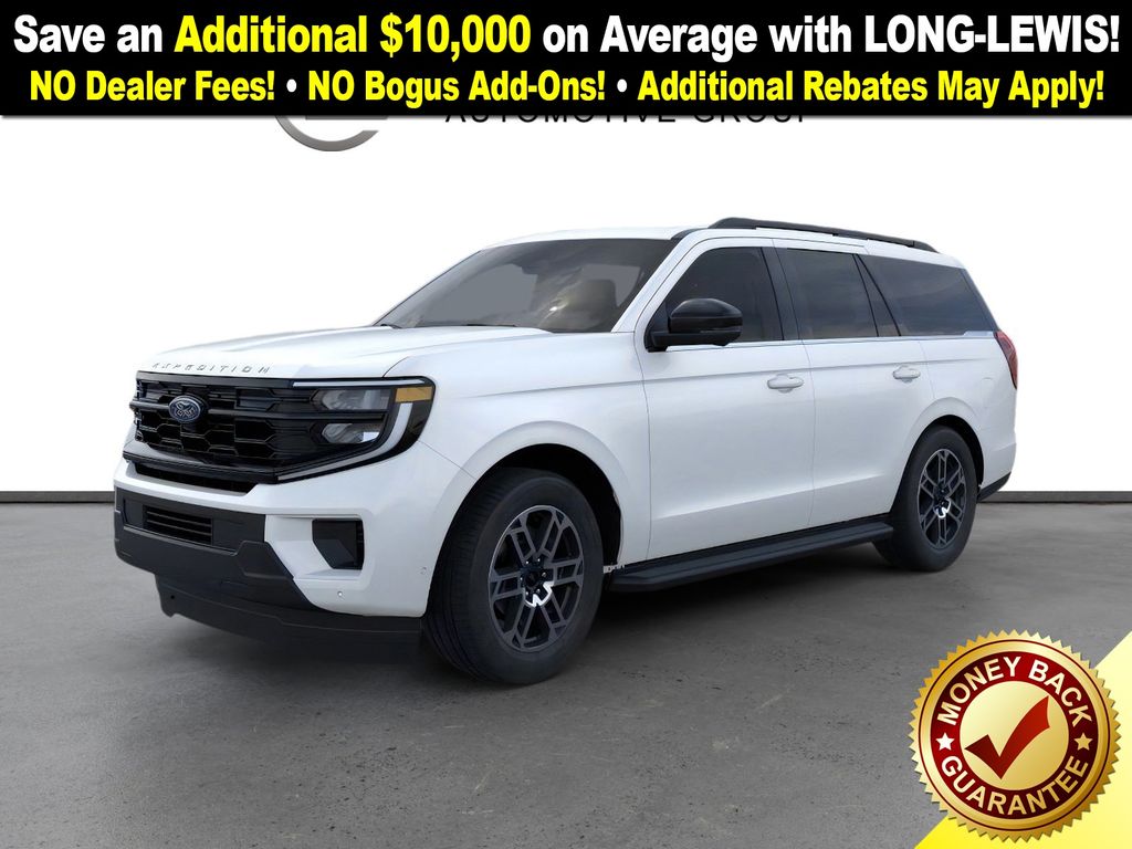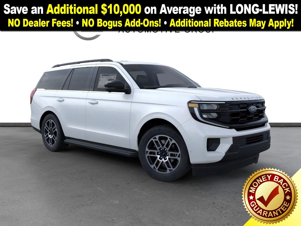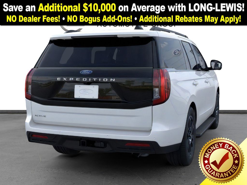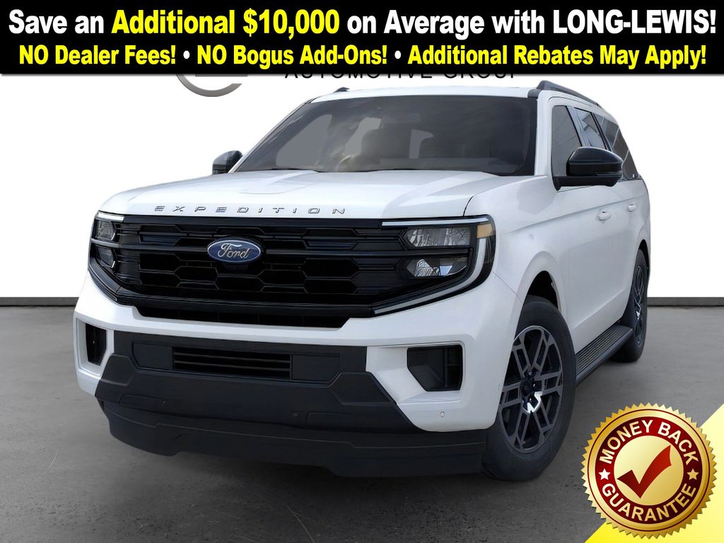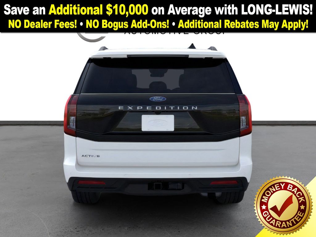 Star White Metallic Tri-Coat 2025 Ford Expedition Active NFT RWD 10-Speed Automatic EcoBoost 3.5L V6 GTDi DOHC 24V Twin Turbocharged 3.31 Axle Ratio, 3rd row seats: split-bench, 4-Wheel Disc Brakes, 6 Speakers, ABS brakes, Air Conditioning, Alloy wheels, AM/FM radio: SiriusXM with 360L, Apple CarPlay/Android Auto, Auto High-beam Headlights, Auto-dimming Rear-View mirror, Automatic temperature control, Brake assist, Bumpers: body-color, Cloth Front Captain's Chairs, Compass, Delay-off headlights, Driver door bin, Driver vanity mirror, Dual front impact airbags, Dual front side impact airbags, Electronic Stability Control, Emergency communication system: 911 Assist, Exterior Parking Camera Rear, Four wheel independent suspension, Front anti-roll bar, Front Bucket Seats, Front Center Armrest, Front dual zone A/C, Front reading lights, Fully automatic headlights, Heated door mirrors, Illuminated entry, Low tire pressure warning, Navigation System, Occupant sensing airbag, Outside temperature display, Overhead airbag, Overhead console, Panic alarm, Passenger door bin, Passenger vanity mirror, Power door mirrors, Power driver seat, Power passenger seat, Power steering, Power windows, Radio data system, Radio: AM/FM Stereo w/MP3 Capable, Rear air conditioning, Rear anti-roll bar, Rear reading lights, Rear window defroster, Rear window wiper, Reclining 3rd row seat, Remote keyless entry, Security system, SiriusXM w/360L, Speed control, Speed-sensing steering, Speed-Sensitive Wipers, Split folding rear seat, Spoiler, Steering wheel mounted audio controls, Tachometer, Telescoping steering wheel, Tilt steering wheel, Traction control, Trip computer, Variably intermittent wipers, Voltmeter, Wheels: 18" Dark Alloy Painted Aluminum.