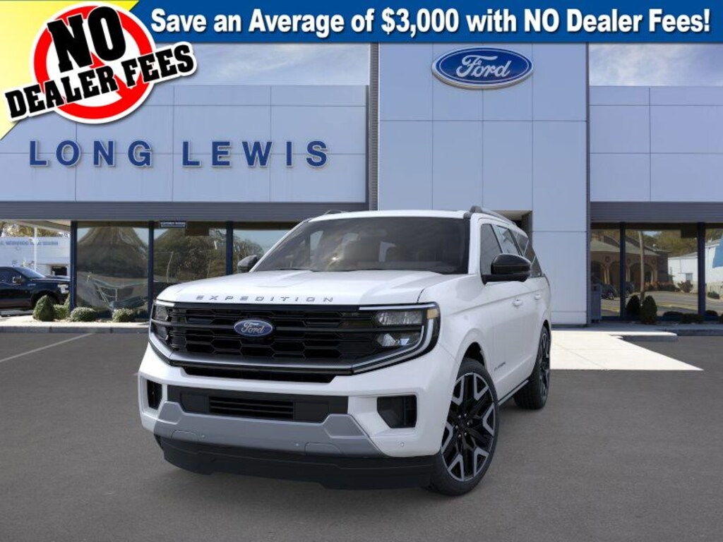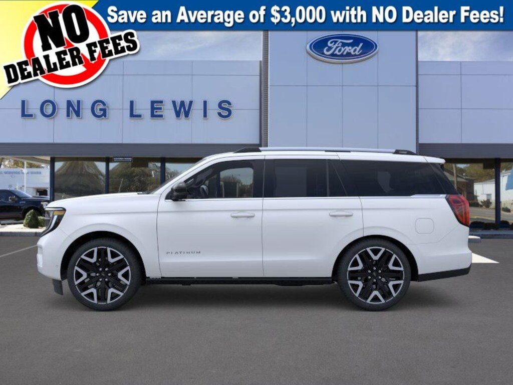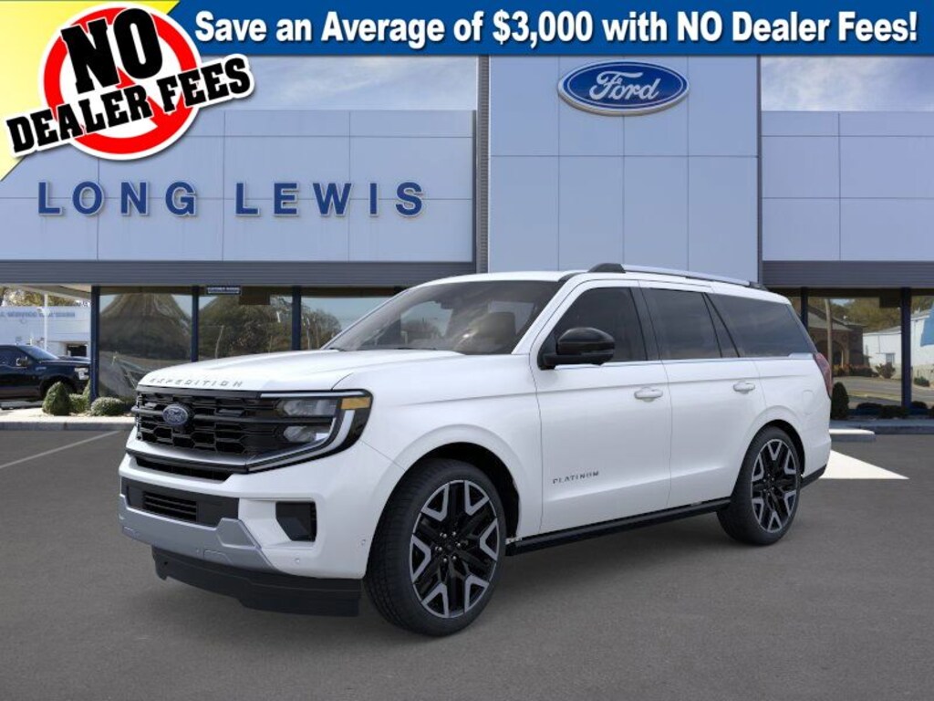 Star White Metallic Tri-Coat 2025 Ford Expedition Platinum 4WD 10-Speed Automatic 3.5L V6 4WD, 10 Speakers, 2nd Row Power-Folding Captain's Chairs, 3.73 Axle Ratio, 3rd row seats: split-bench, 4-Wheel Disc Brakes, ABS brakes, Adjustable pedals, Air Conditioning, Alloy wheels, AM/FM radio: SiriusXM with 360L, Apple CarPlay/Android Auto, Auto High-beam Headlights, Auto-dimming door mirrors, Auto-dimming Rear-View mirror, Automatic temperature control, Black Headlamp Bezel w/Satin Trim Applique, BlueCruise Equipped (1-Year Plan), Brake assist, Bumpers: body-color, Carbon Black Front Bumper w/Lit Grille Bar, Compass, Continuous Control Damping Suspension, Delay-off headlights, Driver door bin, Driver vanity mirror, Driver's Package, Dual front impact airbags, Dual front side impact airbags, Electronic Stability Control, Emergency communication system: 911 Assist, Engine Sound Enhancer, Exterior Parking Camera Rear, Four wheel independent suspension, Front anti-roll bar, Front Bucket Seats, Front Center Armrest, Front Door Scuff Plates w/Met Insert & Bright Rear, Front dual zone A/C, Front reading lights, Fully automatic headlights, Garage door transmitter, Genuine wood dashboard insert, Genuine wood door panel insert, Heated & Ventilated Leather Front Captain's Chairs, Heated door mirrors, Heated front seats, Heated rear seats, Heated steering wheel, High Flow Exhaust System, Illuminated entry, Leather steering wheel, Low tire pressure warning, Memory seat, Multicontour Active Motion Lthr Frnt Captains Chairs, Navigation System, Occupant sensing airbag, Outside temperature display, Overhead airbag, Overhead console, Panic alarm, Passenger door bin, Passenger vanity mirror, Pedal memory, Platinum Ultimate Interior Package, Platinum Ultimate Package, Polished Stainless Steel Beltline Molding, Power door mirrors, Power driver seat, Power moonroof: Vista Roof, Power passenger seat, Power steering, Power windows, Radio data system, Radio: B&O Sound System by Bang & Olufsen, Radio: B&O Unleashed Sound System by Bang & Olufsen, Rain sensing wipers, Rear air conditioning, Rear anti-roll bar, Rear reading lights, Rear Seat Radio Controls, Rear Side Windows Laminated Glass, Rear window defroster, Rear window wiper, Reclining 3rd row seat, Remote keyless entry, Satin Aluminum Expedition Lettering On Side & Hood, Satin Aluminum Platinum Badge On Tailgate, Security system, Signature Grille Lighting, SiriusXM w/360L, Speed control, Speed-sensing steering, Speed-Sensitive Wipers, Split folding rear seat, Spoiler, Steering wheel memory, Steering wheel mounted audio controls, Tachometer, Telescoping steering wheel, Tilt steering wheel, Traction control, Trip computer, Turn signal indicator mirrors, Variably intermittent wipers, Ventilated front seats, Voltmeter, Wheels: 20" Ebony Bright Machined Aluminum, Wheels: 24" Tarnished Dark Metallic (DISC), 4WD.