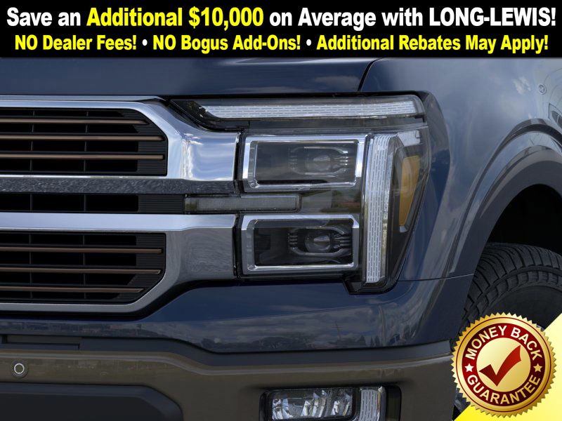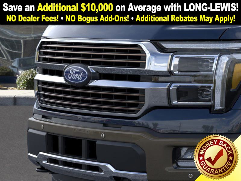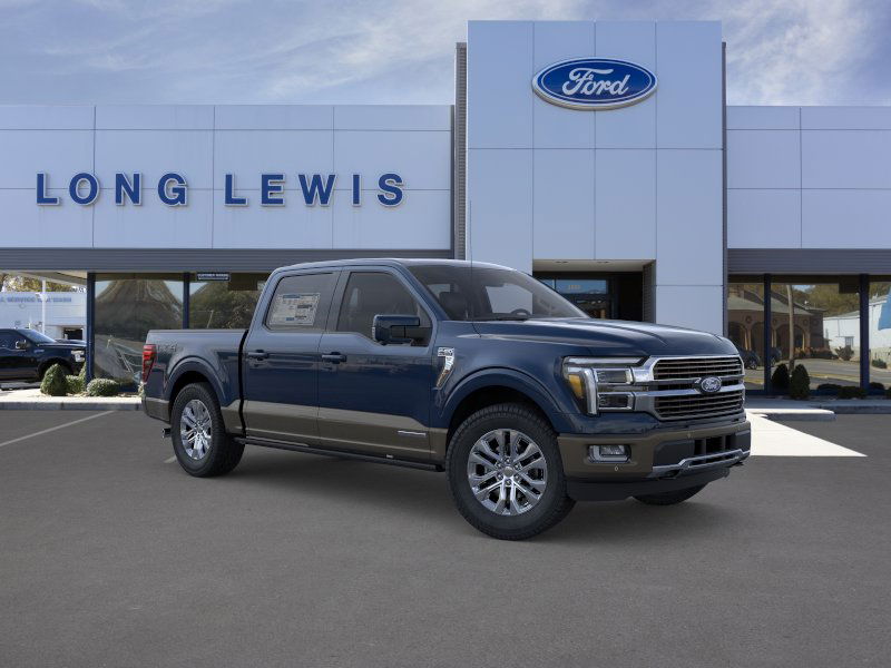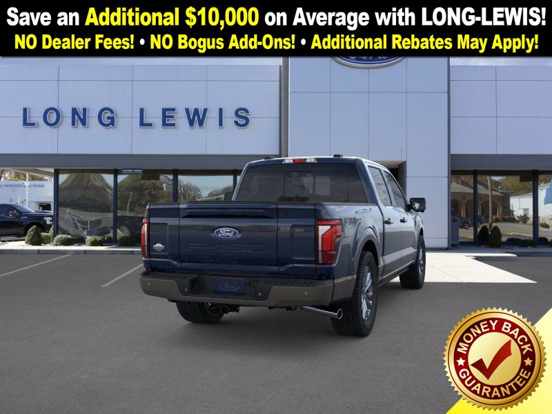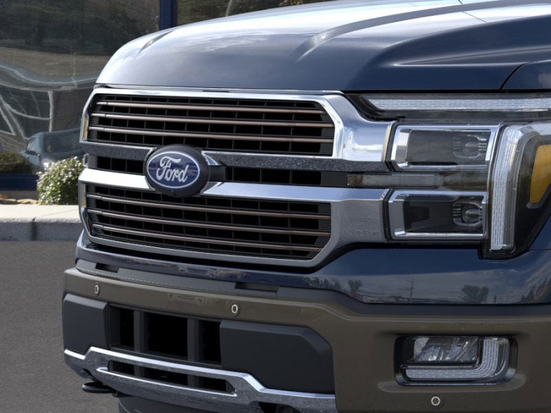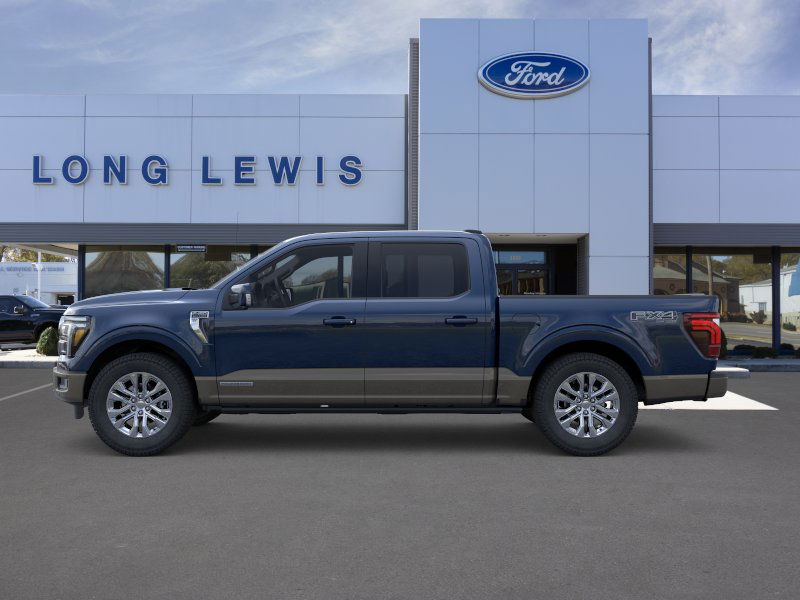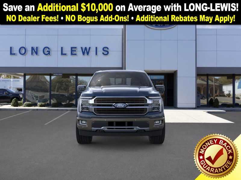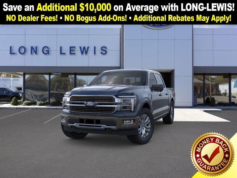 Antimatter Blue Metallic 2025 Ford F-150 King Ranch fctp 4WD 10-Speed Automatic 3.5L PowerBoost Full-Hybrid V6 3.5L PowerBoost Full-Hybrid V6, 4WD, 14 Speakers, 4-Wheel Disc Brakes, 4x4 FX4 Off-Road Bodyside Decal, ABS brakes, Adjustable pedals, Air Conditioning, Alloy wheels, AM/FM radio: SiriusXM with 360L, Auto High-beam Headlights, Auto tilt-away steering wheel, Auto-dimming door mirrors, Auto-dimming Rear-View mirror, Automatic temperature control, Brake assist, Chrome wheels, Compass, Delay-off headlights, Driver door bin, Driver vanity mirror, Dual front impact airbags, Dual front side impact airbags, Electronic Locking w/3.55 Axle Ratio, Electronic Stability Control, Emergency communication system: SYNC 4 911 Assist, Front anti-roll bar, Front Bucket Seats, Front Center Armrest, Front dual zone A/C, Front fog lights, Front License Plate Bracket, Front reading lights, Front wheel independent suspension, Fully automatic headlights, FX4 Off-Road Package, Garage door transmitter, Genuine wood dashboard insert, Heads-Up Display, Heated door mirrors, Heated front seats, Heated rear seats, Heated steering wheel, Hill Descent Control, Illuminated entry, King Ranch Multicontour Leather Bucket Seats, Leather steering wheel, Low tire pressure warning, Max Tow Electronic Locking w/3.73 Axle Ratio, Memory seat, Monotube Rear Shocks, Navigation system: Connected Navigation, Occupant sensing airbag, Off-Road Tuned Front Shock Absorbers, Outside temperature display, Overhead airbag, Overhead console, Panic alarm, Passenger door bin, Passenger vanity mirror, Pedal memory, Power door mirrors, Power driver seat, Power moonroof, Power passenger seat, Power steering, Power windows, Radio data system, Radio: B&O Unleashed Sound System by Bang & Olufsen, Rain sensing wipers, Rear reading lights, Rear seat center armrest, Rear step bumper, Rear window defroster, Remote keyless entry, Rock Crawl Mode, Security system, Speed control, Split folding rear seat, Steering wheel memory, Steering wheel mounted audio controls, SYNC 4 w/Enhanced Voice Recognition, Tachometer, Telescoping steering wheel, Tilt steering wheel, Traction control, Trip computer, Turn signal indicator mirrors, Variably intermittent wipers, Ventilated front seats, Voltmeter, Wheels: 20" Chrome-Like PVD, 3.5L PowerBoost Full-Hybrid V6, 4WD.