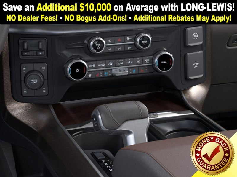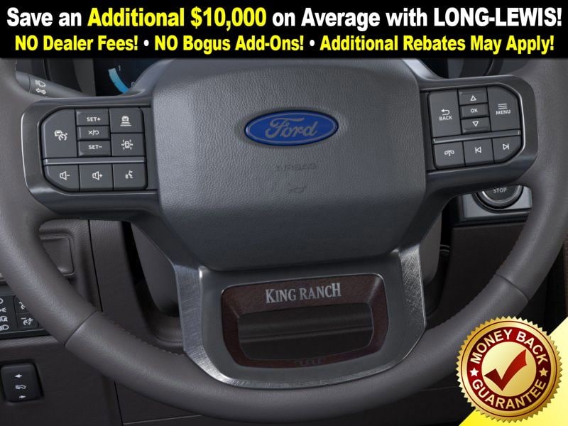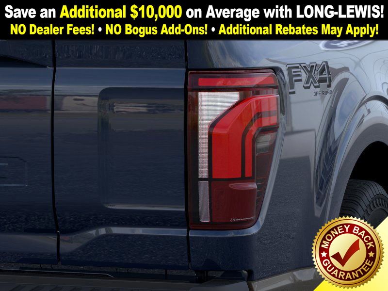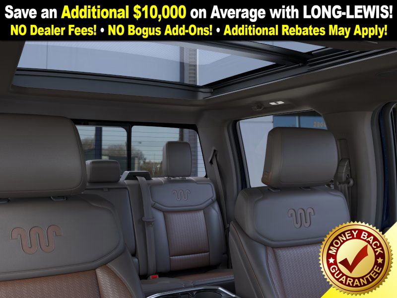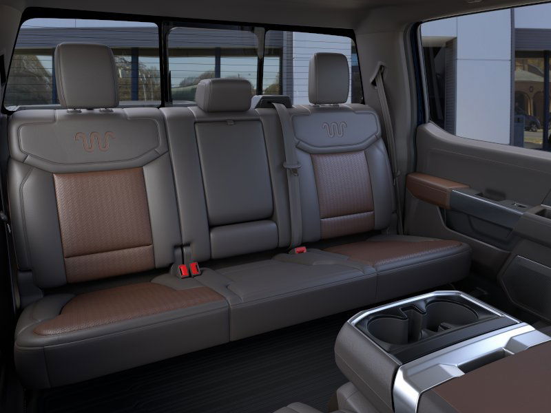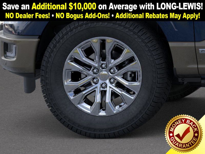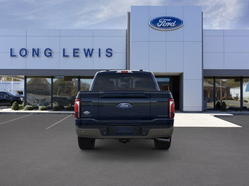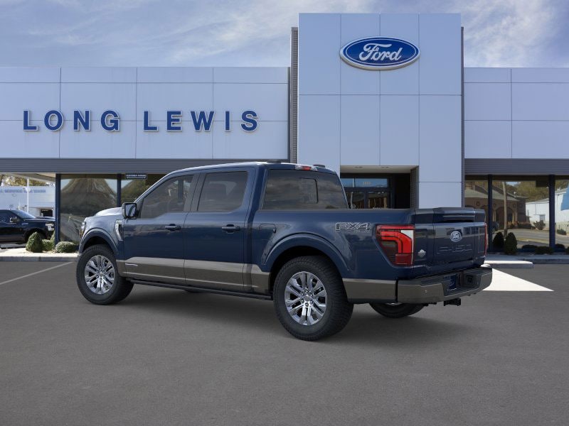 Antimatter Blue Metallic 2025 Ford F-150 King Ranch fctp 4WD 10-Speed Automatic 3.5L PowerBoost Full-Hybrid V6 3.5L PowerBoost Full-Hybrid V6, 4WD, 14 Speakers, 4-Wheel Disc Brakes, 4x4 FX4 Off-Road Bodyside Decal, ABS brakes, Adjustable pedals, Air Conditioning, Alloy wheels, AM/FM radio: SiriusXM with 360L, Auto High-beam Headlights, Auto tilt-away steering wheel, Auto-dimming door mirrors, Auto-dimming Rear-View mirror, Automatic temperature control, Brake assist, Chrome wheels, Compass, Delay-off headlights, Driver door bin, Driver vanity mirror, Dual front impact airbags, Dual front side impact airbags, Electronic Locking w/3.55 Axle Ratio, Electronic Stability Control, Emergency communication system: SYNC 4 911 Assist, Front anti-roll bar, Front Bucket Seats, Front Center Armrest, Front dual zone A/C, Front fog lights, Front License Plate Bracket, Front reading lights, Front wheel independent suspension, Fully automatic headlights, FX4 Off-Road Package, Garage door transmitter, Genuine wood dashboard insert, Heads-Up Display, Heated door mirrors, Heated front seats, Heated rear seats, Heated steering wheel, Hill Descent Control, Illuminated entry, King Ranch Multicontour Leather Bucket Seats, Leather steering wheel, Low tire pressure warning, Max Tow Electronic Locking w/3.73 Axle Ratio, Memory seat, Monotube Rear Shocks, Navigation system: Connected Navigation, Occupant sensing airbag, Off-Road Tuned Front Shock Absorbers, Outside temperature display, Overhead airbag, Overhead console, Panic alarm, Passenger door bin, Passenger vanity mirror, Pedal memory, Power door mirrors, Power driver seat, Power moonroof, Power passenger seat, Power steering, Power windows, Radio data system, Radio: B&O Unleashed Sound System by Bang & Olufsen, Rain sensing wipers, Rear reading lights, Rear seat center armrest, Rear step bumper, Rear window defroster, Remote keyless entry, Rock Crawl Mode, Security system, Speed control, Split folding rear seat, Steering wheel memory, Steering wheel mounted audio controls, SYNC 4 w/Enhanced Voice Recognition, Tachometer, Telescoping steering wheel, Tilt steering wheel, Traction control, Trip computer, Turn signal indicator mirrors, Variably intermittent wipers, Ventilated front seats, Voltmeter, Wheels: 20" Chrome-Like PVD, 3.5L PowerBoost Full-Hybrid V6, 4WD.