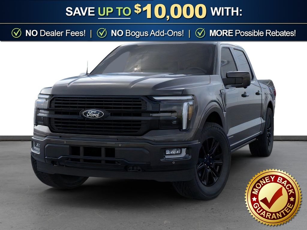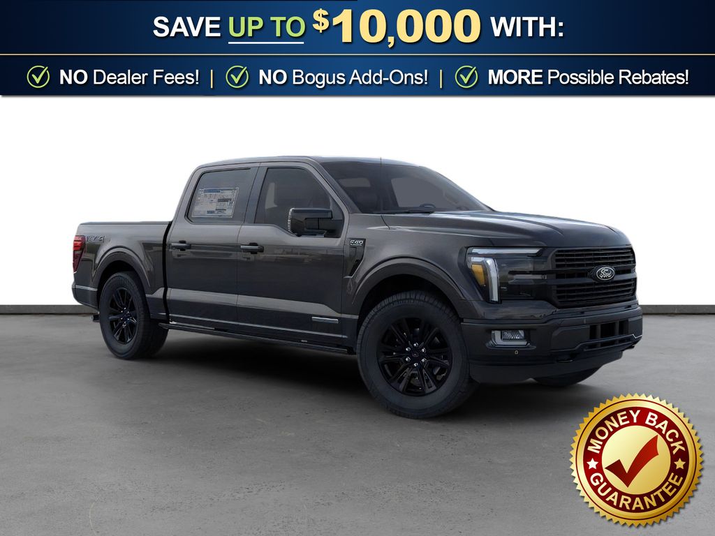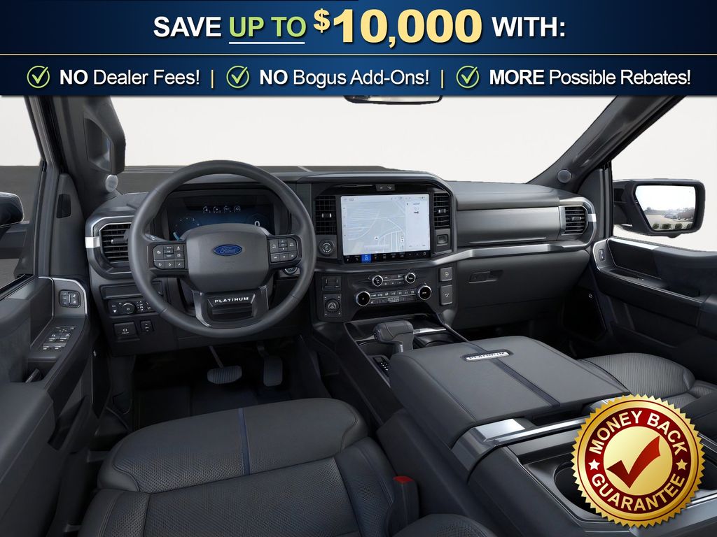 Dealer Discount of $8,931 off MSRP Agate Black Metallic 2025 Ford F-150 Platinum fctp 4WD 10-Speed Automatic 3.5L PowerBoost Full-Hybrid V6 3.5L PowerBoost Full-Hybrid V6, 4WD, 4-Wheel Disc Brakes, 4x4 FX4 Off-Road Bodyside Decal, 8 Speakers, ABS brakes, Adjustable pedals, Air Conditioning, Alloy wheels, AM/FM radio: SiriusXM with 360L, Auto High-beam Headlights, Auto tilt-away steering wheel, Auto-dimming door mirrors, Auto-dimming Rear-View mirror, Automatic temperature control, Brake assist, Bumpers: body-color, Compass, Delay-off headlights, Driver door bin, Driver vanity mirror, Dual front impact airbags, Dual front side impact airbags, Electronic Stability Control, Emergency communication system: SYNC 4 911 Assist, Equipment Group 702A High, Front anti-roll bar, Front Bucket Seats, Front Center Armrest, Front dual zone A/C, Front fog lights, Front License Plate Bracket, Front reading lights, Front wheel independent suspension, Fully automatic headlights, FX4 Off-Road Package, Garage door transmitter, Heated door mirrors, Heated front seats, Heated rear seats, Heated steering wheel, Hill Descent Control, Illuminated entry, Internet access capable: FordPass Connect 5G, Leather steering wheel, Low tire pressure warning, Memory seat, Monotube Rear Shocks, Navigation system: Connected Navigation, Occupant sensing airbag, Off-Road Tuned Front Shock Absorbers, Outside temperature display, Overhead airbag, Overhead console, Panic alarm, Passenger door bin, Passenger vanity mirror, Pedal memory, Power door mirrors, Power driver seat, Power passenger seat, Power steering, Power windows, Radio data system, Radio: B&O Sound System by Bang & Olufsen, Rain sensing wipers, Rear reading lights, Rear seat center armrest, Rear step bumper, Rear window defroster, Remote keyless entry, Rock Crawl Mode, Security system, Speed control, Split folding rear seat, Steering wheel memory, Steering wheel mounted audio controls, SYNC 4 w/Enhanced Voice Recognition, Tachometer, Telescoping steering wheel, Tilt steering wheel, Traction control, Tray Style Floor Liner, Trip computer, Turn signal indicator mirrors, Unique Multi-Contour Leather Bucket Seats, Variably intermittent wipers, Ventilated front seats, Voltmeter, Wheels: 20" Painted Gloss Ebony Black, 3.5L PowerBoost Full-Hybrid V6, 4WD. Price includes: $1000 - Truck Month Retail Bonus Cash. Exp. 03/31/2026 $2000 - Retail Customer Cash. Exp. 03/31/2026