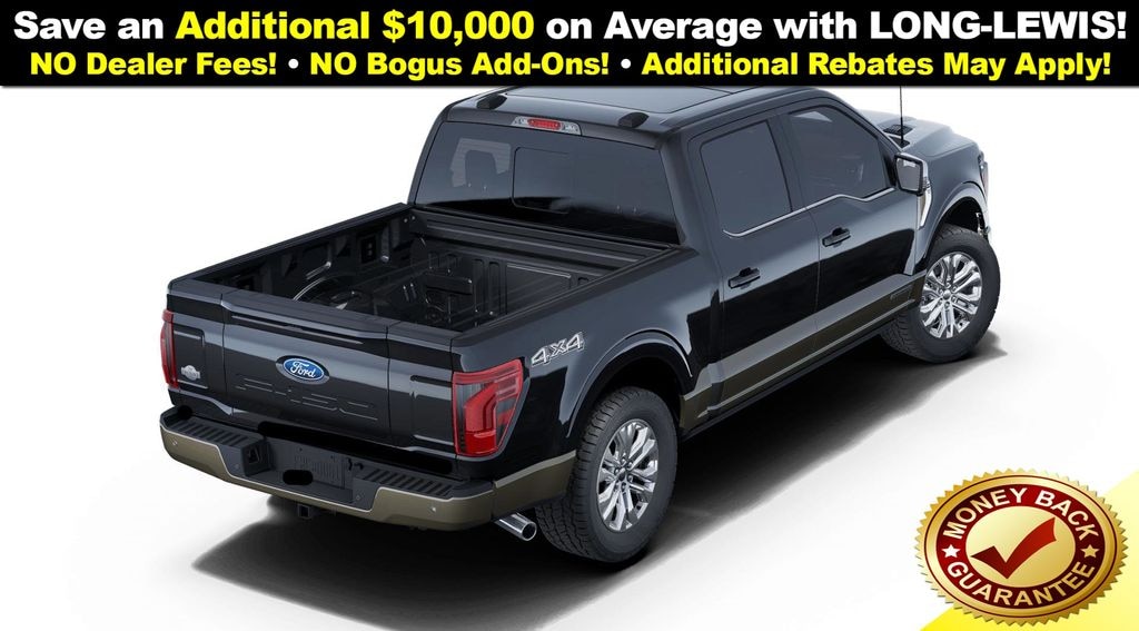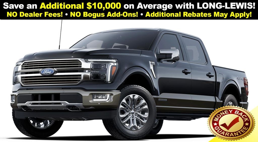 Dealer Discount of $8,241 off MSRP Agate Black Metallic 2025 Ford F-150 King Ranch 4WD 10-Speed Automatic 3.5L PowerBoost Full-Hybrid V6 3.5L PowerBoost Full-Hybrid V6, 4WD, 14 Speakers, 4-Wheel Disc Brakes, 4x4 FX4 Off-Road Bodyside Decal, ABS brakes, Adjustable pedals, Air Conditioning, Alloy wheels, AM/FM radio: SiriusXM with 360L, Auto High-beam Headlights, Auto tilt-away steering wheel, Auto-dimming door mirrors, Auto-dimming Rear-View mirror, Automatic temperature control, Brake assist, Chrome wheels, Compass, Delay-off headlights, Driver door bin, Driver vanity mirror, Dual front impact airbags, Dual front side impact airbags, Electronic Stability Control, Emergency communication system: SYNC 4 911 Assist, Front anti-roll bar, Front Bucket Seats, Front Center Armrest, Front dual zone A/C, Front fog lights, Front License Plate Bracket, Front reading lights, Front wheel independent suspension, Fully automatic headlights, FX4 Off-Road Package, Garage door transmitter, Genuine wood dashboard insert, Heads-Up Display, Heated door mirrors, Heated front seats, Heated rear seats, Heated steering wheel, Hill Descent Control, Illuminated entry, King Ranch Multicontour Leather Bucket Seats, Leather steering wheel, Low tire pressure warning, Memory seat, Monotube Rear Shocks, Navigation system: Connected Navigation, Occupant sensing airbag, Off-Road Tuned Front Shock Absorbers, Outside temperature display, Overhead airbag, Overhead console, Panic alarm, Passenger door bin, Passenger vanity mirror, Pedal memory, Power door mirrors, Power driver seat, Power moonroof, Power passenger seat, Power steering, Power windows, Radio data system, Radio: B&O Unleashed Sound System by Bang & Olufsen, Rain sensing wipers, Rear reading lights, Rear seat center armrest, Rear step bumper, Rear window defroster, Remote keyless entry, Rock Crawl Mode, Security system, Speed control, Split folding rear seat, Steering wheel memory, Steering wheel mounted audio controls, SYNC 4 w/Enhanced Voice Recognition, Tachometer, Telescoping steering wheel, Tilt steering wheel, Traction control, Trip computer, Turn signal indicator mirrors, Variably intermittent wipers, Ventilated front seats, Voltmeter, Wheels: 20" Chrome-Like PVD, 3.5L PowerBoost Full-Hybrid V6, 4WD.