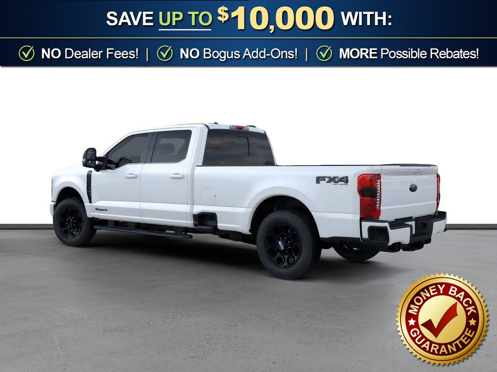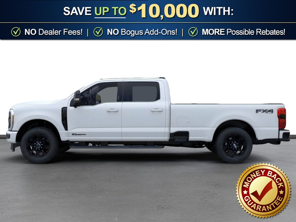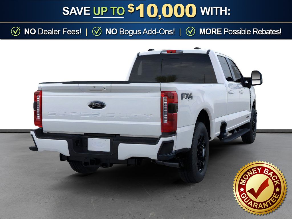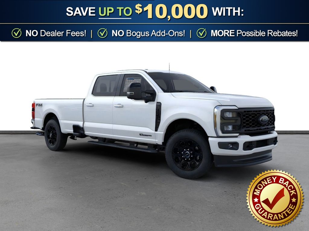 Dealer Discount of $9,127 off MSRP Star White Metallic Tri-Coat 2025 Ford F-350SD Lariat NFT 4WD 10-Speed Automatic Power Stroke 6.7L V8 DI 32V OHV Turbodiesel 4WD, 190 Amp Alternator, 4-Way Adjustable Headrests, 4-Wheel Disc Brakes, 410 Amp Dual Alternators, 5th Wheel/Gooseneck Hitch Prep Package, 6" Ebony Black Angular Running Boards, 8 Speakers, ABS brakes, Adaptive Cruise Control with Stop-and-Go, Adjustable pedals, Air Conditioning, Alloy wheels, AM/FM radio: SiriusXM with 360L, Auto High-beam Headlights, Auto-dimming Rear-View mirror, Automatic High Beam, Automatic temperature control, Black Appearance Package, Black Painted Front Grille Surround, BLIS with Cross-Traffic Alert, Body Color Front and Rear Bumpers, Brake assist, Bumpers: chrome, Compass, Delay-off headlights, Driver door bin, Driver vanity mirror, Dual AGM 68 AH Battery, Dual front impact airbags, Dual front side impact airbags, Ebony Black Painted Mirror Caps, Electronic Stability Control, Emergency communication system: SYNC 4 911 Assist, Engine Block Heater, Flow-Through Console, Front ActiveX Trimmed 40/Console/40 Seats, Front and Rear Parking Sensors, Front anti-roll bar, Front Bucket Seats, Front Center Armrest, Front dual zone A/C, Front fog lights, Front reading lights, Fully automatic headlights, FX4 Off-Road Package, Garage door transmitter, Head-Up Display, Heated door mirrors, Heated front seats, Heated rear seats, Heated steering wheel, Hill Descent Control, Illuminated entry, Internet access capable: FordPass Connect 5G, Lane-Keeping System, Lariat Ultimate Package, LED Roof Clearance Lights, Low tire pressure warning, Memory seat, Navigation System, Off-Road Specifically Tuned Shock Absorbers, Order Code 618A, Outside temperature display, Overhead airbag, Overhead console, Panic alarm, Passenger door bin, Passenger vanity mirror, Pedal memory, Post-Collision Braking, Power door mirrors, Power driver seat, Power passenger seat, Power steering, Power windows, Power-Deployable Running Boards, Power-Sliding Rear-Window with Defrost, Pre-Collision Assist, Privacy Glass, Pro Trailer Backup Assist, Pro Trailer Hitch Assist, Radio: B&O Sound System by Bang and Olufsen, Radio: B&O Unleashed Sound System by Bang & Olufsen, Rain sensing wipers, Rapid-Heat Supplemental Cab Heater, Rear Parking Sensors, Rear reading lights, Rear seat center armrest, Rear step bumper, Rear window defroster, Remote keyless entry, Security system, SiriusXM Radio with 360L, Speed control, Split folding rear seat, Steering wheel mounted audio controls, SYNC 4 with Enhanced Voice Recognition, Tachometer, Tailgate Step and Handle, Telescoping steering wheel, Tilt steering wheel, Traction control, Trip computer, Turn signal indicator mirrors, Unique FX4 Off-Road Box Decal, Upfitter Switches (6), Variably intermittent wipers, Ventilated front seats, Wheels: 18" Bright Machined and Carbonized Gray Aluminum, 4WD.