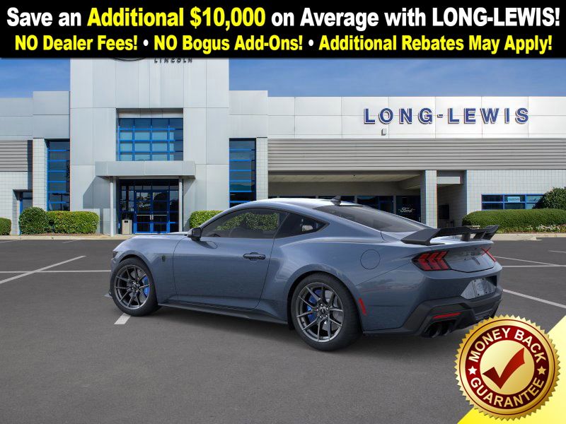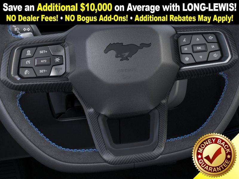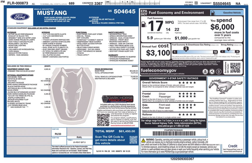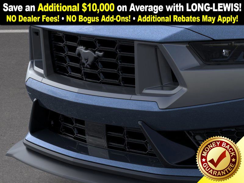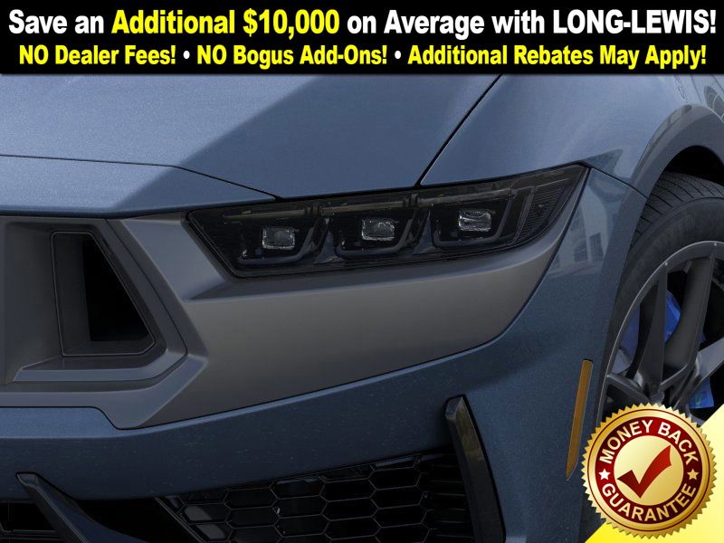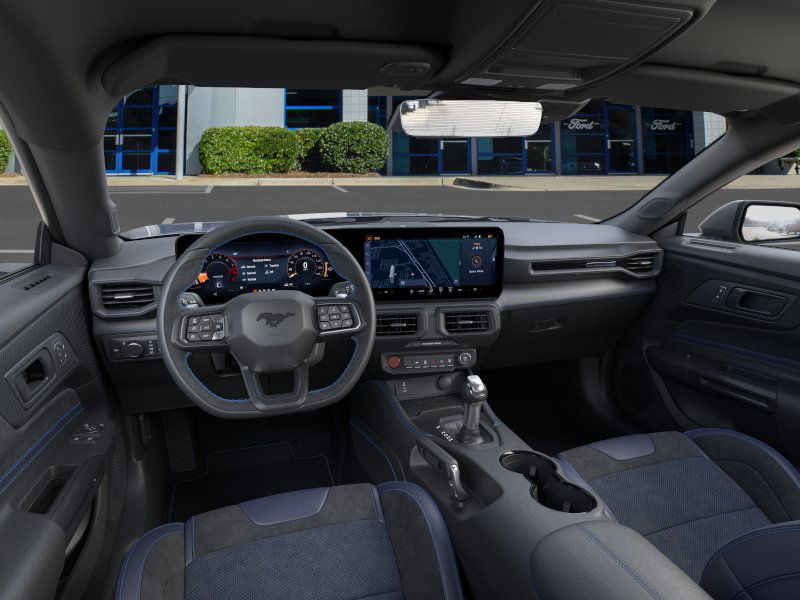 Vapor Blue Metallic 2025 Ford Mustang Dark Horse NFC RWD 10-Speed Automatic 5.0L V8 DOHC 32V 12 Speakers, 4-Wheel Disc Brakes, ABS brakes, Adaptive suspension, Air Conditioning, Alloy wheels, AM/FM radio: SiriusXM with 360L, AM/FM Stereo, Auto High-beam Headlights, Auto-dimming Rear-View mirror, Automatic temperature control, B&O Sound System by Bang & Olufsen, Brake assist, Bumpers: body-color, Cloth/Vinyl Climate-Controlled Bucket Seats, Cloth/Vinyl Heated Bucket Seats, Compass, Dark Horse Appearance Package, Dark Horse Handling Package, Delay-off headlights, Driver door bin, Driver vanity mirror, Dual front impact airbags, Dual front side impact airbags, Electronic Stability Control, Emergency communication system: 911 Assist, Exterior Parking Camera Rear, Four wheel independent suspension, Front anti-roll bar, Front Bucket Seats, Front Center Armrest, Front dual zone A/C, Front reading lights, Front Towing Hooks, Fully automatic headlights, HD Radio, Heated front seats, Heated steering wheel, Illuminated entry, Internet access capable: FordPass Connect, Knee airbag, Low tire pressure warning, Magnetic Damping System, Navigation system: Connected Navigation, Notorious Blue Painted Brake Calipers, Occupant sensing airbag, Outside temperature display, Overhead airbag, Overhead console, Painted Black Roof, Panic alarm, Passenger door bin, Passenger vanity mirror, Performance Front Aero Splitter, Performance Rear Spoiler w/Gurney Flap, Power door mirrors, Power driver seat, Power passenger seat, Power steering, Power windows, Radio data system, Rain sensing wipers, Rear anti-roll bar, Rear Parking Sensors, Rear window defroster, RECARO Micro-Suede/Vinyl Bucket Seats, RECARO Sport Seats, Remote keyless entry, SiriusXM w/360L, Speed control, Speed-sensing steering, Speed-Sensitive Wipers, Split folding rear seat, Spoiler, Sport steering wheel, Steering wheel mounted audio controls, SYNC 4, Tachometer, Telescoping steering wheel, Tilt steering wheel, Traction control, Trip computer, Unique Hood Graphic, Variably intermittent wipers, Voltmeter, Wheels: 19" x 10.5" Fr/19" x 11" Rr Tarnished Alum, Wheels: 19" x 9.5" Fr & 19" x 10" Rr Aluminum.