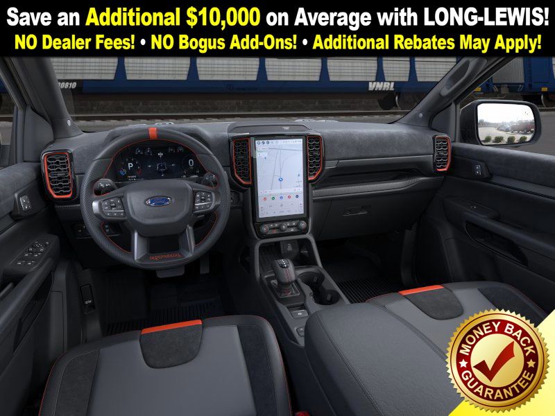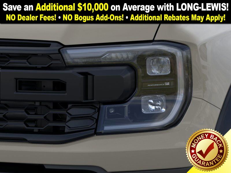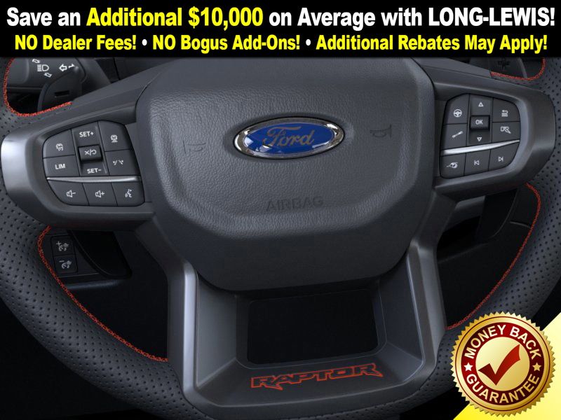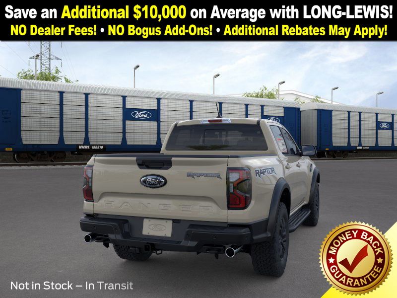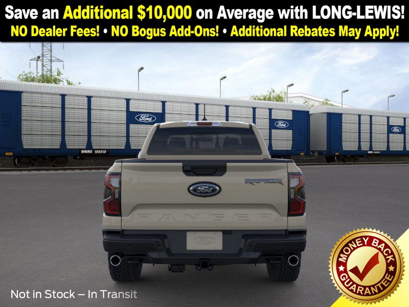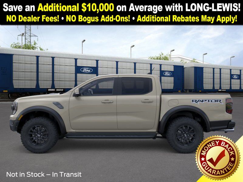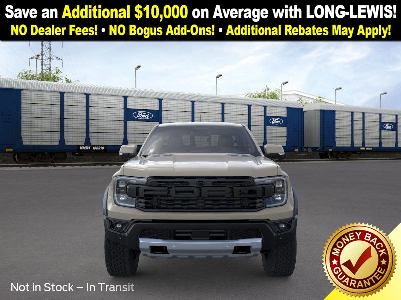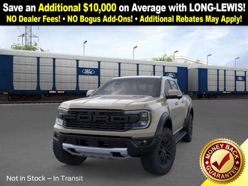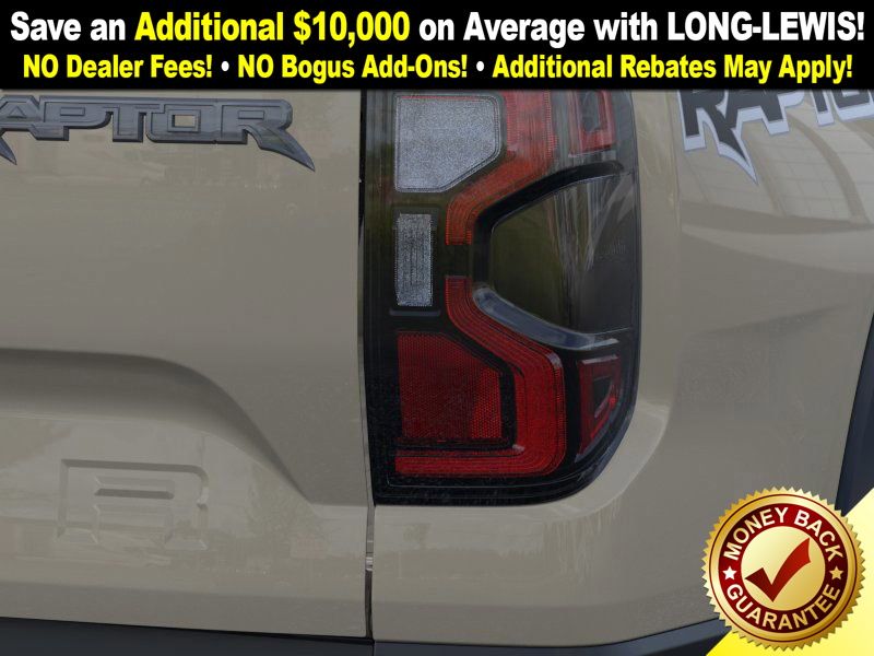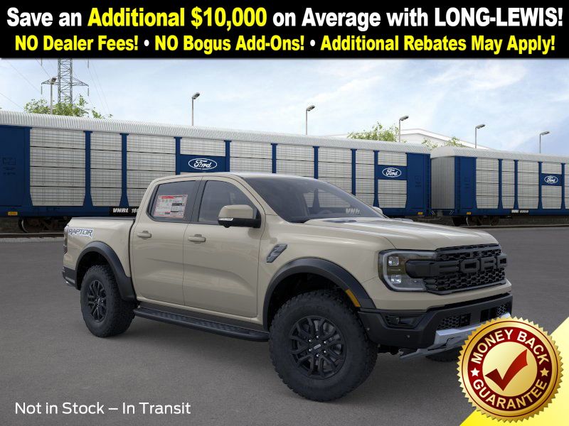 Desert Sand 2025 Ford Ranger Raptor NFT 4WD 10-Speed Automatic 3.0L EcoBoost V6 4WD, 10 Speakers, 4-Wheel Disc Brakes, 4.27 Axle Ratio, ABS brakes, Air Conditioning, Alloy wheels, AM/FM radio: SiriusXM, Auto High-beam Headlights, Auto-dimming Rear-View mirror, Automatic temperature control, Brake assist, Compass, Delay-off headlights, Driver door bin, Driver vanity mirror, Dual front impact airbags, Dual front side impact airbags, Electronic Stability Control, Emergency communication system: SYNC 4 911 Assist, Front anti-roll bar, Front Bucket Seats, Front Center Armrest, Front dual zone A/C, Front fog lights, Front License Plate Bracket, Front reading lights, Front wheel independent suspension, Fully automatic headlights, Garage door transmitter, Heated door mirrors, Heated front seats, Heated steering wheel, Illuminated entry, Internet access capable: FordPass Connect 4G, Leather Shift Knob, Leather steering wheel, Leather-Trimmed Front Heated Bucket Seats, Low tire pressure warning, Memory seat, Navigation system: Connected Navigation, Occupant sensing airbag, Outside temperature display, Overhead airbag, Overhead console, Panic alarm, Passenger door bin, Passenger vanity mirror, Power door mirrors, Power driver seat, Power passenger seat, Power steering, Power windows, Radio: B&O Sound System by Bang & Olufsen, Rain sensing wipers, Rear reading lights, Rear seat center armrest, Rear step bumper, Rear window defroster, Remote keyless entry, Security system, SiriusXM Satellite Radio, Speed control, Speed-sensing steering, Steering wheel mounted audio controls, SYNC 4A, Telescoping steering wheel, Tilt steering wheel, Traction control, Trip computer, Turn signal indicator mirrors, Variably intermittent wipers, Voltmeter, Wheels: 17" Gray-Painted Aluminum, 4WD.