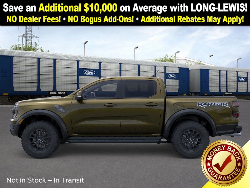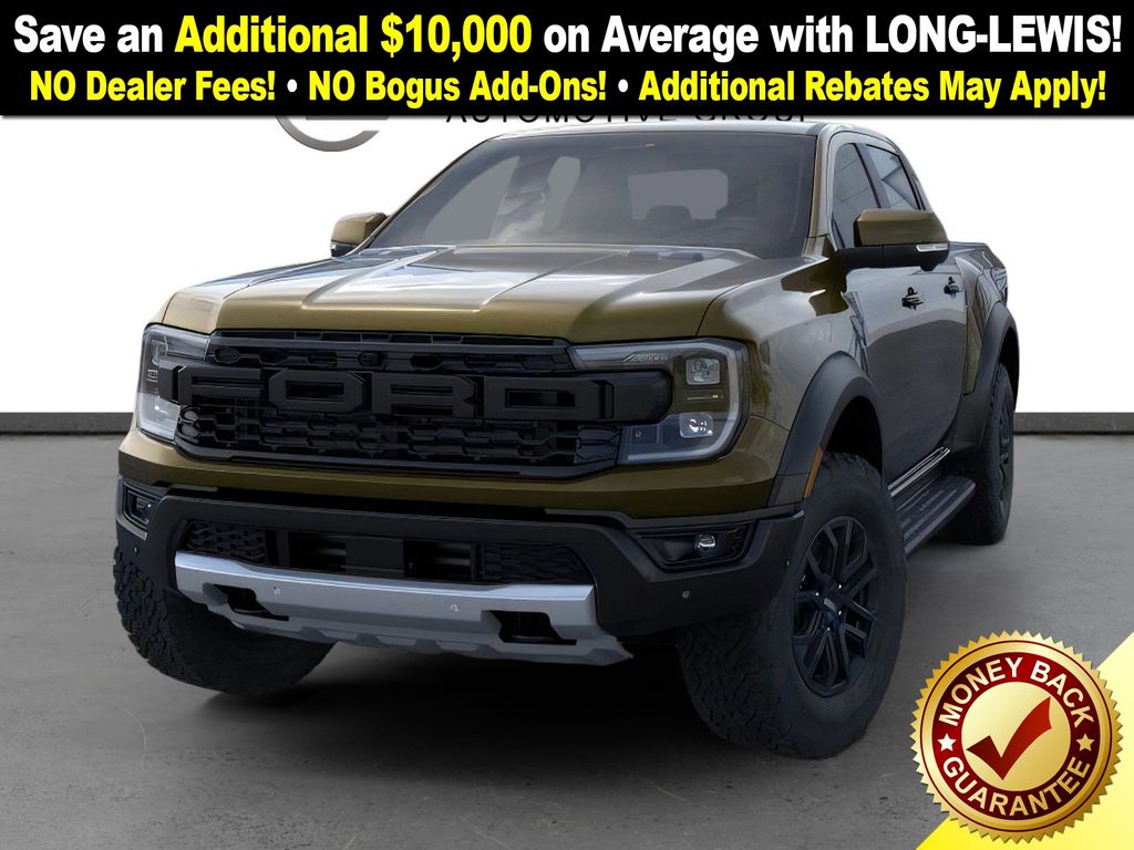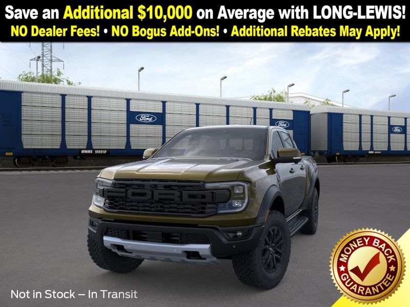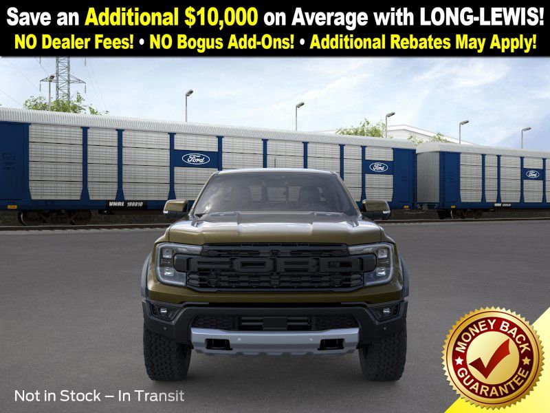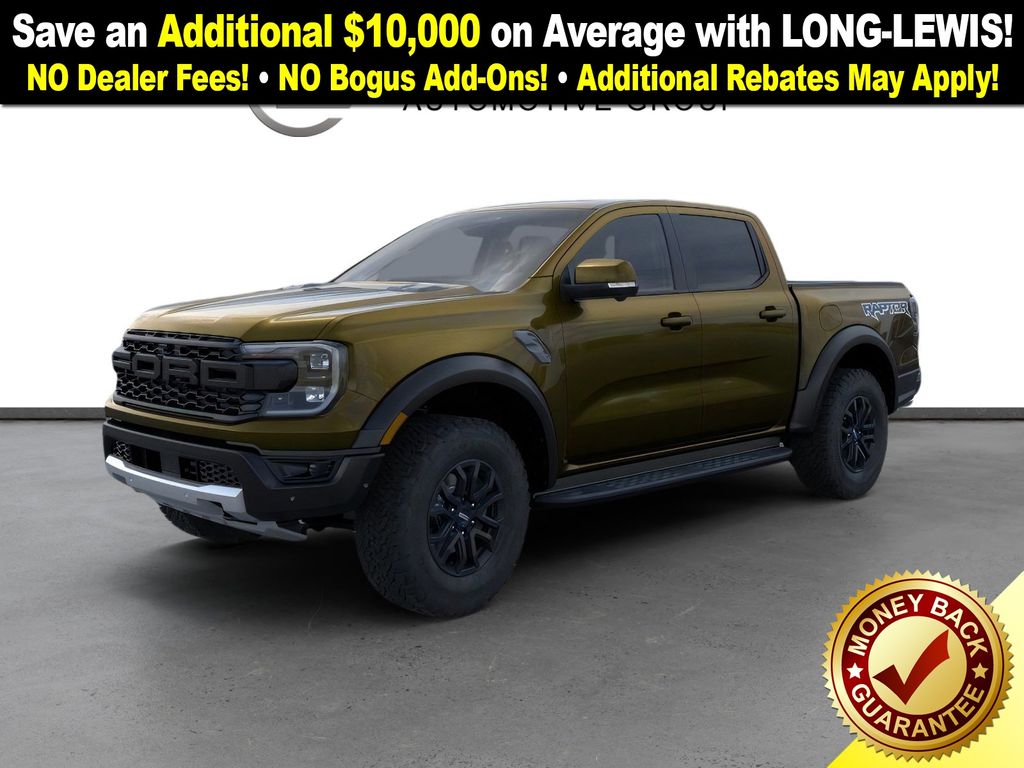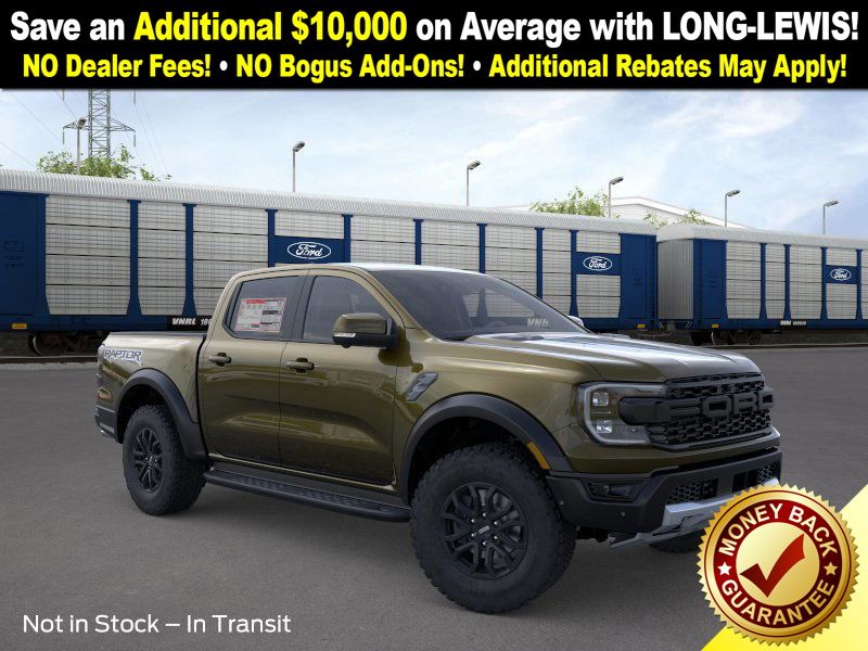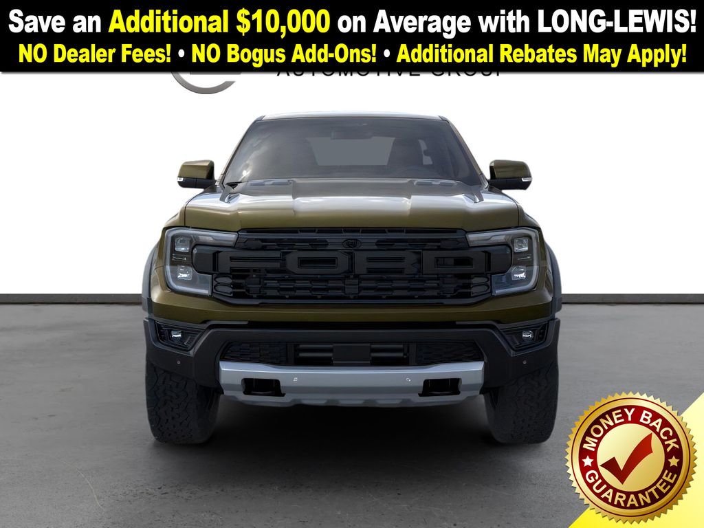 Shelter Green Metallic 2025 Ford Ranger Raptor NFT 4WD 10-Speed Automatic 3.0L EcoBoost V6 4WD, 10 Speakers, 4-Wheel Disc Brakes, 4.27 Axle Ratio, ABS brakes, Air Conditioning, Alloy wheels, AM/FM radio: SiriusXM, Auto High-beam Headlights, Auto-dimming Rear-View mirror, Automatic temperature control, Brake assist, Compass, Delay-off headlights, Driver door bin, Driver vanity mirror, Dual front impact airbags, Dual front side impact airbags, Electronic Stability Control, Emergency communication system: SYNC 4 911 Assist, Front anti-roll bar, Front Bucket Seats, Front Center Armrest, Front dual zone A/C, Front fog lights, Front License Plate Bracket, Front reading lights, Front wheel independent suspension, Fully automatic headlights, Garage door transmitter, Heated door mirrors, Heated front seats, Heated steering wheel, Illuminated entry, Internet access capable: FordPass Connect 4G, Leather Shift Knob, Leather steering wheel, Leather-Trimmed Front Heated Bucket Seats, Low tire pressure warning, Memory seat, Navigation system: Connected Navigation, Occupant sensing airbag, Outside temperature display, Overhead airbag, Overhead console, Panic alarm, Passenger door bin, Passenger vanity mirror, Power door mirrors, Power driver seat, Power passenger seat, Power steering, Power windows, Radio: B&O Sound System by Bang & Olufsen, Rain sensing wipers, Rear reading lights, Rear seat center armrest, Rear step bumper, Rear window defroster, Remote keyless entry, Security system, SiriusXM Satellite Radio, Speed control, Speed-sensing steering, Steering wheel mounted audio controls, SYNC 4A, Telescoping steering wheel, Tilt steering wheel, Traction control, Trip computer, Turn signal indicator mirrors, Variably intermittent wipers, Voltmeter, Wheels: 17" Gray-Painted Aluminum, 4WD.