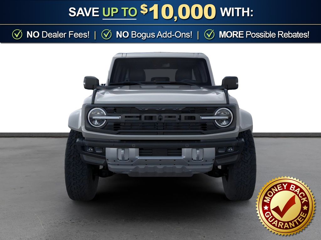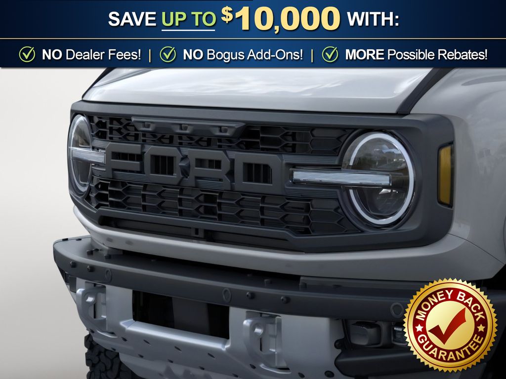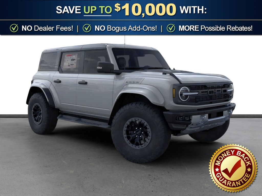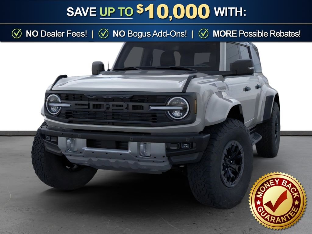 Avalanche Gray 2026 Ford Bronco Raptor NFT 4WD 10-Speed Automatic 3.0L EcoBoost V6 12 Speakers, 4-Wheel Disc Brakes, ABS brakes, Air Conditioning, Alloy wheels, AM/FM radio: SiriusXM with 360L, Auto High-beam Headlights, Auto-dimming Rear-View mirror, Automatic temperature control, Brake assist, Compass, Connected Navigation, Convertible HardTop, Convertible roof lining, Delay-off headlights, Driver door bin, Driver vanity mirror, Dual front impact airbags, Dual front side impact airbags, Electronic Stability Control, Emergency communication system: 911 Assist, Exterior Parking Camera Rear, Ford Connectivity Package (1-Year Included), Front anti-roll bar, Front Bucket Seats, Front Center Armrest, Front dual zone A/C, Front fog lights, Front License Plate Bracket, Front reading lights, Front wheel independent suspension, Fully automatic headlights, Glass rear window, Hard Top Sound Deadening Headliner, Heated door mirrors, Heated front seats, Heated steering wheel, Illuminated entry, Integrated roll-over protection, Interior Carbon Fiber Pack, Leather Shift Knob, Leather-Trimmed/Vinyl Bucket Seats, Low tire pressure warning, Marine Grade Vinyl Bucket Seats, Navigation system: Connected Navigation, Occupant sensing airbag, Outside temperature display, Overhead airbag, Overhead console, Panic alarm, Passenger door bin, Passenger vanity mirror, Power door mirrors, Power steering, Power windows, Radio data system, Rear anti-roll bar, Rear seat center armrest, Rear window defroster, Rear window wiper, Rear-Window Defroster and Washer, Remote keyless entry, Security system, Shadow Black Painted Hard Top, SiriusXM with 360L, Speed control, Split folding rear seat, Steering wheel mounted audio controls, SYNC 4, Tachometer, Telescoping steering wheel, Tilt steering wheel, Traction control, Trip computer, Turn signal indicator mirrors, Variably intermittent wipers, Voltmeter, Wheels: 17" Black High Gloss-Painted Aluminum, Wheels: 17" Dark Carbonized Gray Alloy Painted.