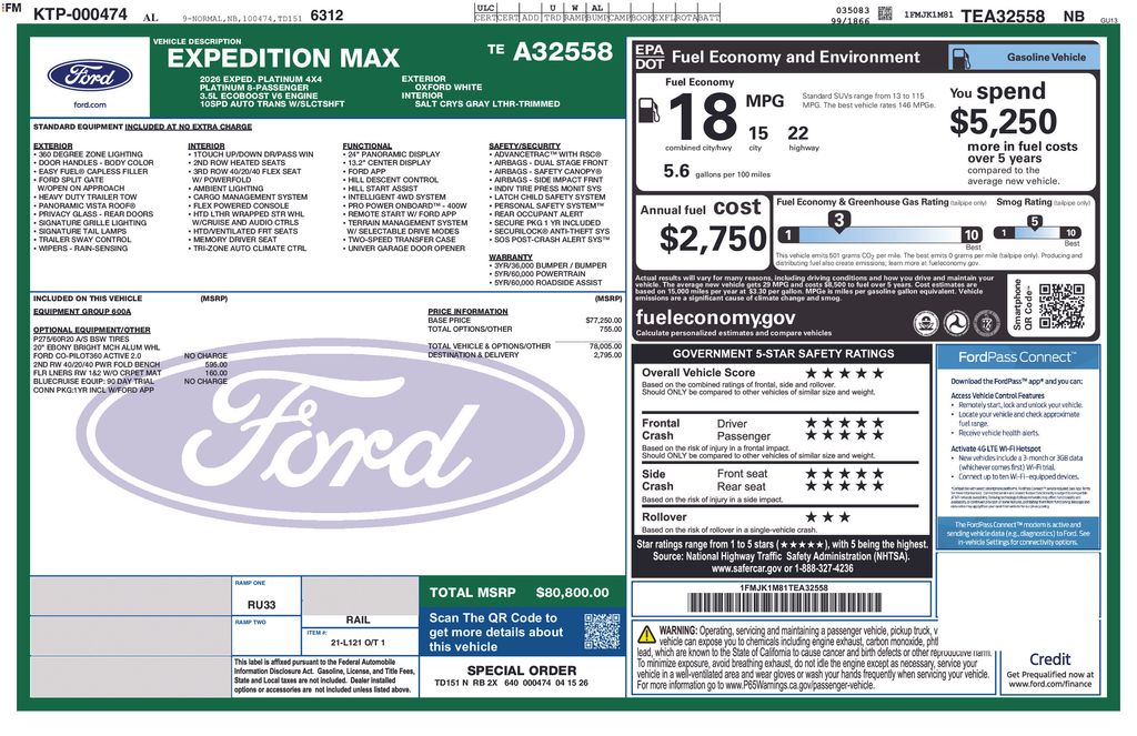 Oxford White 2026 Ford Expedition Max Platinum NFT 4WD 10-Speed Automatic EcoBoost 3.5L V6 GTDi DOHC 24V Twin Turbocharged