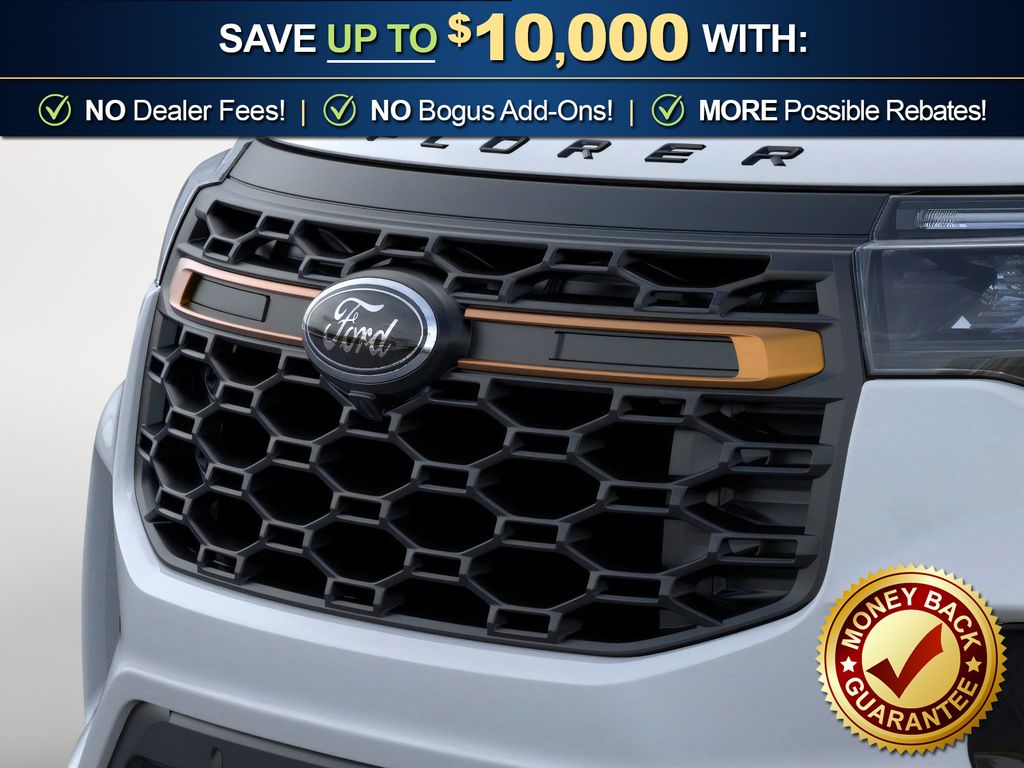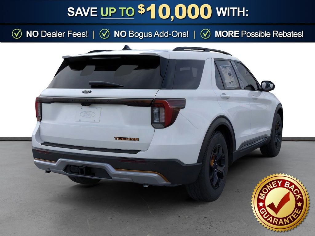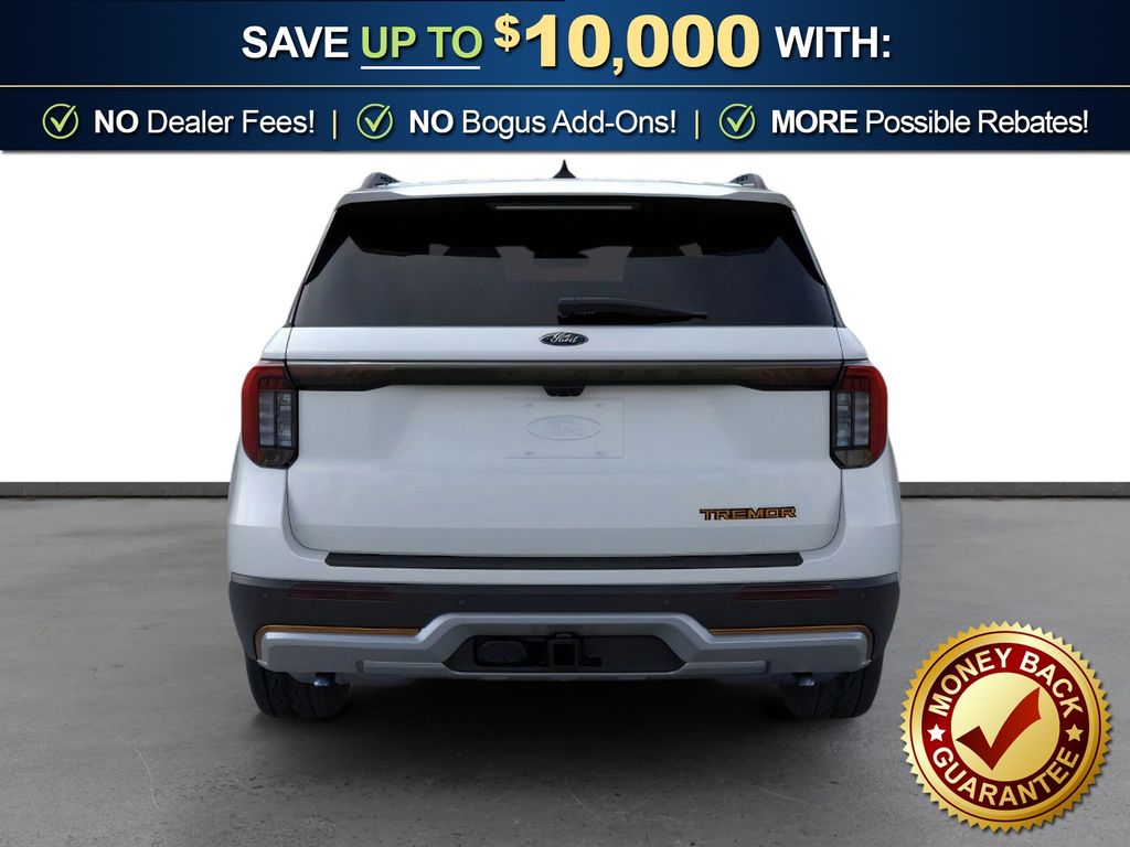 Space White Metallic 2026 Ford Explorer Tremor FCT 4WD 10-Speed Automatic 3.0L EcoBoost V6 4WD, 10 Speakers, 3rd Row PowerFold Seats, 3rd row seats: bench, 4-Wheel Disc Brakes, ABS brakes, Air Conditioning, Alloy wheels, AM/FM radio: SiriusXM with 360L, Ambient Lighting, Apple CarPlay/Android Auto, Auto High-beam Headlights, Automatic temperature control, BlueCruise Hardware, Brake assist, Bumpers: body-color, Compass, Delay-off headlights, Driver door bin, Driver vanity mirror, Dual front impact airbags, Dual front side impact airbags, Electronic Stability Control, Emergency communication system: 911 Assist, Exterior Parking Camera Rear, Four wheel independent suspension, Front anti-roll bar, Front Bucket Seats, Front Center Armrest, Front dual zone A/C, Front fog lights, Front License Plate Bracket, Front reading lights, Fully automatic headlights, Garage door transmitter, Heated door mirrors, Heated front seats, Heated rear seats, Heated steering wheel, Heated/Ventilated Miko Suede Captain's Chairs, Illuminated entry, Knee airbag, Leather steering wheel, Low tire pressure warning, Memory Driver's Seat, Multicontour Seats with Front Active Motion, Navigation System, Occupant sensing airbag, Outside temperature display, Overhead airbag, Overhead console, Panic alarm, Panoramic Fixed Glass Roof with Power Shade, Passenger door bin, Passenger vanity mirror, Power door mirrors, Power driver seat, Power Liftgate, Power passenger seat, Power steering, Power windows, Power-Folding with Autofold Side Mirrors, Radio: B&O Sound System by Bang & Olufsen, Radio: B&O Sound System by Bang and Olufsen, Rain-Sensing Wipers (front Only), Rear air conditioning, Rear anti-roll bar, Rear reading lights, Rear window defroster, Rear window wiper, Remote keyless entry, SecuriCode Keyless Entry Keypad, Security system, Speed control, Speed-sensing steering, Speed-Sensitive Wipers, Split folding rear seat, Spoiler, Sport steering wheel, Steering wheel mounted audio controls, Tachometer, Telescoping steering wheel, Tilt steering wheel, Traction control, Tremor Ultimate Package, Trip computer, Variably intermittent wipers, Ventilated front seats, Wheels: 18" High Gloss Black-Painted Aluminum, 4WD.