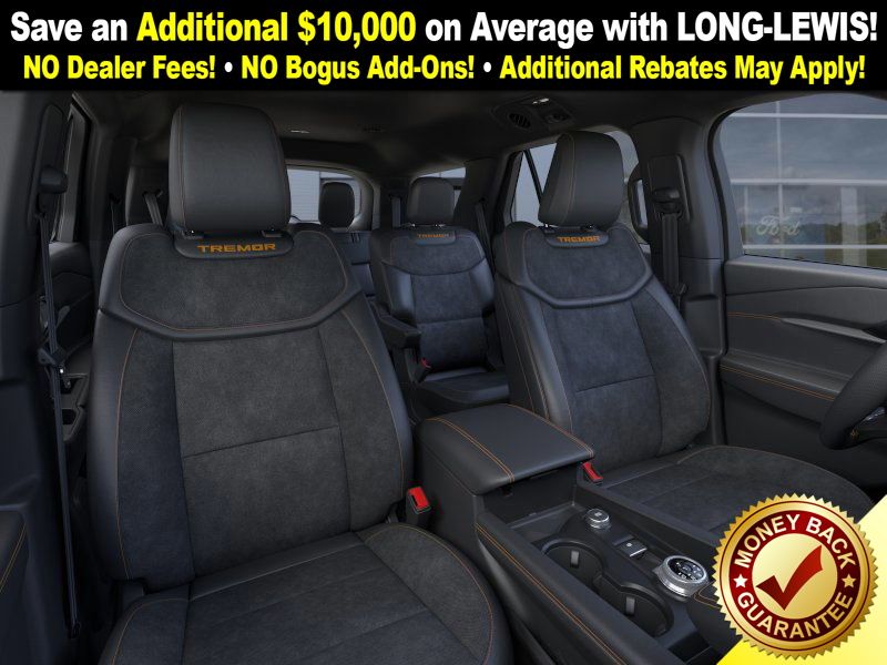 Tremor Convenience Package (3rd Row PowerFold Seats, Ambient Lighting, Auto-Dimming Interior Rear-View Mirror, Manual-Folding Sideview Mirrors, Memory Driver's Seat, and Rain-Sensing Wipers (front Only)), 4WD, 10 Speakers, 3rd row seats: bench, 4-Wheel Disc Brakes, ABS brakes, Air Conditioning, Alloy wheels, AM/FM radio: SiriusXM with 360L, Apple CarPlay/Android Auto, Auto High-beam Headlights, Automatic temperature control, Brake assist, Bumpers: body-color, Compass, Delay-off headlights, Driver door bin, Driver vanity mirror, Dual front impact airbags, Dual front side impact airbags, Electronic Stability Control, Emergency communication system: 911 Assist, Exterior Parking Camera Rear, Four wheel independent suspension, Front anti-roll bar, Front Bucket Seats, Front Center Armrest, Front dual zone A/C, Front fog lights, Front reading lights, Fully automatic headlights, Heated door mirrors, Heated front seats, Heated rear seats, Heated steering wheel, Heated/Ventilated Miko Captain's Chairs, Illuminated entry, Internet access capable: FordPass Connect 5G, Knee airbag, Leather steering wheel, Low tire pressure warning, Navigation System, Occupant sensing airbag, Outside temperature display, Overhead airbag, Overhead console, Panic alarm, Passenger door bin, Passenger vanity mirror, Power door mirrors, Power driver seat, Power Liftgate, Power passenger seat, Power steering, Power windows, Radio: B&O Sound System by Bang and Olufsen, Rear air conditioning, Rear anti-roll bar, Rear reading lights, Rear window defroster, Rear window wiper, Remote keyless entry, Security system, Speed control, Speed-sensing steering, Speed-Sensitive Wipers, Split folding rear seat, Spoiler, Sport steering wheel, Steering wheel mounted audio controls, Tachometer, Telescoping steering wheel, Tilt steering wheel, Traction control, Trip computer, Variably intermittent wipers, Ventilated front seats, and Wheels: 18" High Gloss Black-Painted Aluminum. Price includes: $1000 - Retail Customer Cash. Exp. 01/05/2026 $500 - Bonus Customer Cash. Exp. 01/05/2026