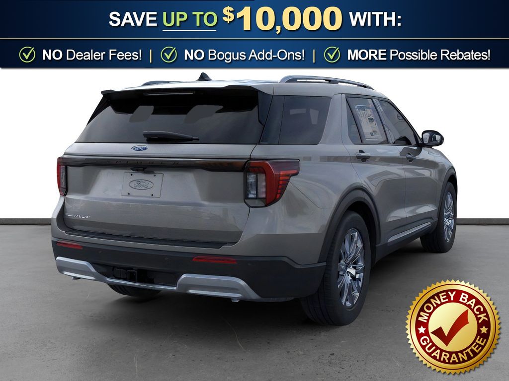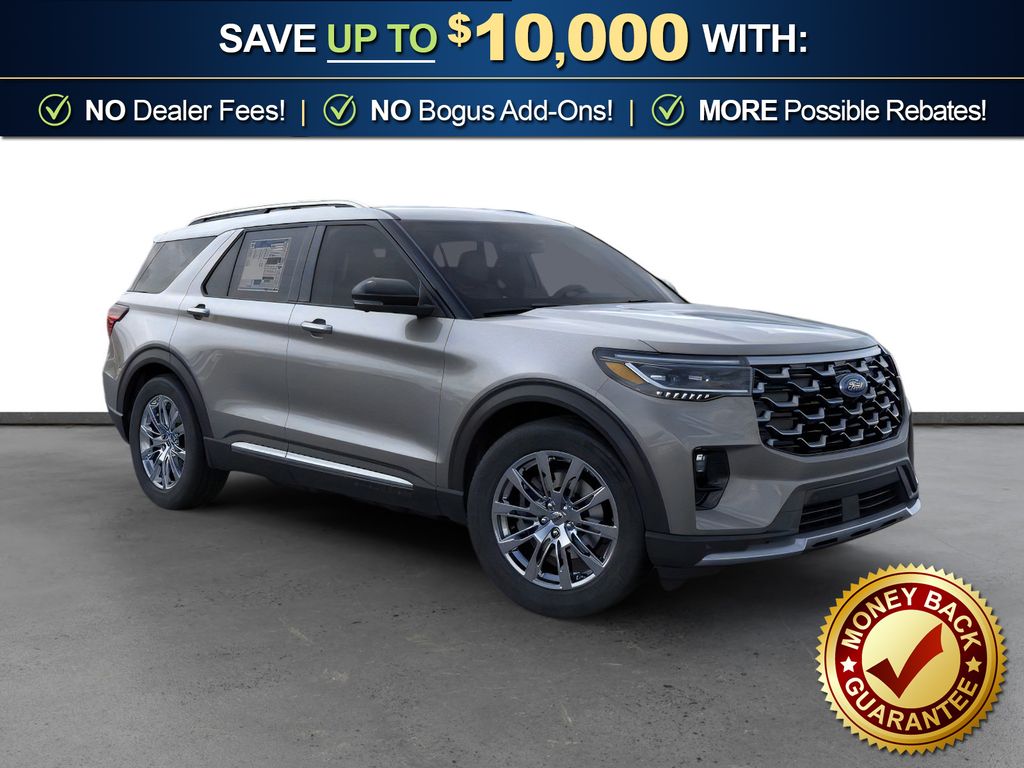 Gray Metallic 2026 Ford Explorer Platinum fctp RWD 10-Speed Automatic 2.3L EcoBoost I-4 14 Speakers, 3rd row seats: bench, 4-Wheel Disc Brakes, ABS brakes, ActiveX Trimmed Captain's Chairs, Air Conditioning, Alloy wheels, AM/FM radio: SiriusXM with 360L, Apple CarPlay/Android Auto, Auto High-beam Headlights, Auto-dimming door mirrors, Auto-dimming Rear-View mirror, Automatic temperature control, Brake assist, Bumpers: body-color, Compass, Delay-off headlights, Driver door bin, Driver vanity mirror, Dual front impact airbags, Dual front side impact airbags, Electronic Stability Control, Emergency communication system: 911 Assist, Equipment Group 600A Standard Package, Exterior Parking Camera Rear, Four wheel independent suspension, Front anti-roll bar, Front Bucket Seats, Front Center Armrest, Front dual zone A/C, Front fog lights, Front License Plate Bracket, Front reading lights, Fully automatic headlights, Garage door transmitter, Heated door mirrors, Heated front seats, Heated rear seats, Heated steering wheel, Illuminated entry, Knee airbag, Leather steering wheel, Low tire pressure warning, Memory seat, Navigation System, Occupant sensing airbag, Outside temperature display, Overhead airbag, Overhead console, Panic alarm, Panoramic Fixed Glass Roof with Power Shade, Passenger door bin, Passenger vanity mirror, Power door mirrors, Power driver seat, Power Liftgate, Power passenger seat, Power steering, Power windows, Radio data system, Radio: B&O Sound System by Bang & Olufsen with HD, Rain sensing wipers, Rear air conditioning, Rear anti-roll bar, Rear reading lights, Rear window defroster, Rear window wiper, Remote keyless entry, SecuriCode Keyless Entry Keypad, Security system, Speed control, Speed-sensing steering, Speed-Sensitive Wipers, Split folding rear seat, Spoiler, Steering wheel mounted audio controls, Tachometer, Telescoping steering wheel, Tilt steering wheel, Traction control, Trip computer, Turn signal indicator mirrors, Variably intermittent wipers, Ventilated front seats, Wheels: 20" Luster Nickel-Painted Aluminum.