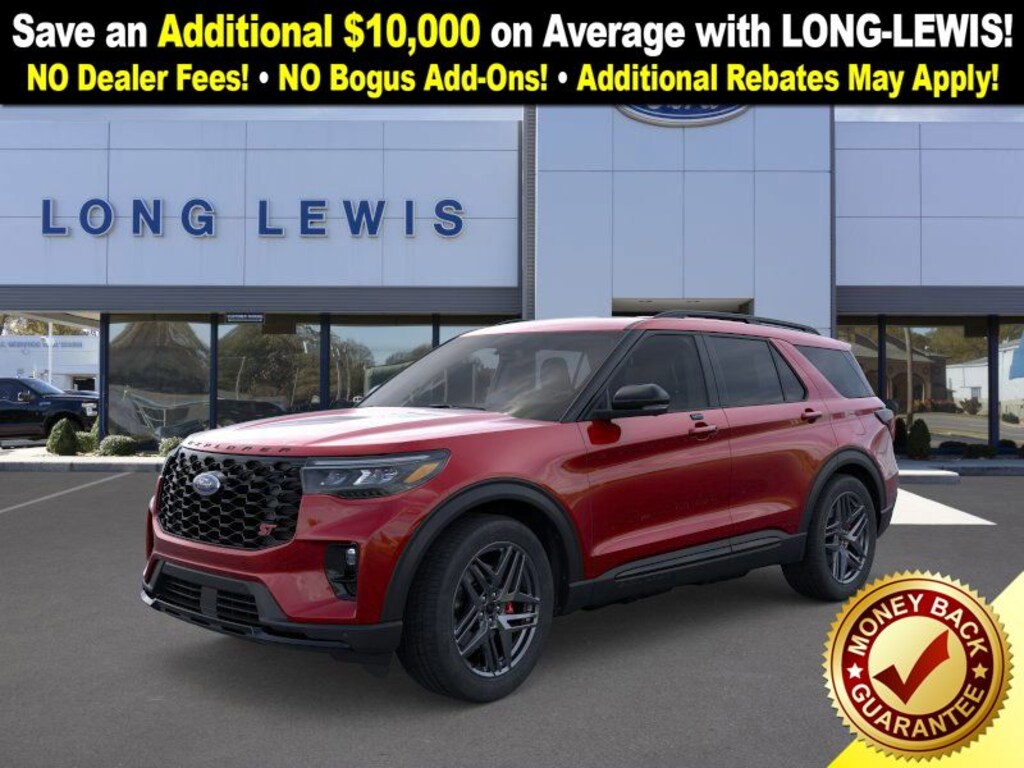 Rapid Red Metallic Tinted Clearcoat 2026 Ford Explorer ST fctp 4WD 10-Speed Automatic 3.0L EcoBoost V6 4WD, 10 Speakers, 3rd row seats: bench, 4-Wheel Disc Brakes, ABS brakes, Air Conditioning, Alloy wheels, AM/FM radio: SiriusXM with 360L, Apple CarPlay/Android Auto, Auto High-beam Headlights, Auto-dimming door mirrors, Auto-dimming Rear-View mirror, Automatic temperature control, Brake assist, Bumpers: body-color, Compass, Delay-off headlights, Driver door bin, Driver vanity mirror, Dual front impact airbags, Dual front side impact airbags, Electronic Stability Control, Emergency communication system: 911 Assist, Exterior Parking Camera Rear, Four wheel independent suspension, Front anti-roll bar, Front Bucket Seats, Front Center Armrest, Front dual zone A/C, Front fog lights, Front License Plate Bracket, Front reading lights, Fully automatic headlights, Garage door transmitter, Heated door mirrors, Heated front seats, Heated rear seats, Heated steering wheel, Heated/Ventilated Miko Captain's Chairs, Illuminated entry, Knee airbag, Leather steering wheel, Low tire pressure warning, Memory seat, Navigation System, Occupant sensing airbag, Outside temperature display, Overhead airbag, Overhead console, Panic alarm, Passenger door bin, Passenger vanity mirror, Power door mirrors, Power driver seat, Power Liftgate, Power passenger seat, Power steering, Power windows, Radio: B&O Sound System by Bang & Olufsen, Rain sensing wipers, Rear air conditioning, Rear anti-roll bar, Rear reading lights, Rear window defroster, Rear window wiper, Remote Control Front Windows, Remote keyless entry, SecuriCode Keyless Entry Keypad, Security system, Speed control, Speed-sensing steering, Speed-Sensitive Wipers, Split folding rear seat, Spoiler, Sport steering wheel, Steering wheel mounted audio controls, Sun and Sound Package, Tachometer, Telescoping steering wheel, Tilt steering wheel, Traction control, Trip computer, Turn signal indicator mirrors, Variably intermittent wipers, Ventilated front seats, Wheels: 21" Magnetite-Painted Aluminum, 4WD.