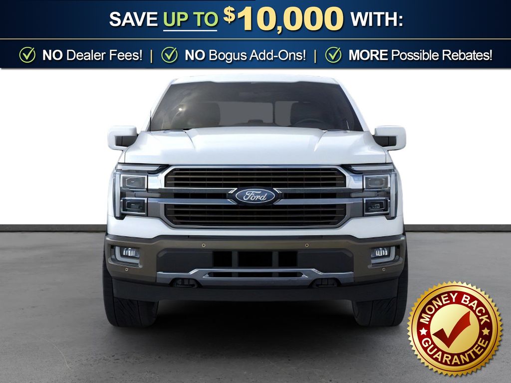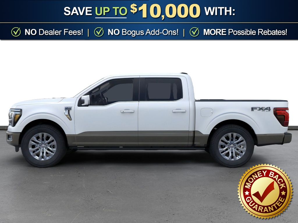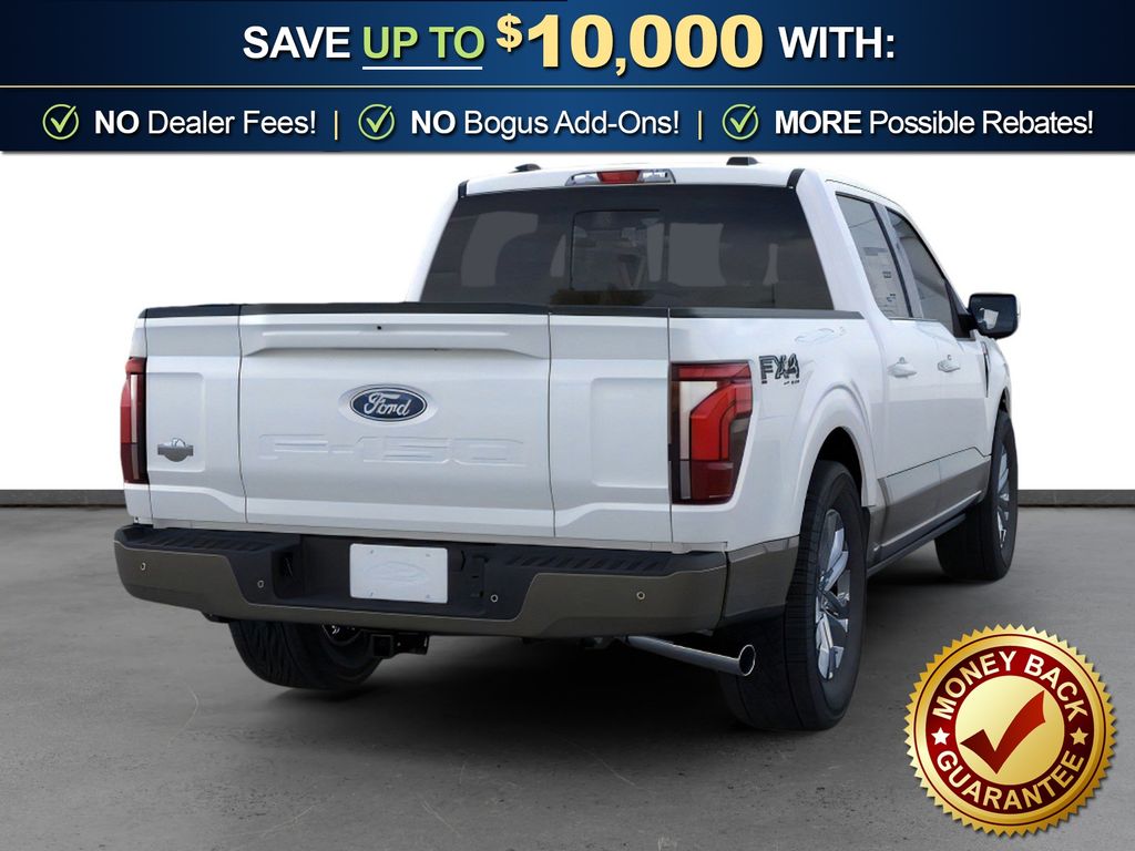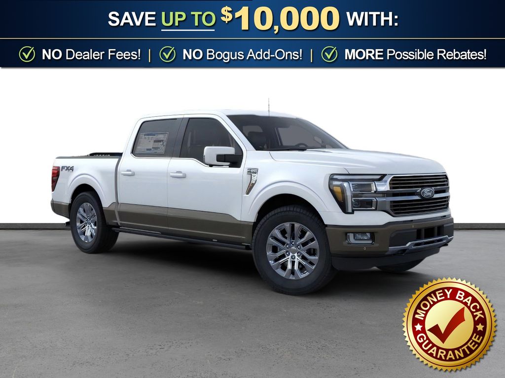 Dealer Discount of $4,263 off MSRP Star White Metallic Tri-Coat 2026 Ford F-150 King Ranch NFT 4WD 10-Speed Automatic 3.5L V6 EcoBoost 4WD, 4-Wheel Disc Brakes, 4x4 FX4 Off-Road Bodyside Decal, 8 Speakers, ABS brakes, Adjustable pedals, Air Conditioning, Alloy wheels, AM/FM radio: SiriusXM with 360L, Auto High-beam Headlights, Auto tilt-away steering wheel, Auto-dimming door mirrors, Auto-dimming Rear-View mirror, Automatic temperature control, Brake assist, Chrome wheels, Compass, Delay-off headlights, Driver door bin, Driver vanity mirror, Driver's Side SecuriCode Keyless-Entry Keypad, Dual front impact airbags, Dual front side impact airbags, Electronic Locking with 3.55 Axle Ratio, Electronic Stability Control, Emergency communication system: SYNC 4 911 Assist, Ford Connectivity Package (1-Year Included), Front anti-roll bar, Front Bucket Seats, Front Center Armrest, Front dual zone A/C, Front fog lights, Front License Plate Bracket, Front reading lights, Front wheel independent suspension, Fully automatic headlights, FX4 Off-Road Package, Garage door transmitter, Genuine wood dashboard insert, GVWR: 7,400 lbs Payload Package, Head-Up Display, Heated door mirrors, Heated front seats, Heated rear seats, Heated steering wheel, Hill Descent Control, Illuminated entry, Internet access capable: 5G Modem - Ford Connectivity Package, King Ranch Multicontour Leather Bucket Seats, Leather steering wheel, Low tire pressure warning, Memory seat, Navigation system: Connected Navigation, Occupant sensing airbag, Off-Road Tuned Front Shock Absorbers, Outside temperature display, Overhead airbag, Overhead console, Panic alarm, Passenger door bin, Passenger vanity mirror, Pedal memory, Power door mirrors, Power driver seat, Power passenger seat, Power steering, Power windows, Pro Access Tailgate, Radio data system, Radio: B&O Sound System by Bang and Olufsen, Rain sensing wipers, Rear reading lights, Rear seat center armrest, Rear step bumper, Rear window defroster, Remote keyless entry, Security system, Speed control, Split folding rear seat, Steering wheel memory, Steering wheel mounted audio controls, SYNC 4 with Enhanced Voice Recognition, Tachometer, Telescoping steering wheel, Tilt steering wheel, Traction control, Trip computer, Turn signal indicator mirrors, Twin Panel Moonroof, Variably intermittent wipers, Ventilated front seats, Wheels: 20" Chrome-Like PVD, 4WD.