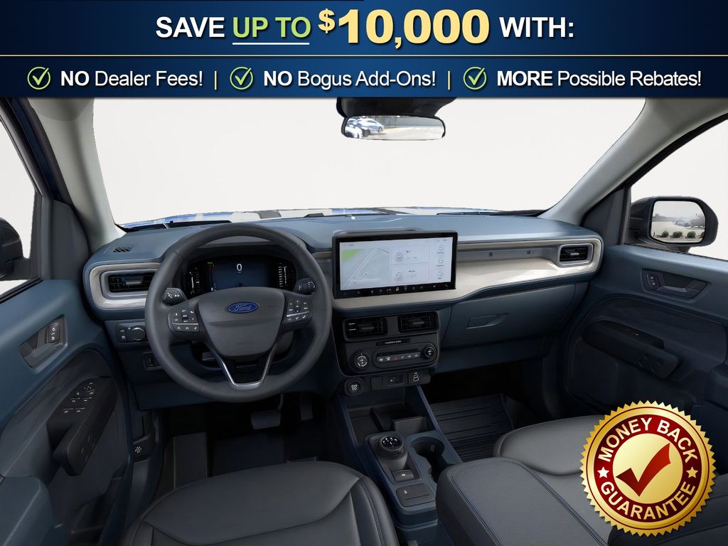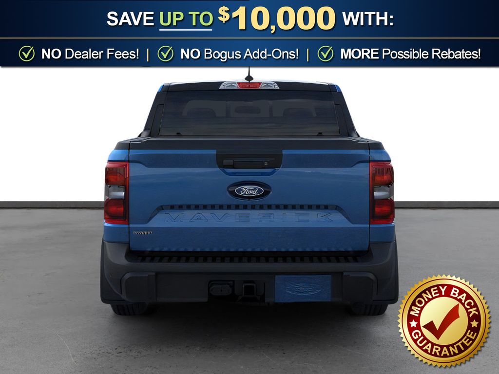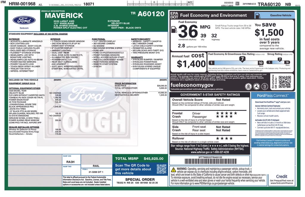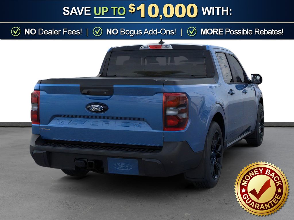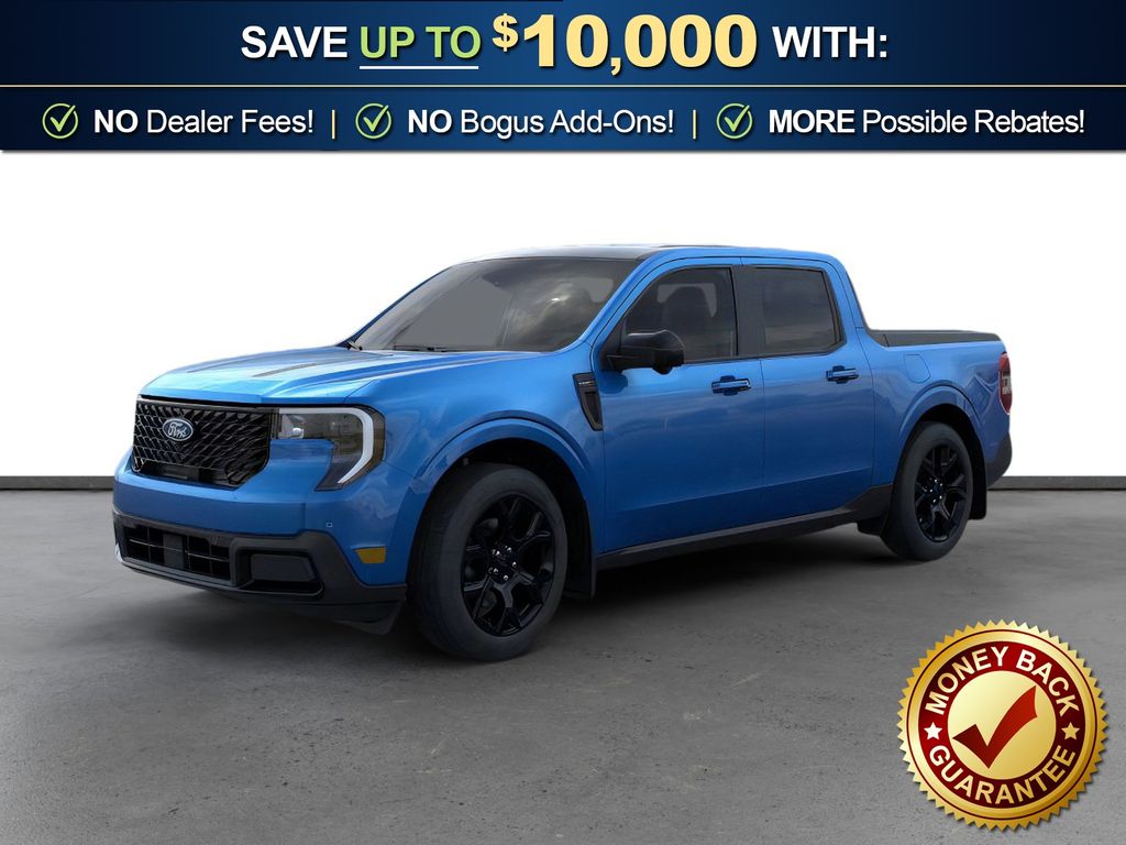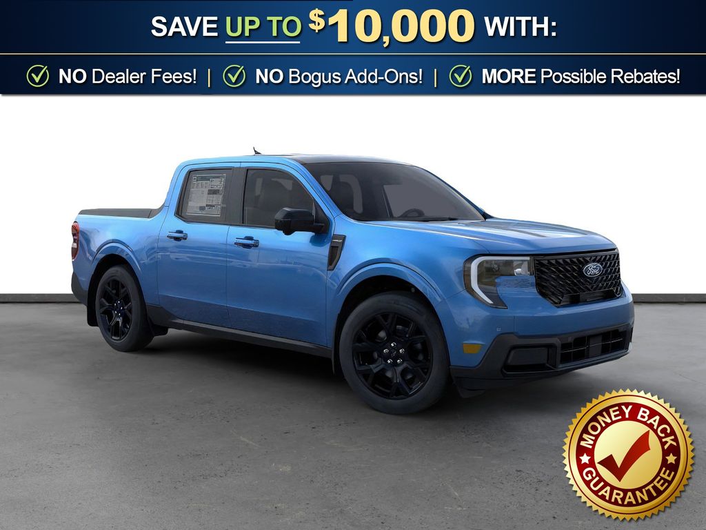 Velocity Blue 2026 Ford Maverick Lariat NFT AWD CVT 2.5L I-4 Hybrid 2.5L I-4 Hybrid, 2.91 Axle Ratio, 4-Wheel Disc Brakes, 4K Tow Package, 8 Speakers, ABS brakes, ActiveX Trimmed Heated Front Bucket Seats, Air Conditioning, Alloy wheels, AM/FM radio: SiriusXM with 360L, Apple CarPlay/Android Auto, Auto High-beam Headlights, Automatic temperature control, Black Appearance Package, Black Grille, Black Interior Accents, Brake assist, Bumpers: body-color, Compass, Delay-off headlights, Driver door bin, Driver vanity mirror, Dual front impact airbags, Dual front side impact airbags, Electronic Stability Control, Emergency communication system: SYNC 4 911 Assist, Exterior Parking Camera Rear, Ford Connectivity Package (1-Year Included), Four wheel independent suspension, Front and Rear Floor Liners Without Carpet Mats, Front and Rear Molded Splash Guards (4-Piece), Front anti-roll bar, Front Bucket Seats, Front Center Armrest, Front dual zone A/C, Front reading lights, Fully automatic headlights, Heated door mirrors, Heated front seats, Heated steering wheel, Illuminated entry, Internet access capable: 5G Modem - Ford Connectivity Package, Knee airbag, Low tire pressure warning, Navigation system: Connected Navigation, Occupant sensing airbag, Outside temperature display, Overhead airbag, Overhead console, Panic alarm, Passenger door bin, Passenger vanity mirror, Power door mirrors, Power driver seat, Power Moonroof, Power steering, Power windows, Power-Sliding Rear Window, Radio data system, Radio: B&O Sound System by Bang and Olufsen, Rear anti-roll bar, Rear seat center armrest, Rear step bumper, Remote keyless entry, Security system, SiriusXM with 360L, Speed control, Speed-sensing steering, Steering wheel mounted audio controls, SYNC 4 with Enhanced Voice Recognition, Telescoping steering wheel, Tilt steering wheel, Tonneau Pickup Box Cover - Hard Trifold, Traction control, Trailer Brake Controller, Trailer Hitch (class III) 2" Receiver, Trip computer, Upgraded Cooling Fan, Wheels: 19" Black Painted Aluminum, Wheels: 19" Machined Aluminum Painted, 2.5L I-4 Hybrid.